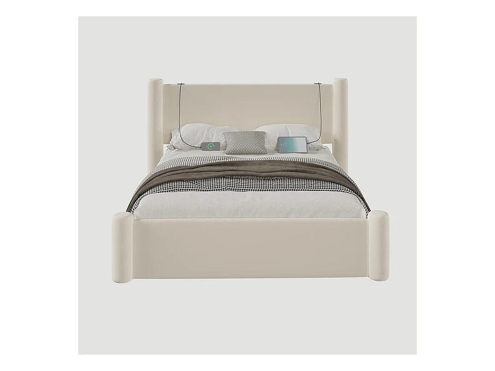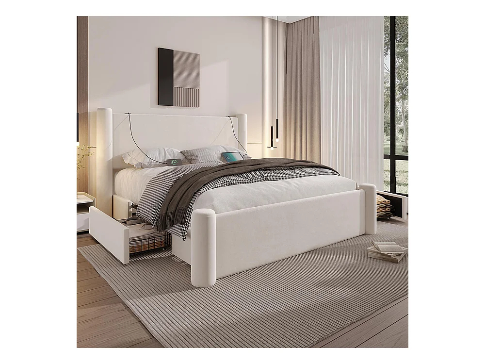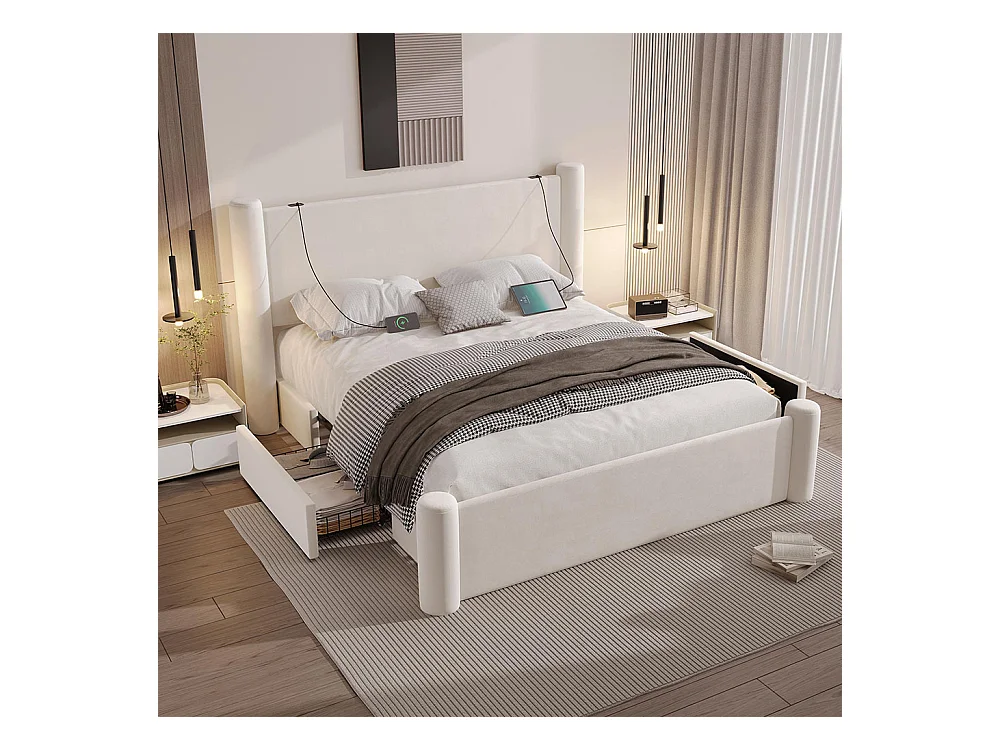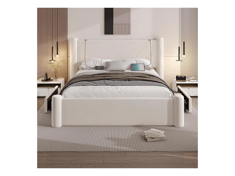 Lit avec tiroir 160x200 au design moderne design à colonnes 3D tête de lit rembourrée 2 tiroirs de rangement et ports USB intégrés beige
