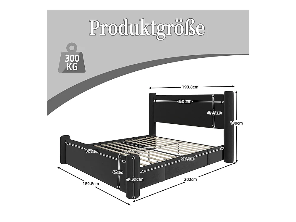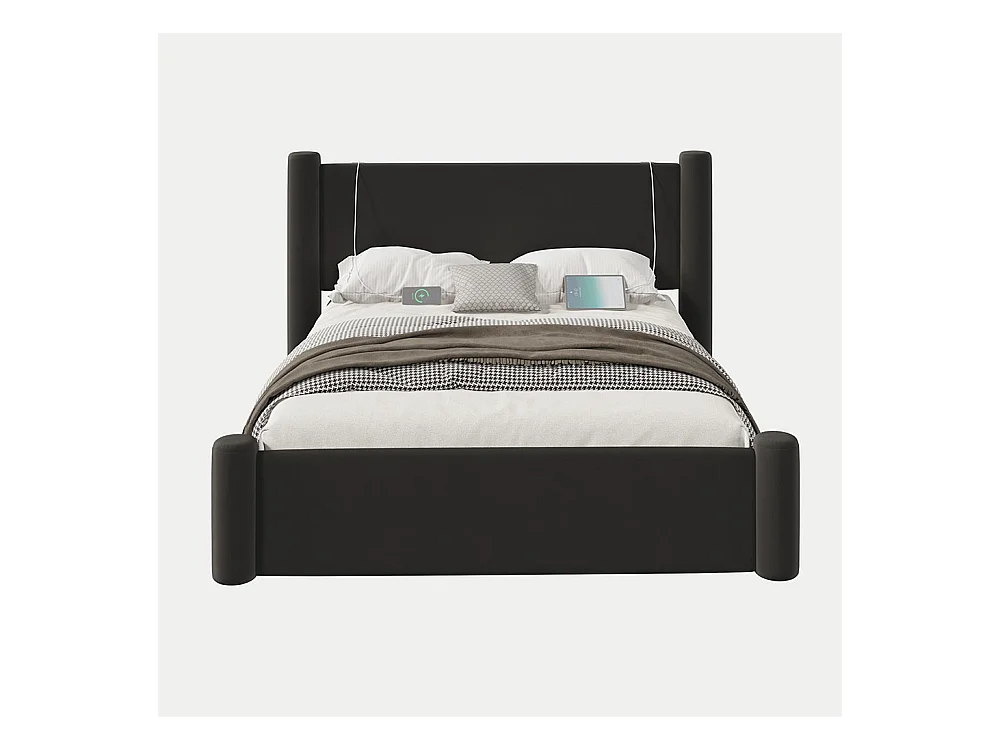 Lit avec tiroir 160x200 au design moderne design à colonnes 3D tête de lit rembourrée 2 tiroirs de rangement et ports USB intégrés noir
