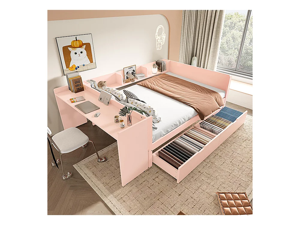 Lit avec tiroir Lit combiné 140x200 cm avec bureau équipé de 2 tiroirs lit double avec étagères pin+panneau de particules Rose
