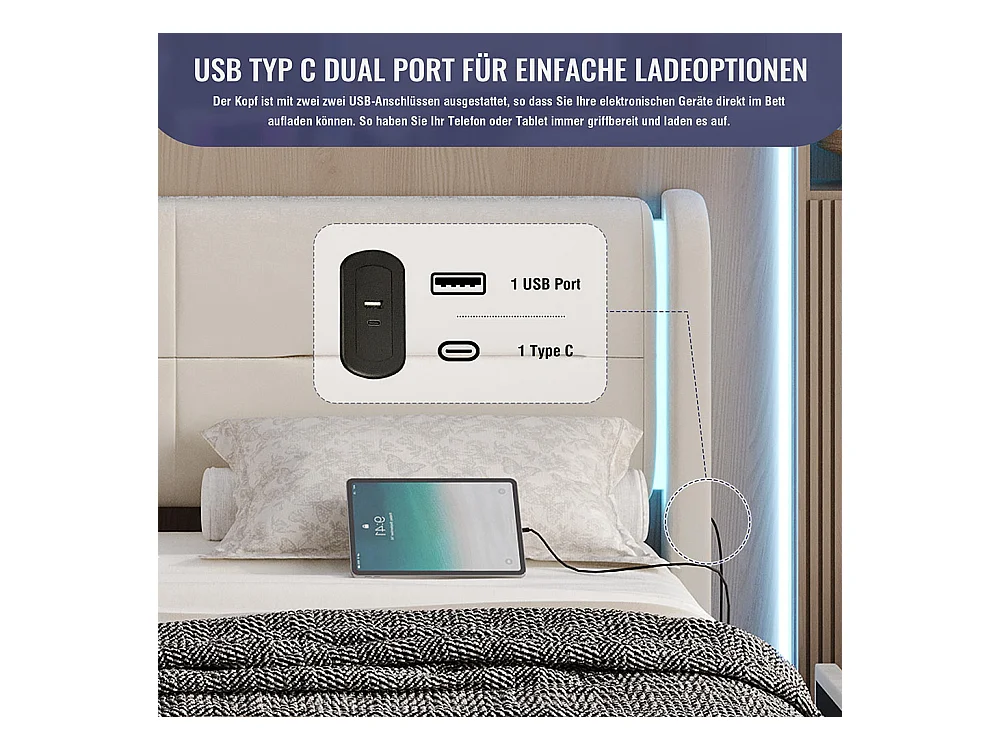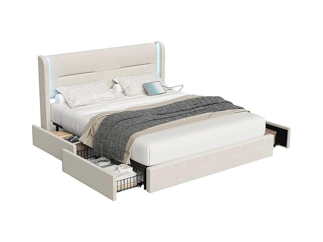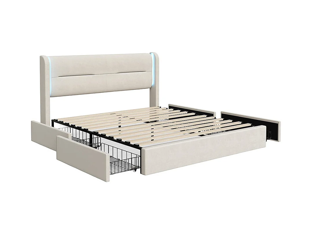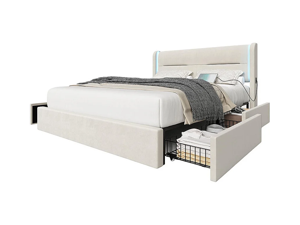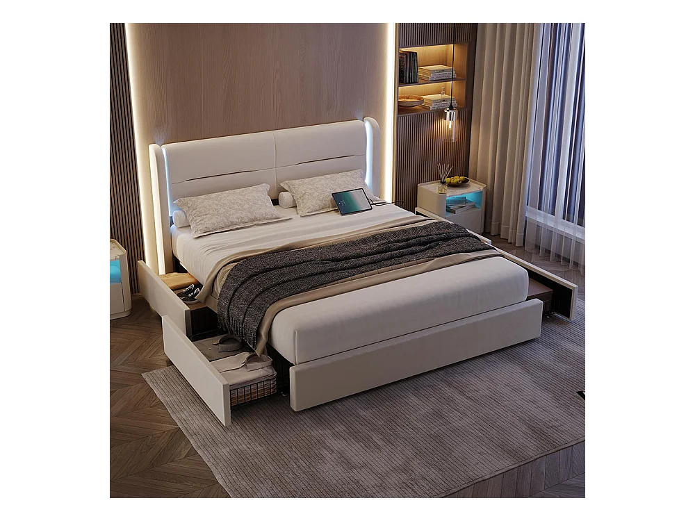 Lit avec tiroir moderne 160x200 avec éclairage LED dans la tête de lit 4 tiroirs de rangement pratiques double port USB beige