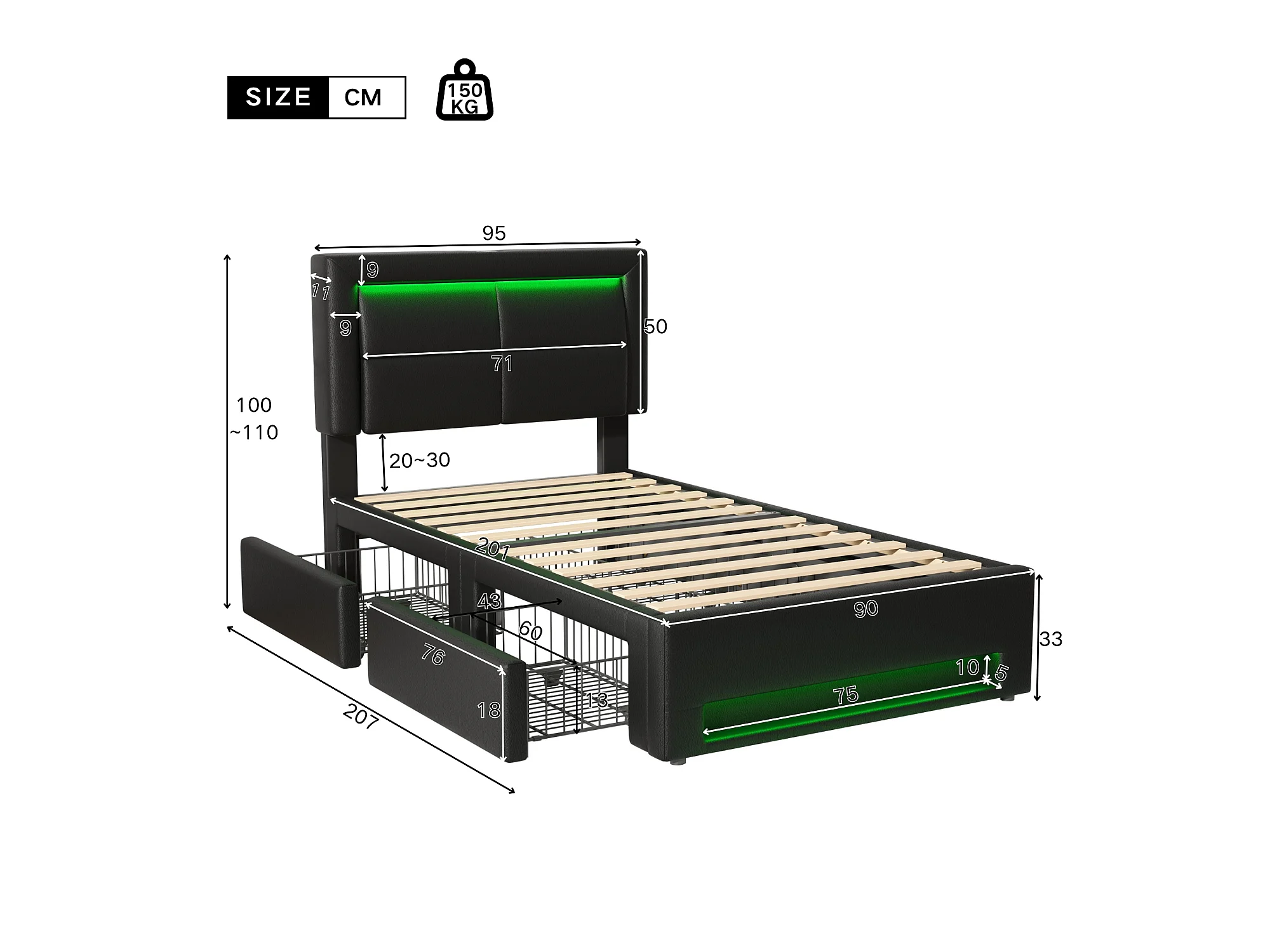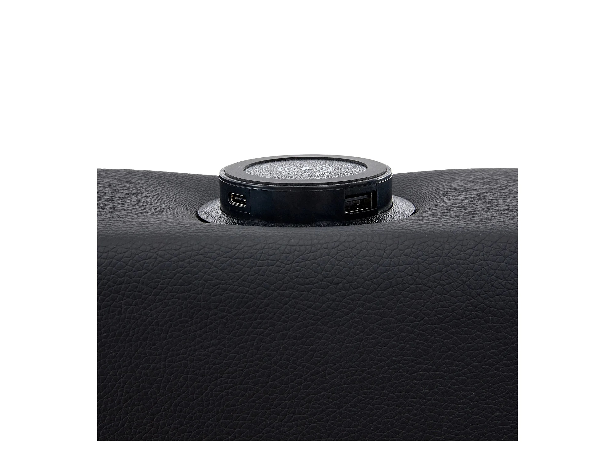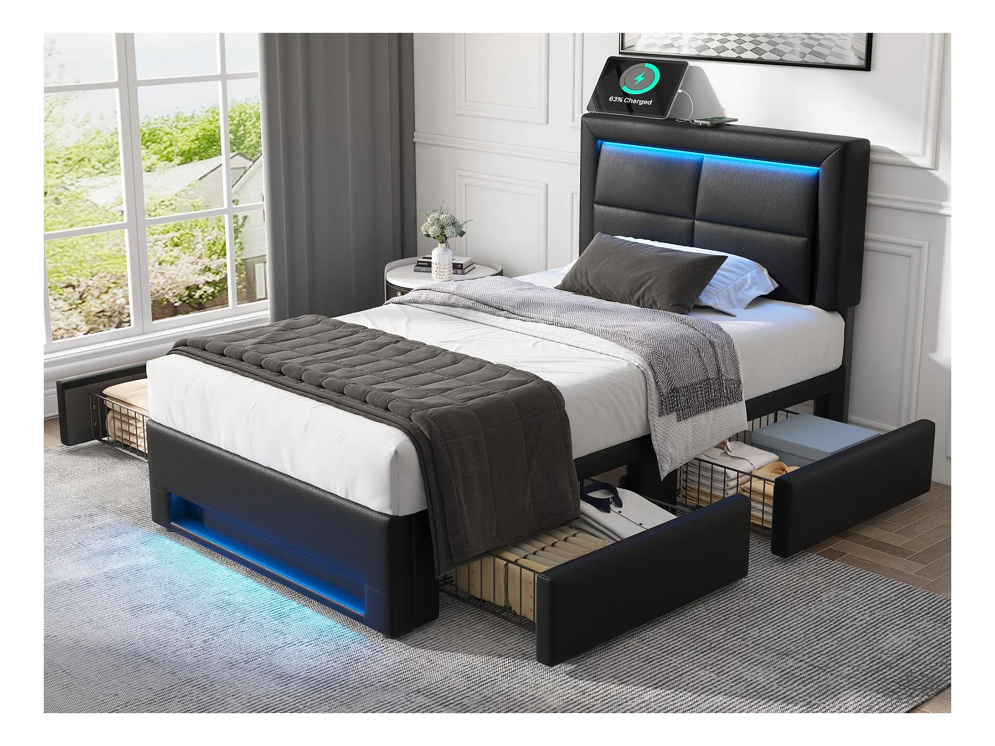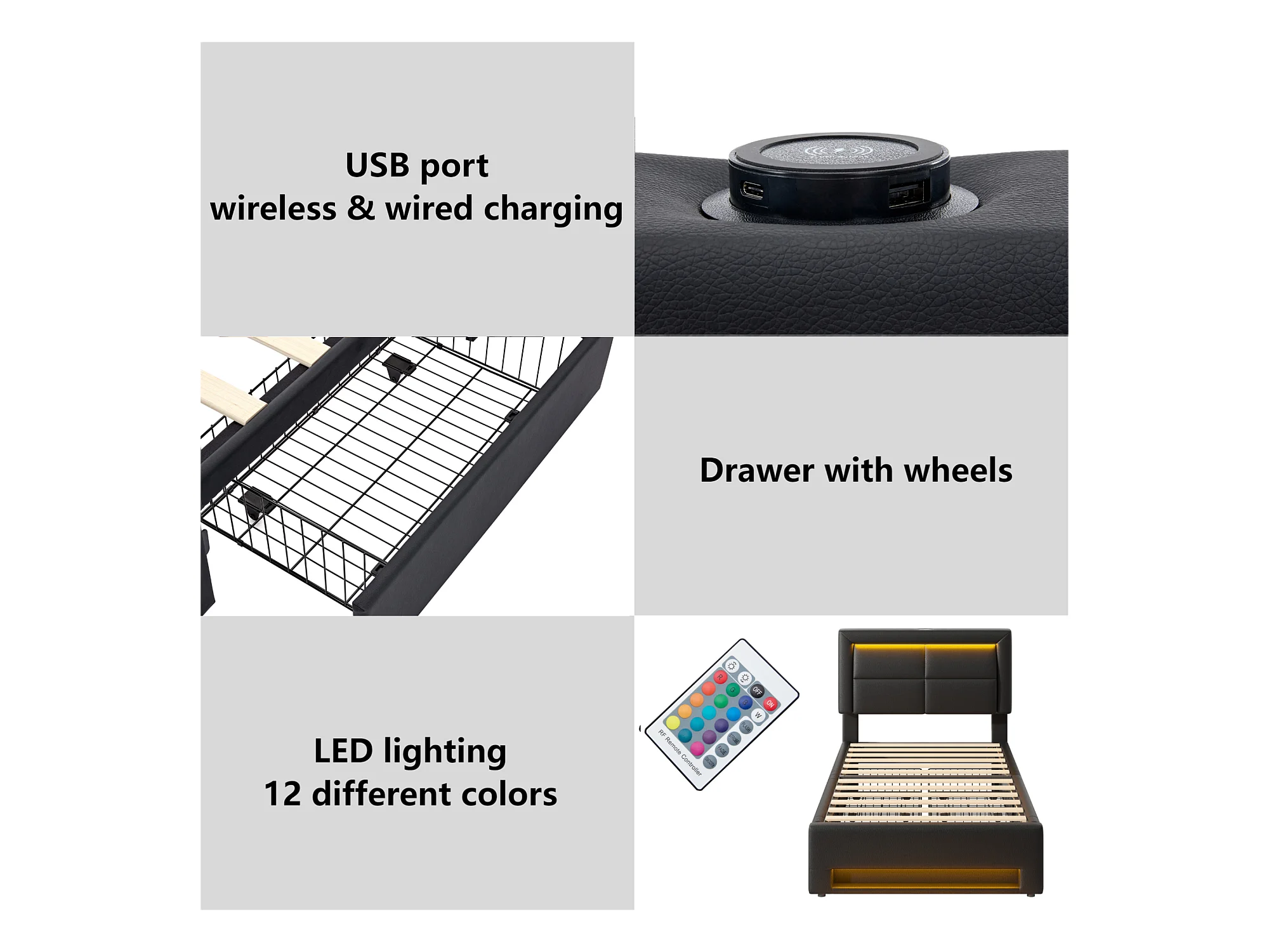 Lit avec tiroirs 90x200 cm en similicuir - avec LED et ports de recharge (filaire & sans fil) - Noir