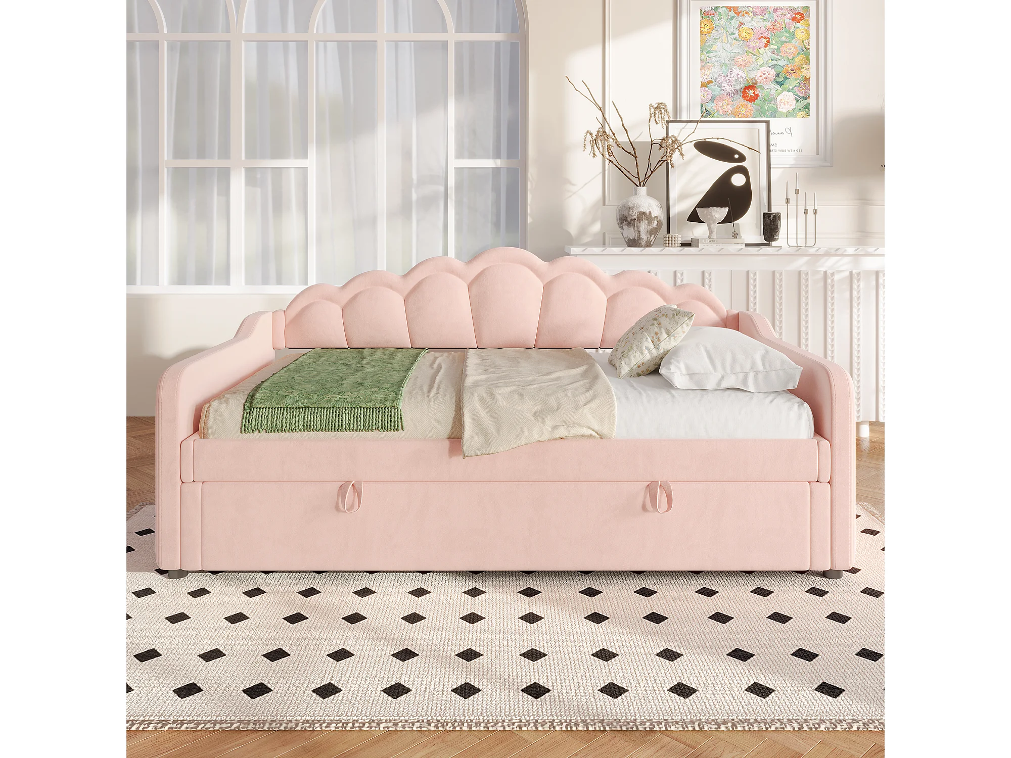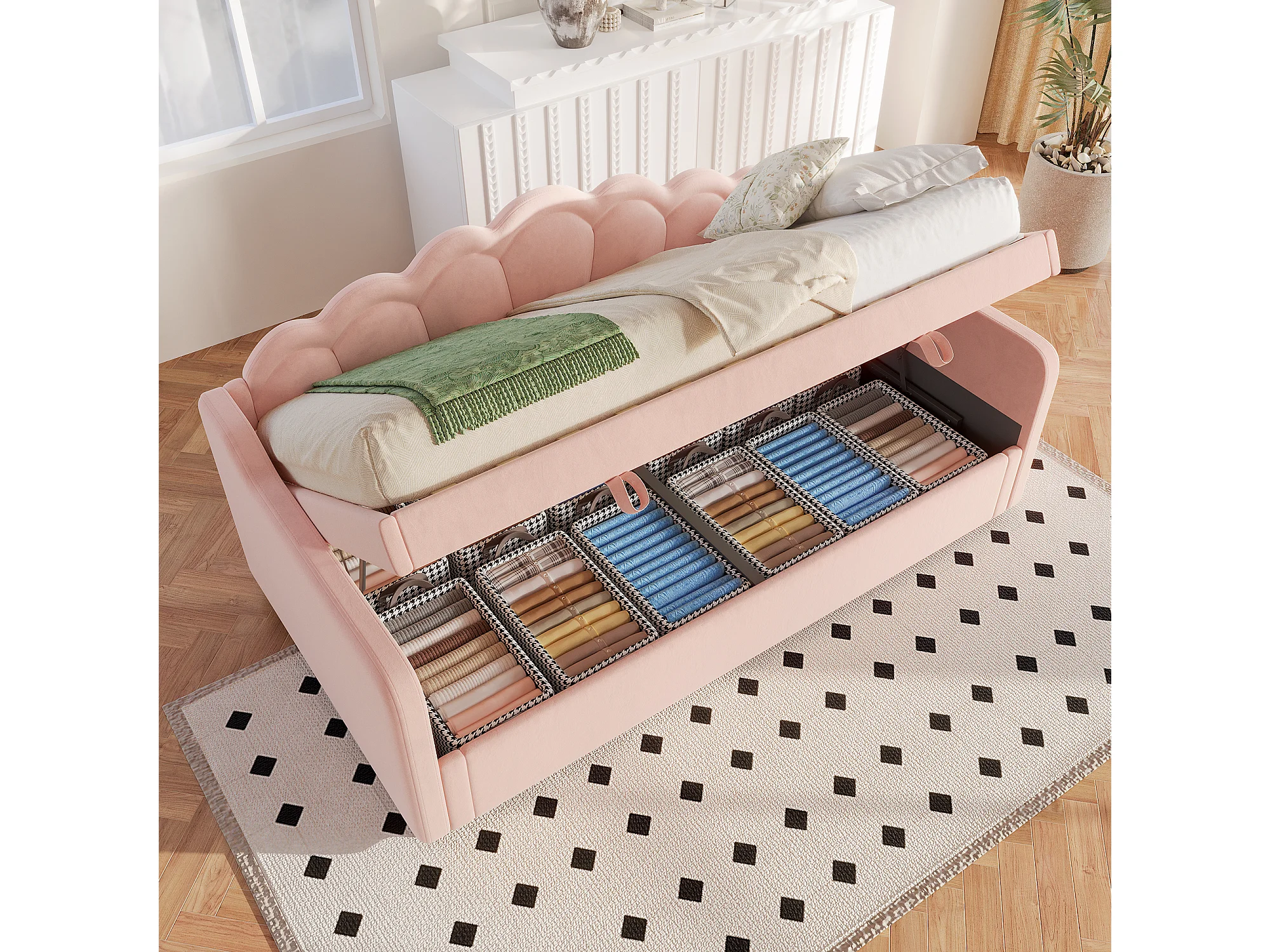 Lit avec tiroirs de rangement, canapé-lit hydraulique, 90x200cm, en velours, avec LED changeant de couleur, rose (214x98x87 cm)