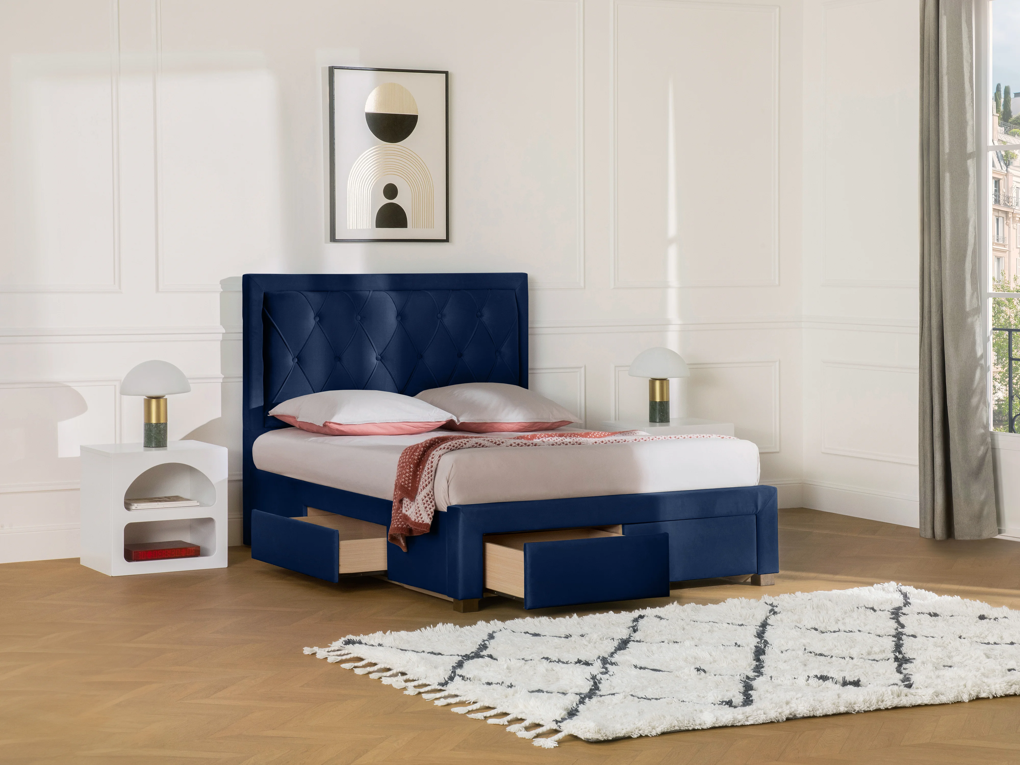 Lit avec tiroirs 160 x 200 cm - Tissu velours bleu - LEOPOLD