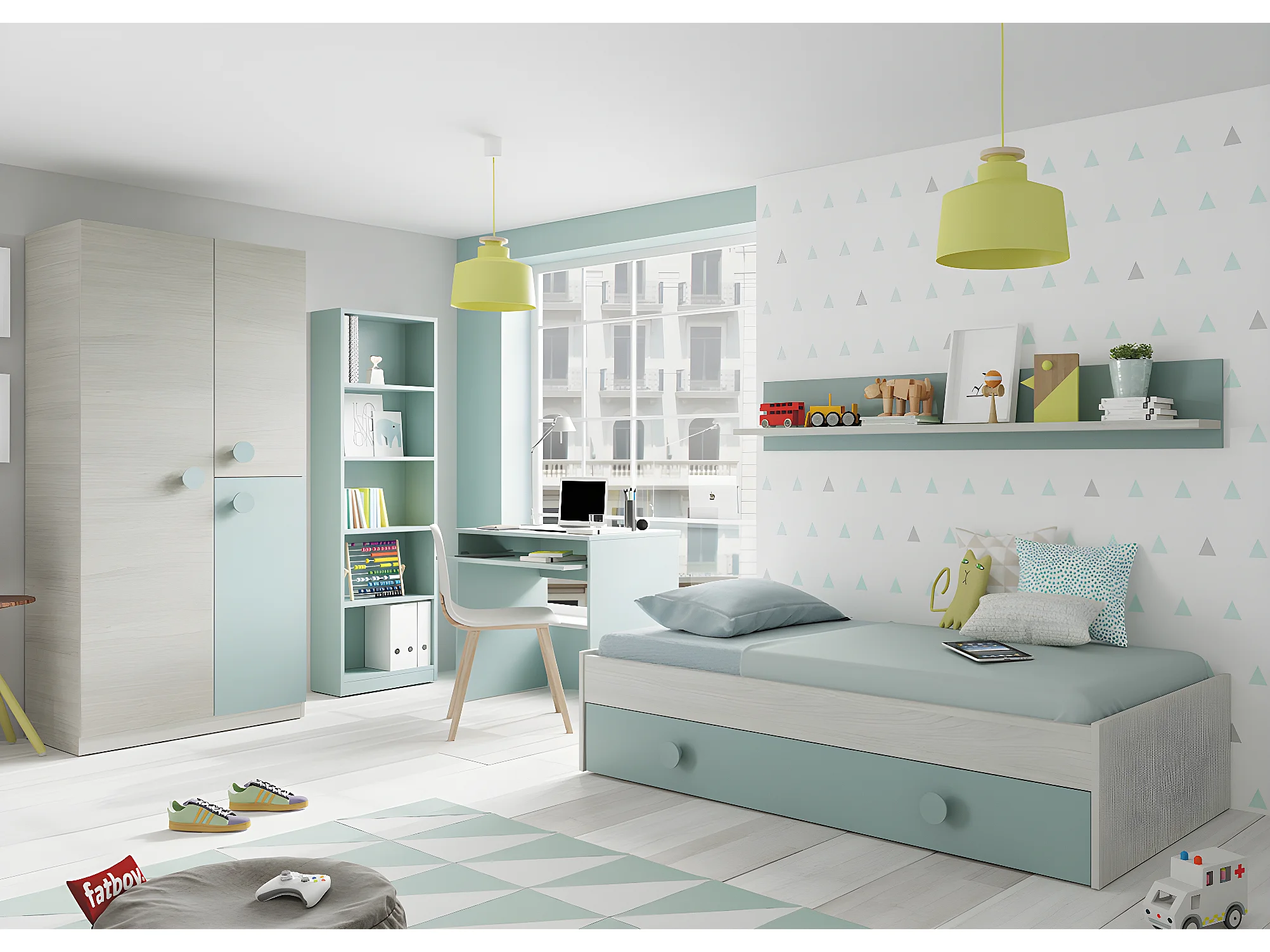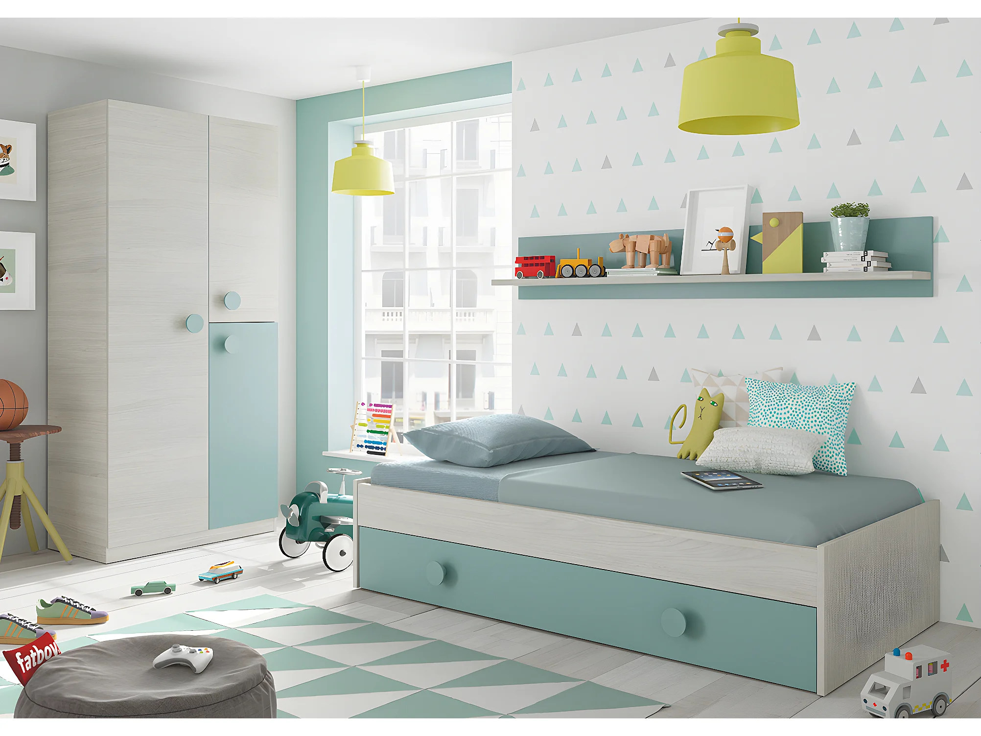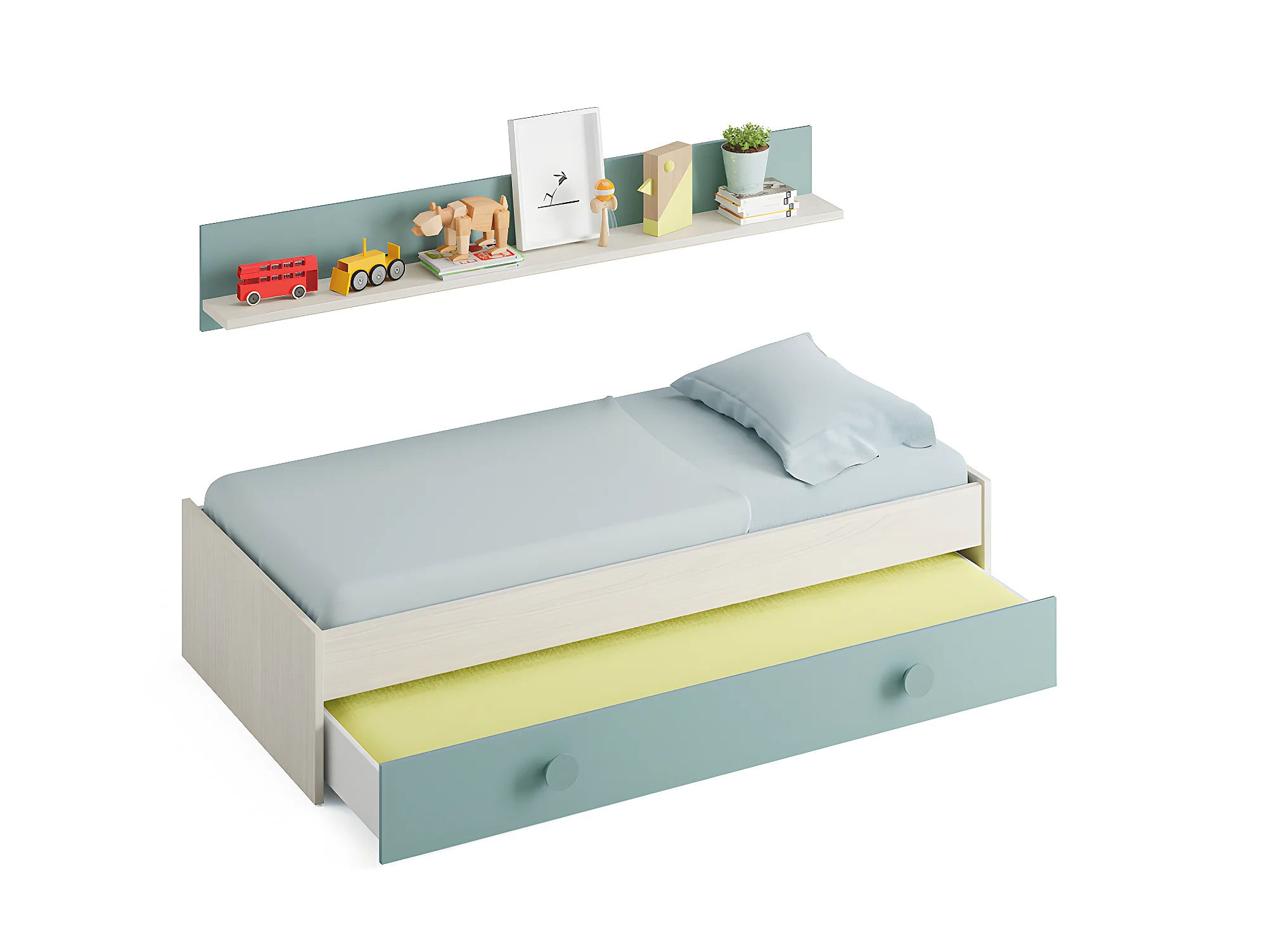 Lit avec un tiroir coloris Blanc Alpes / vert Acqua en mélamine - Dim : 43 x 201 x 98 cm