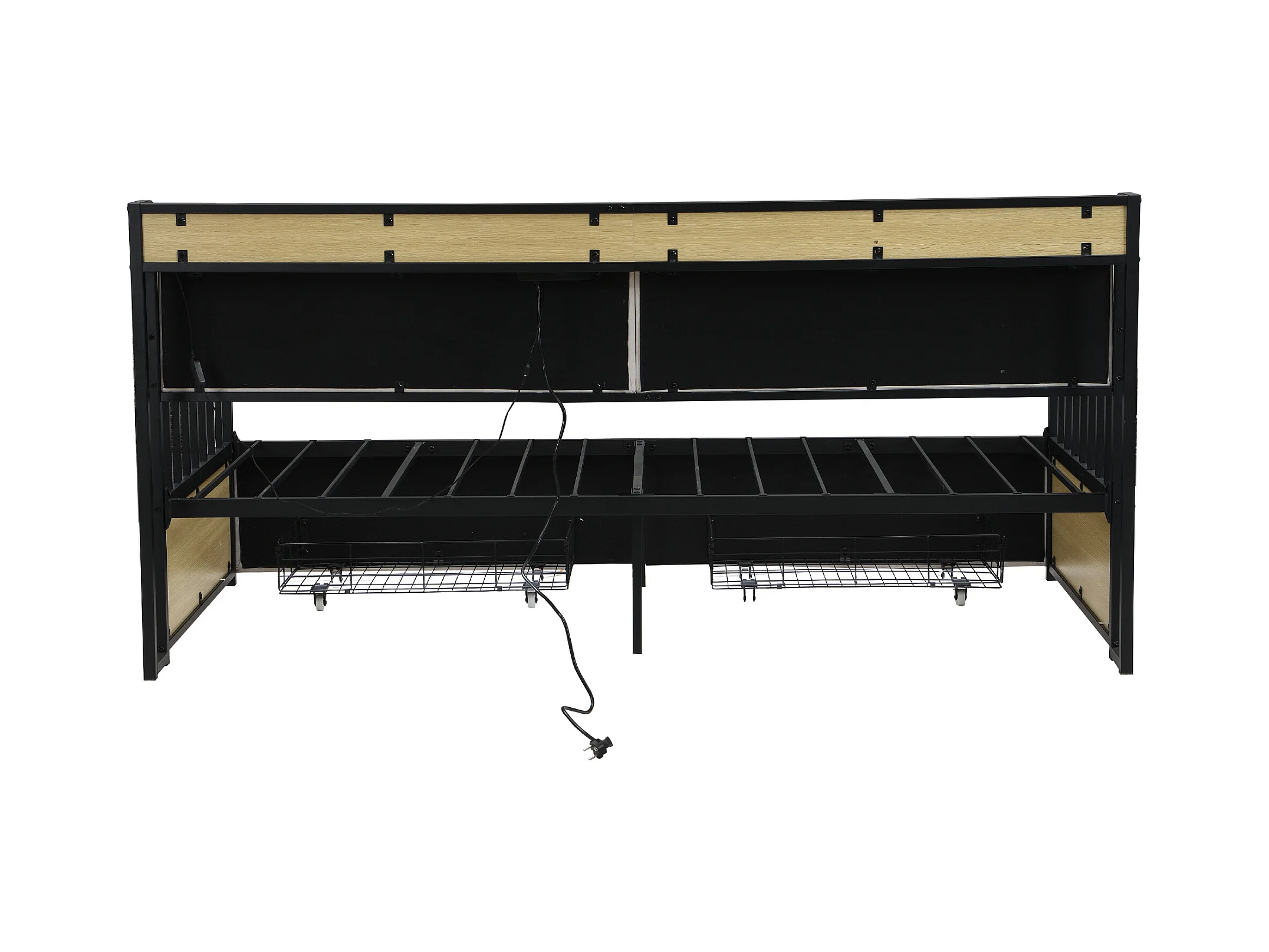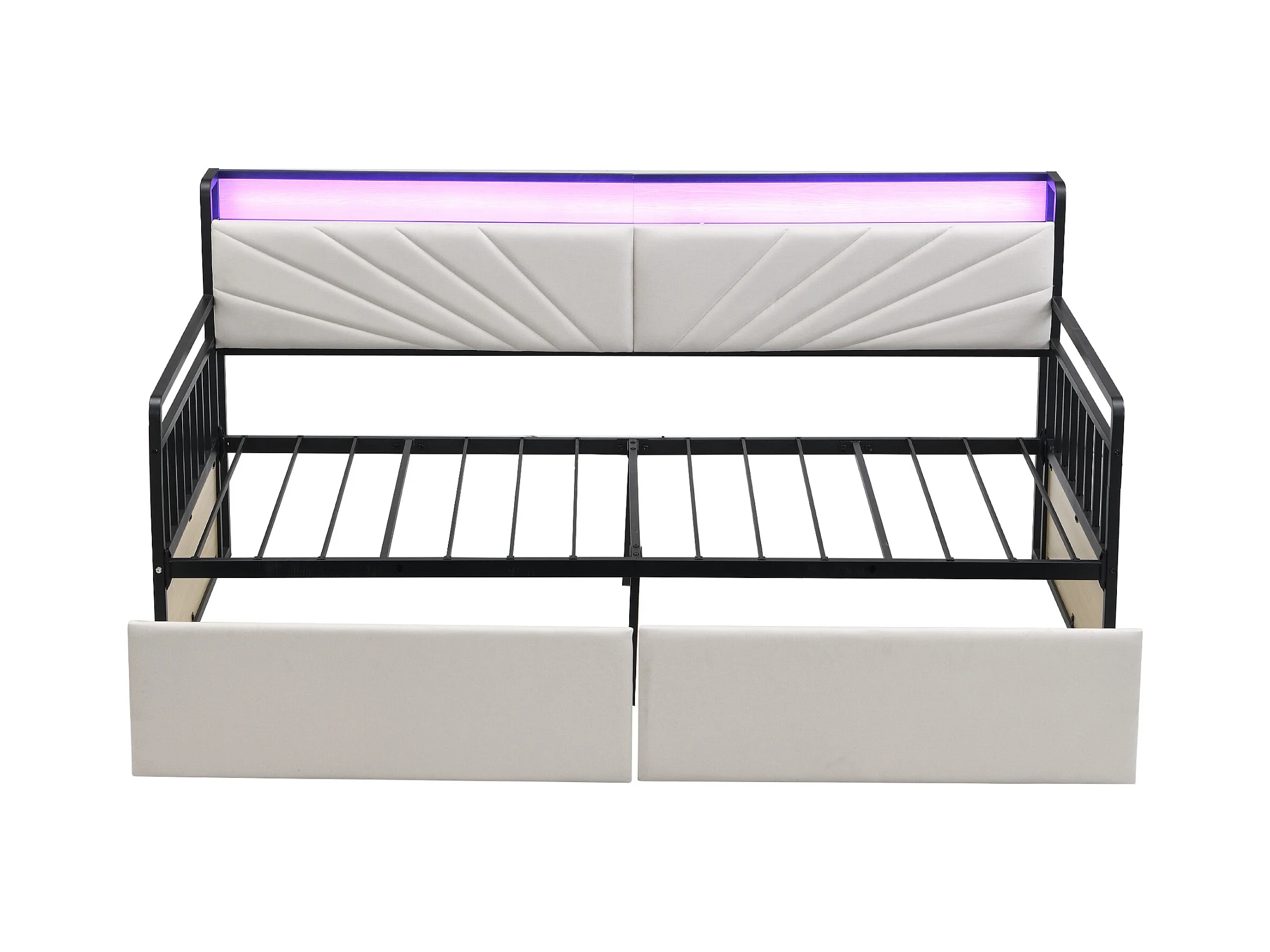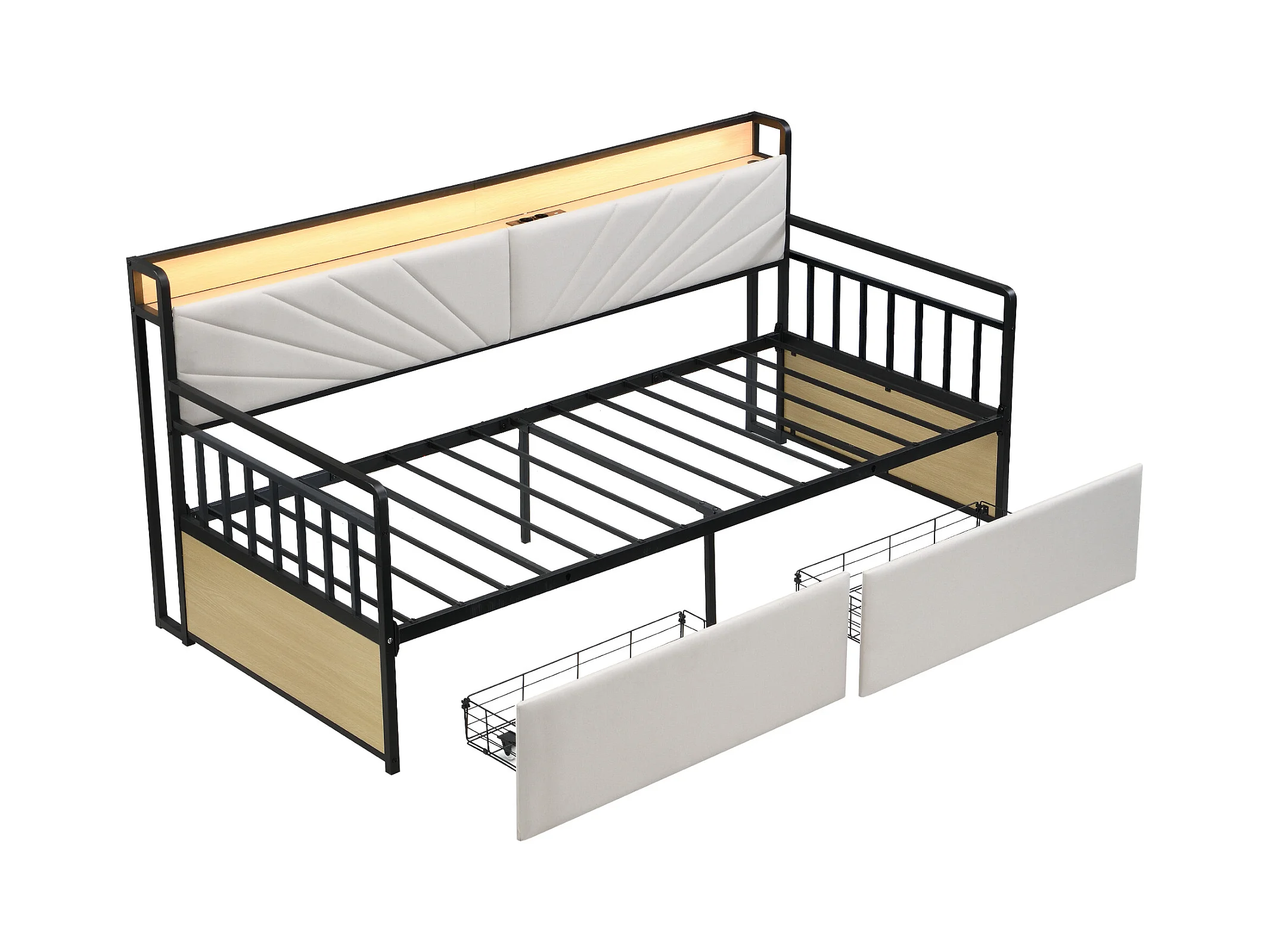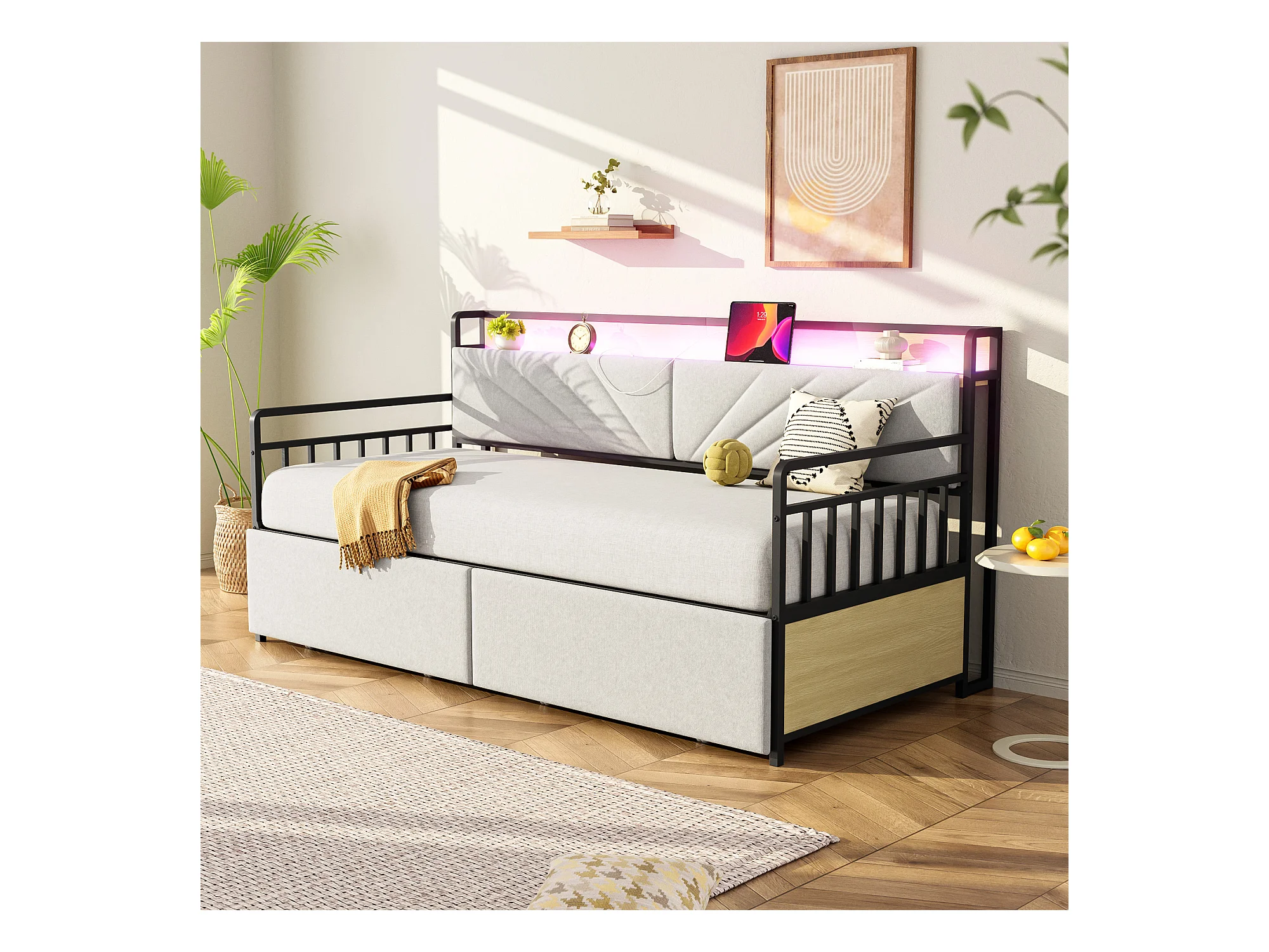 Lit banquette 90x200 cm - Lit simple avec éclairage LED et 2 tiroirs - étagère de rangement et prise multifonction - beige