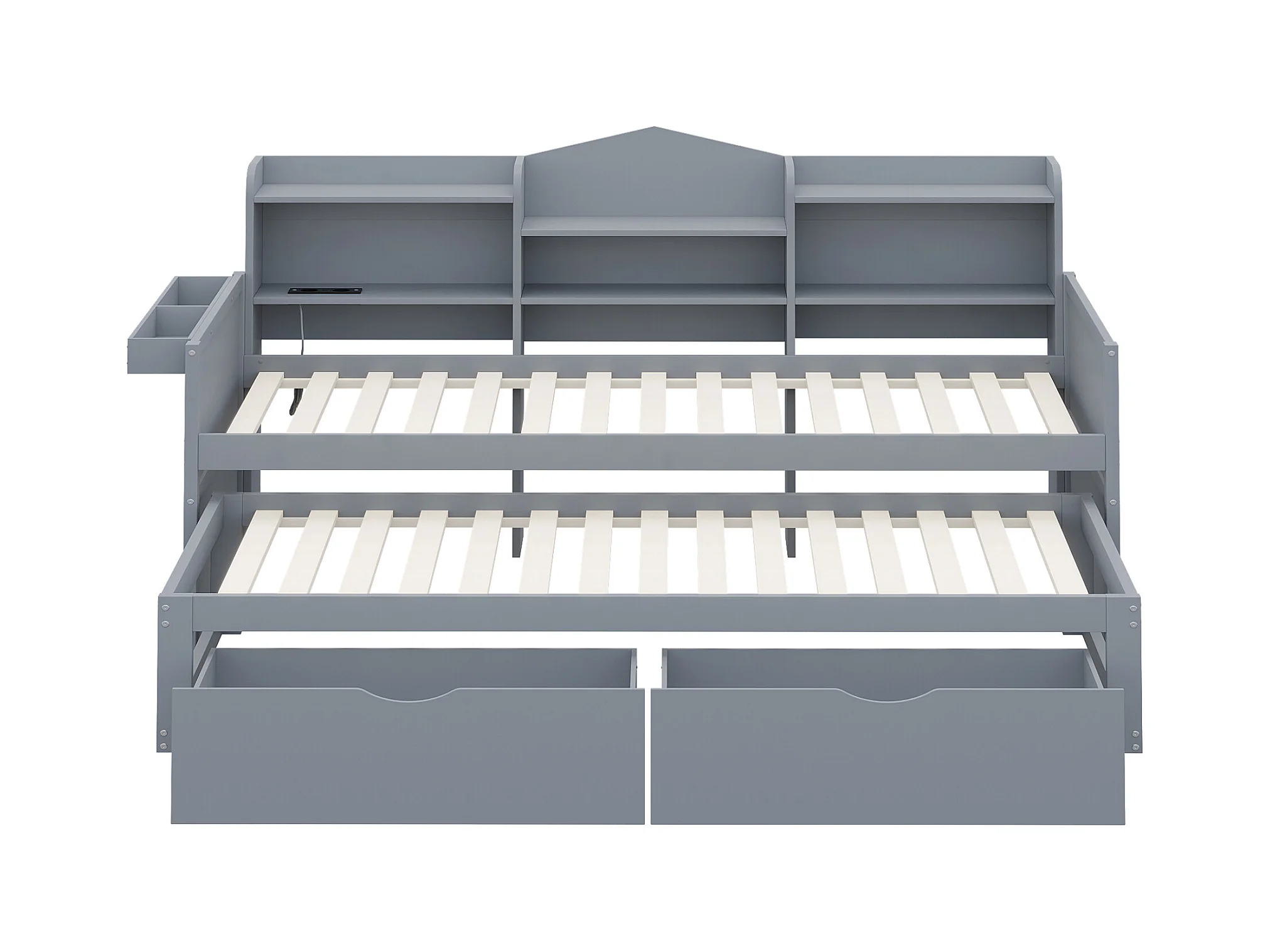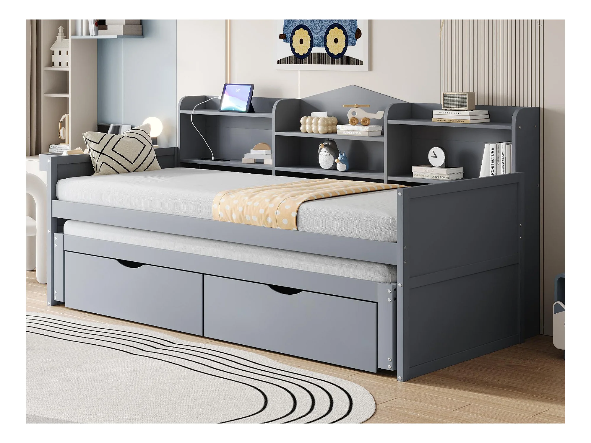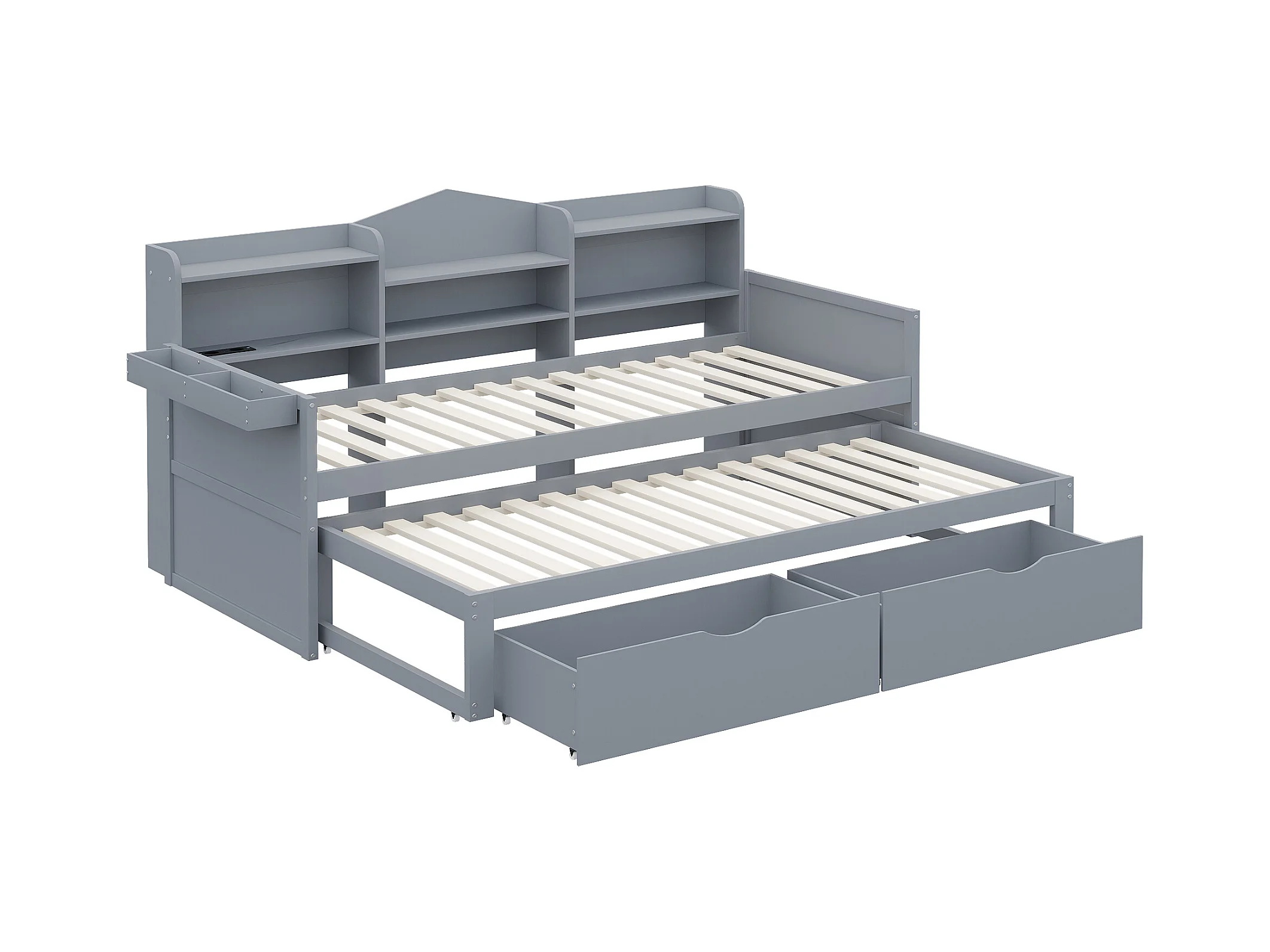 Lit banquette 90x200cm en bois - avec lit gigogne 90x190cm et 2 tiroirs - avec prise USB - Gris