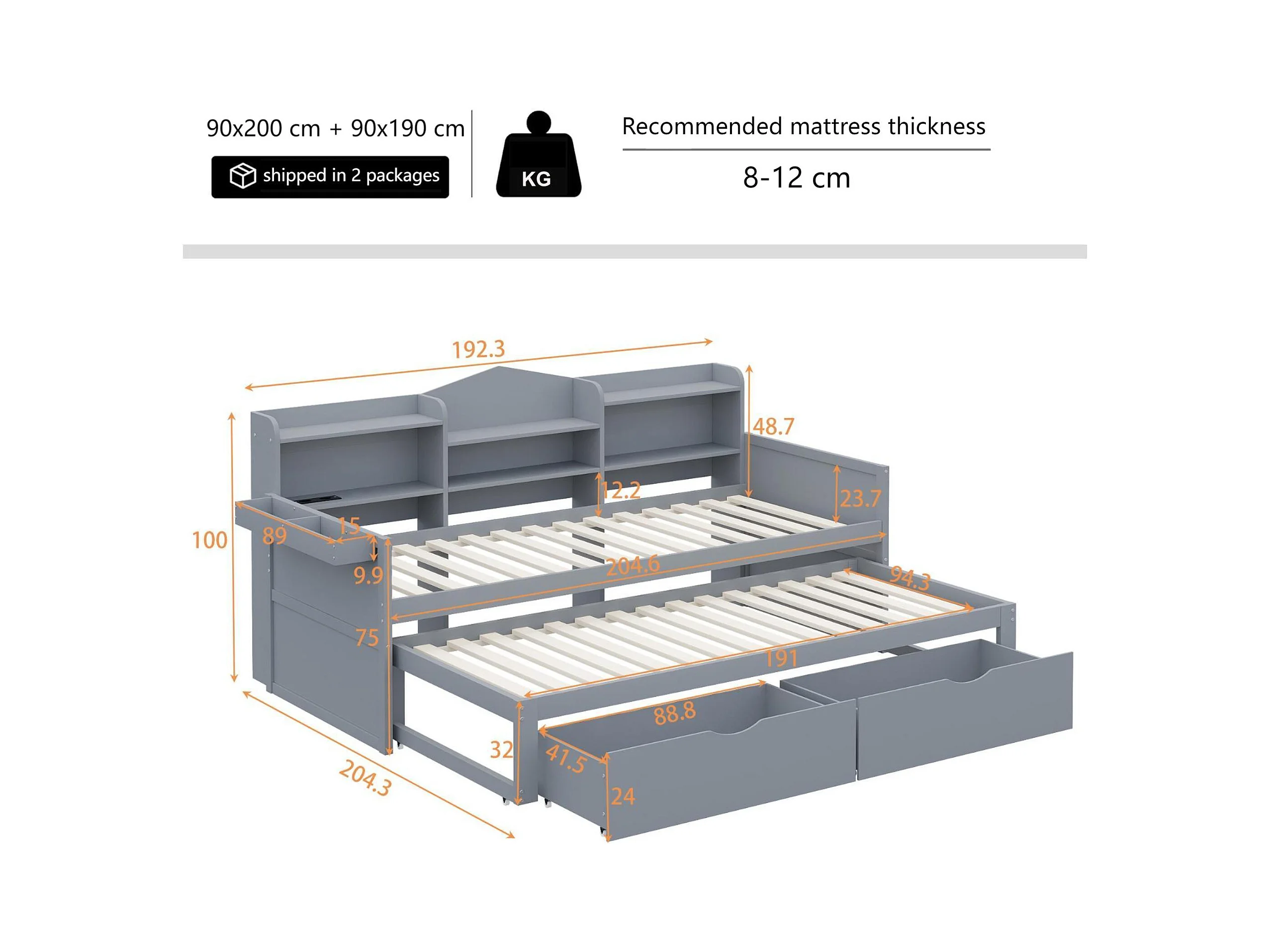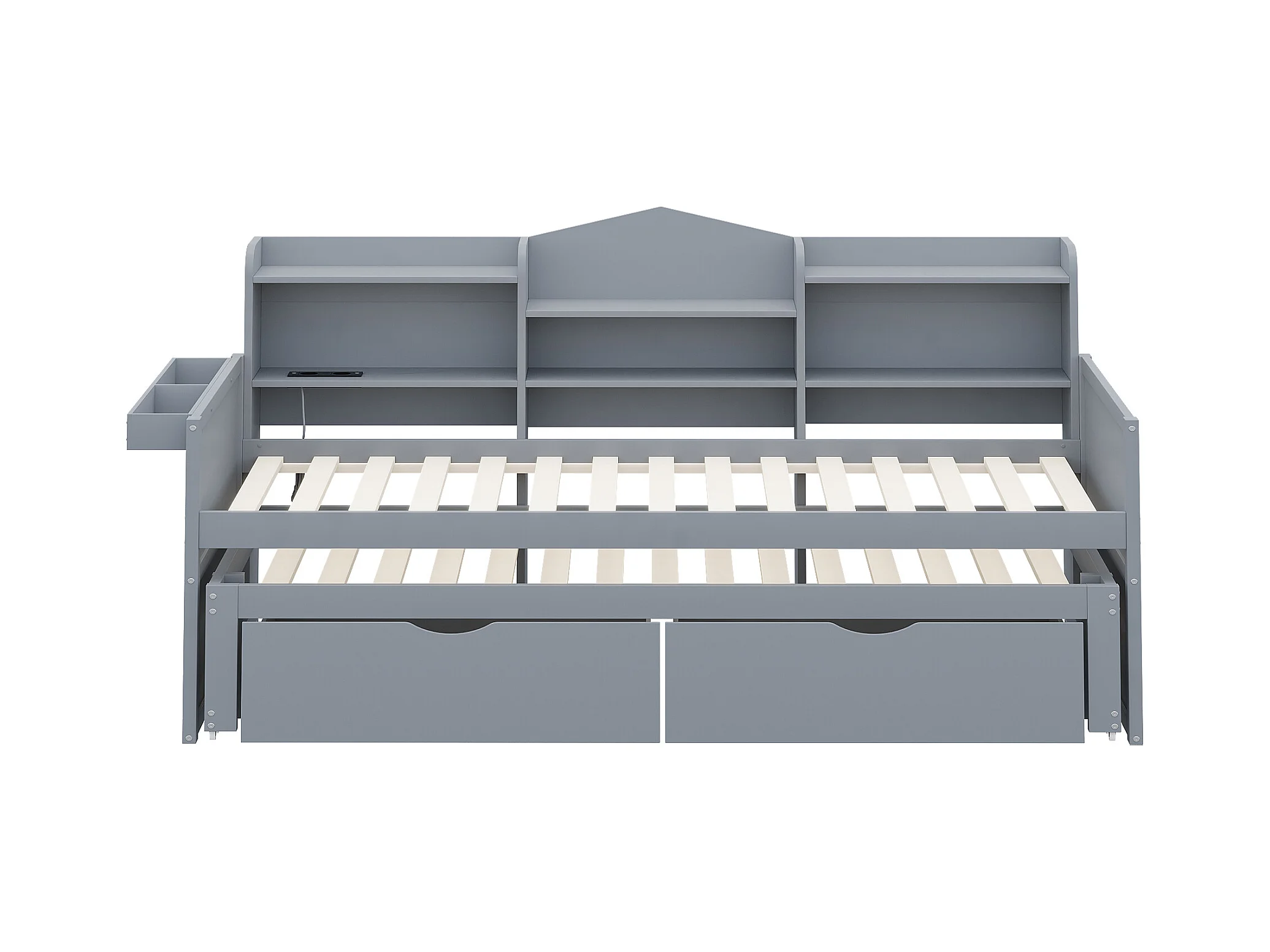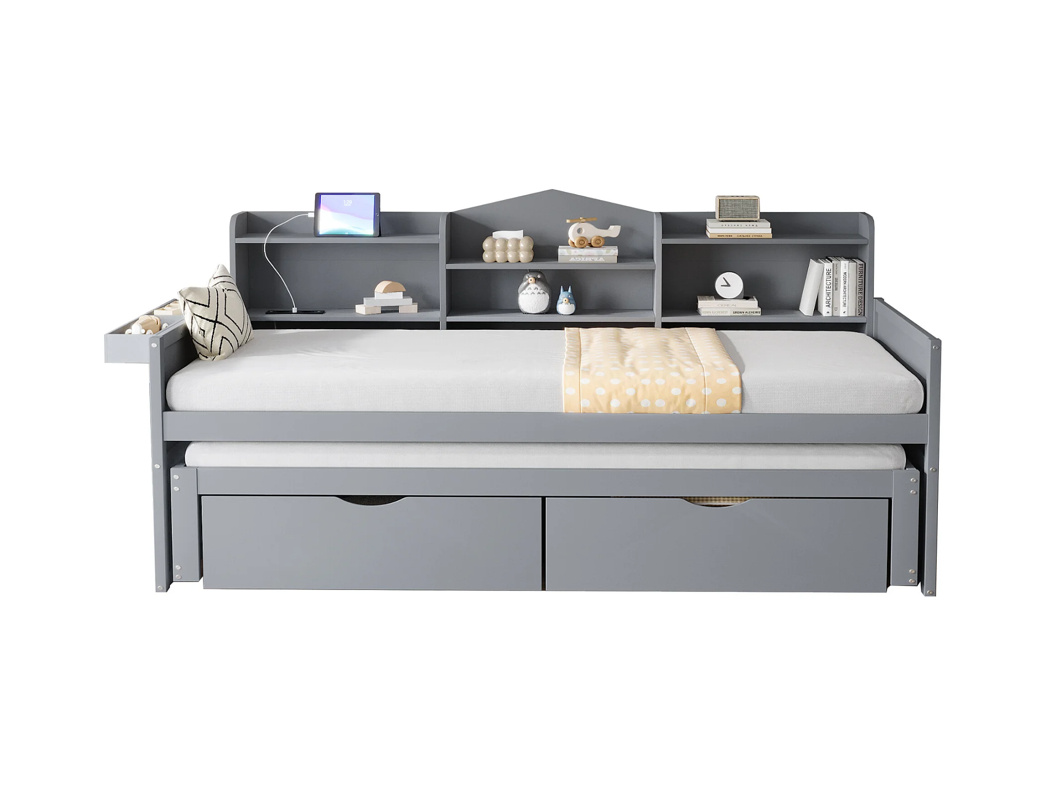 Lit banquette 90x200cm en bois - avec lit gigogne 90x190cm et 2 tiroirs - avec prise USB - Gris