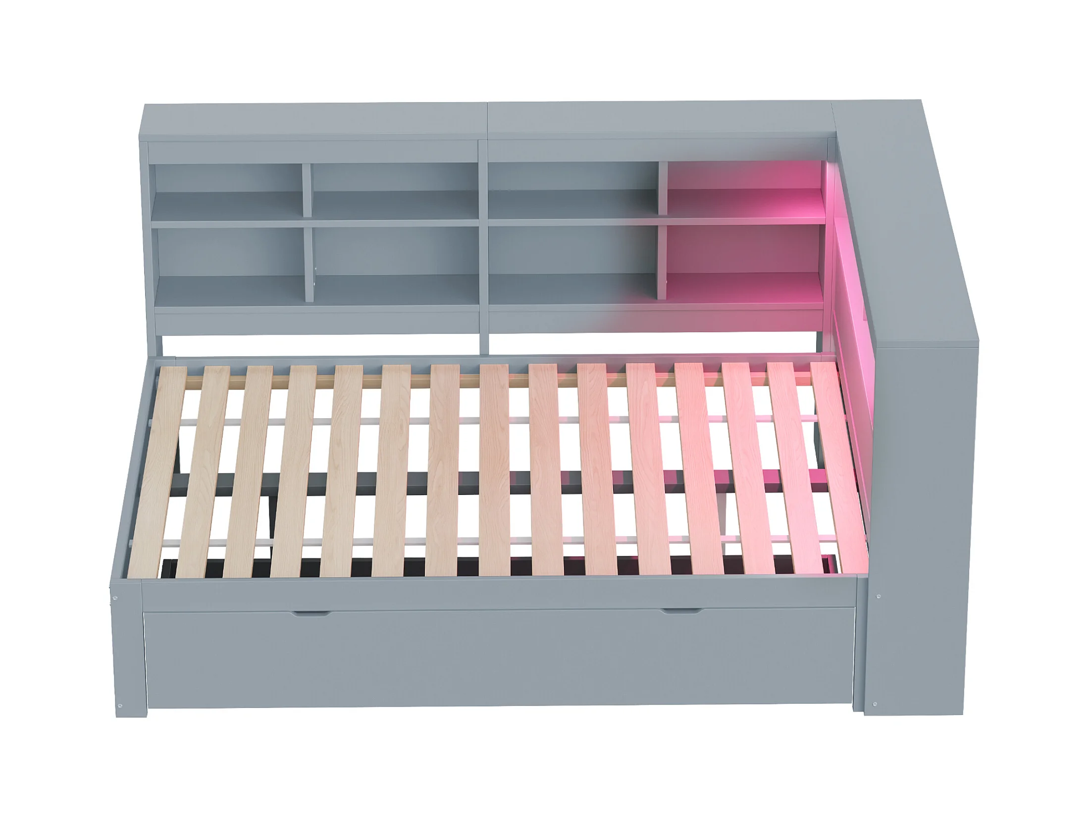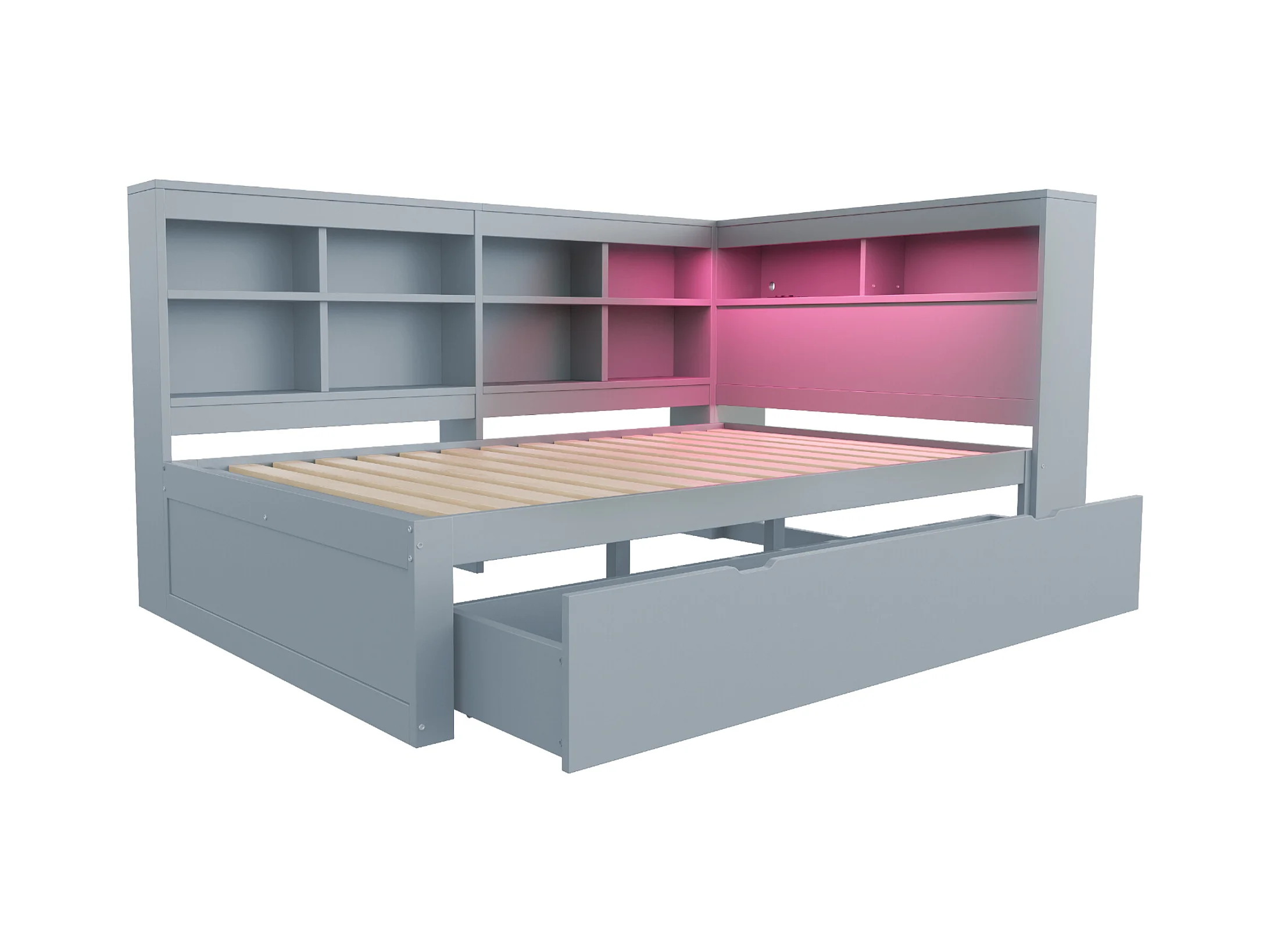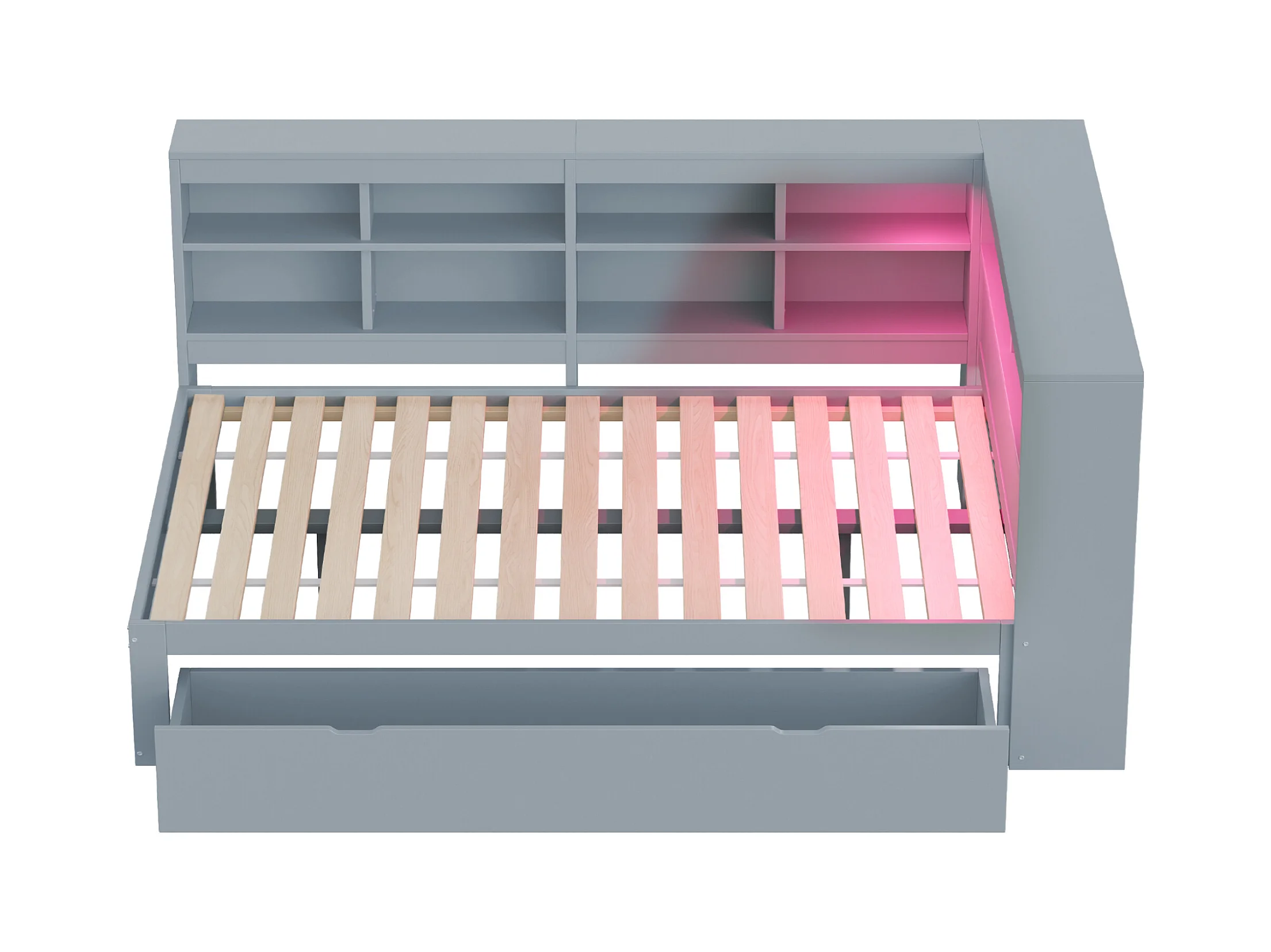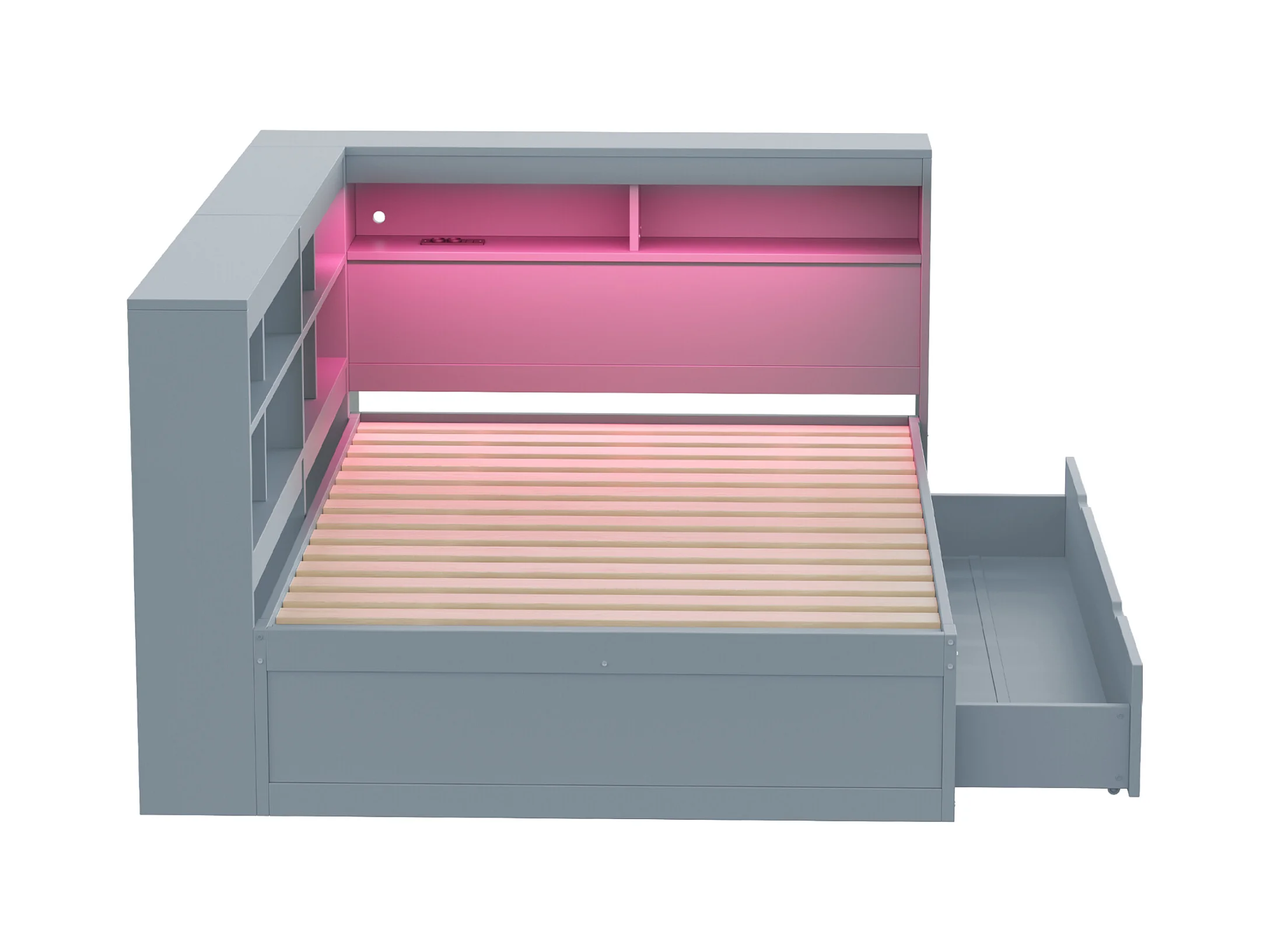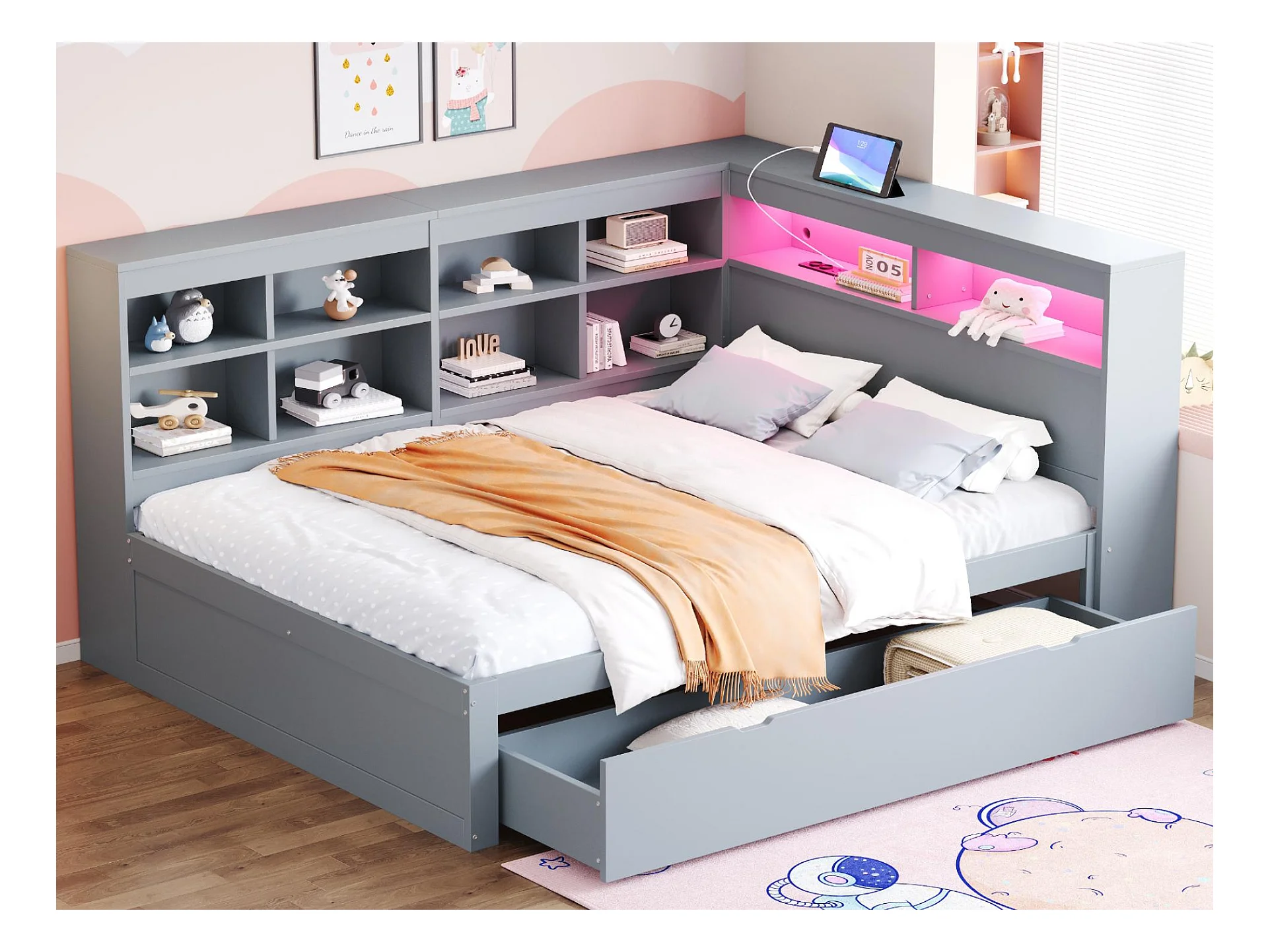 Lit banquette de rangement en bois massif 140x200 cm - avec LED et prises USB - Gris