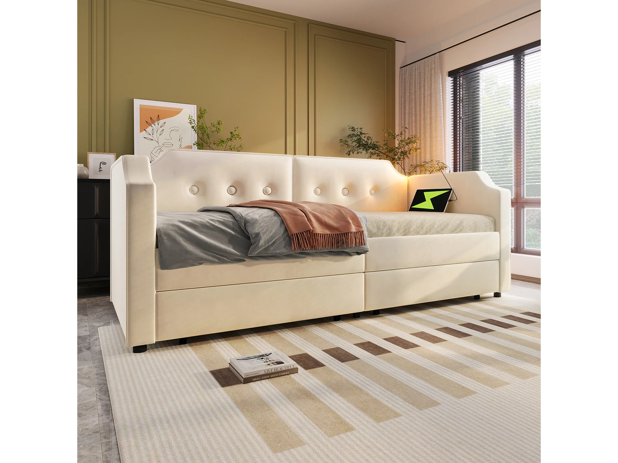 Canapé-lit 90x200 cm avec sommier - lit jeune avec USB et 2 tiroirs de rangement - velours beige (sans matelas)