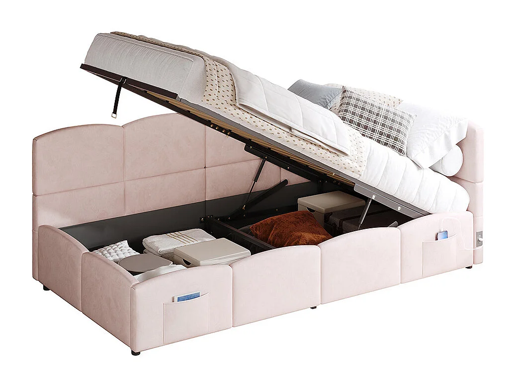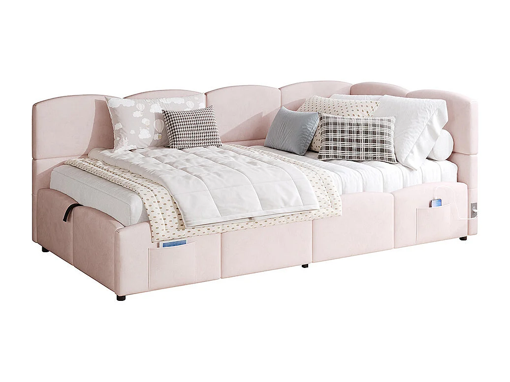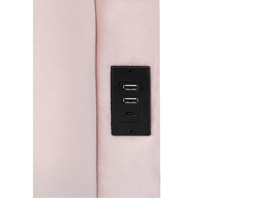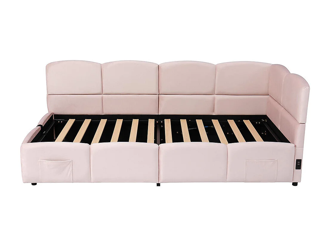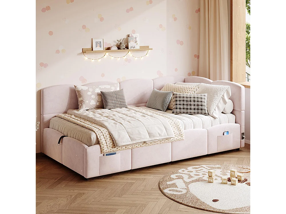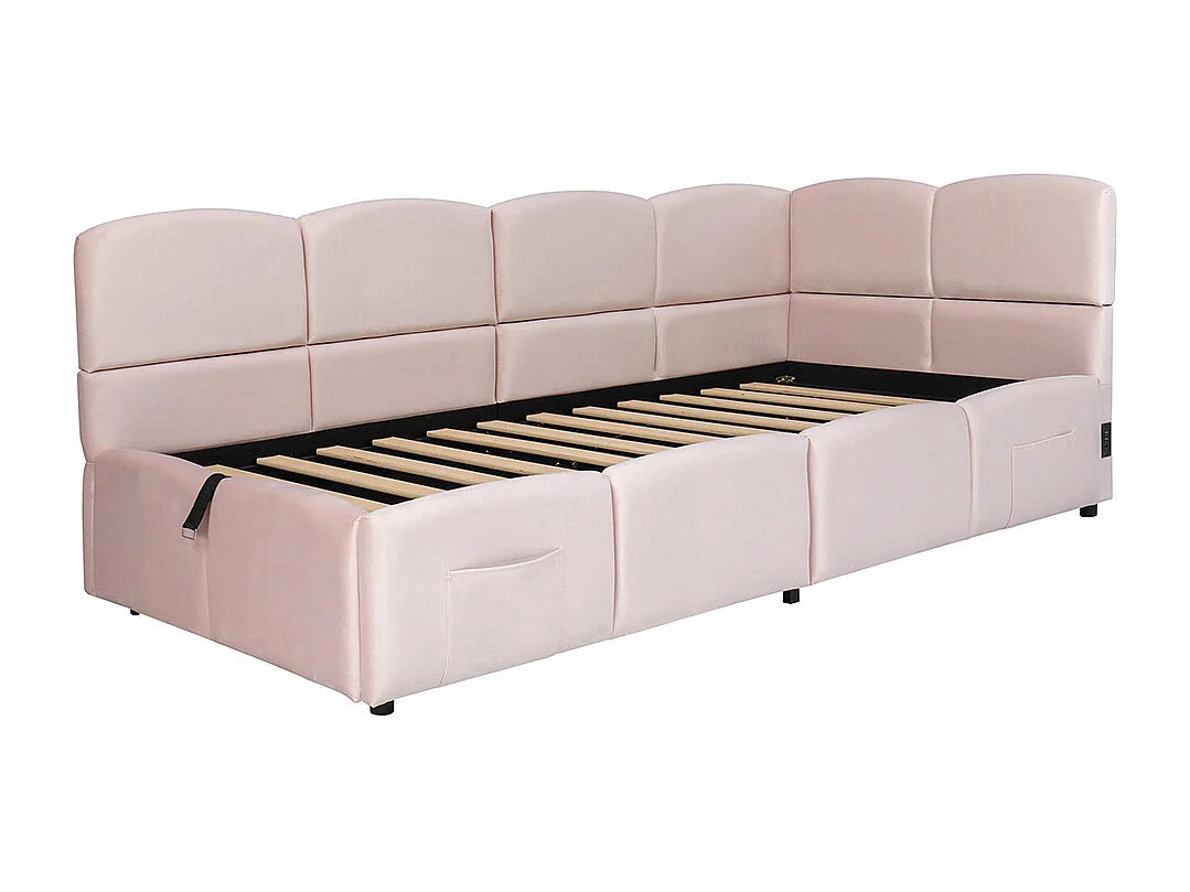 Lit banquette rose 90x200 cm rangement sommier lattes USB sac adolescent enfant adulte velours sans matelas