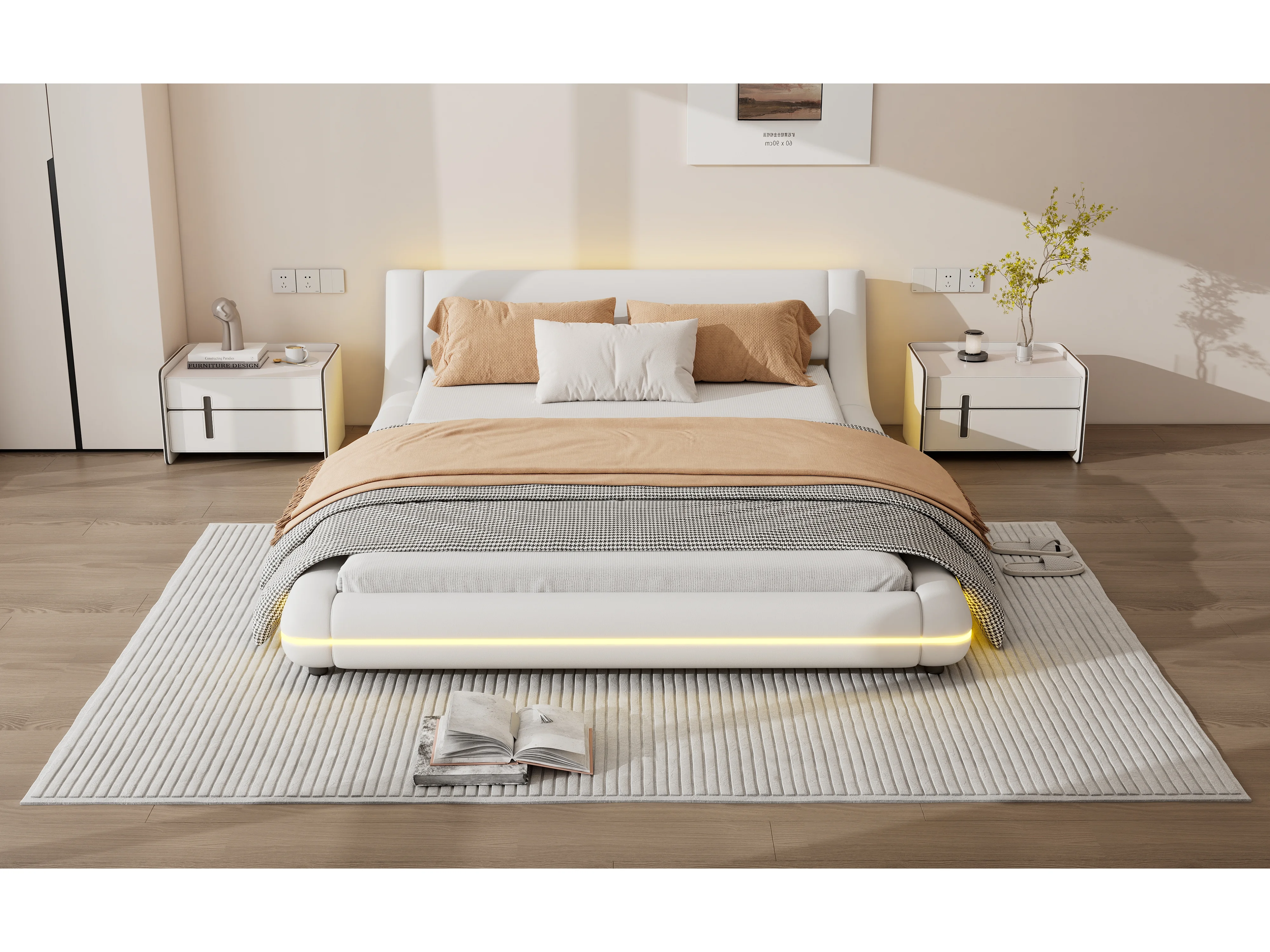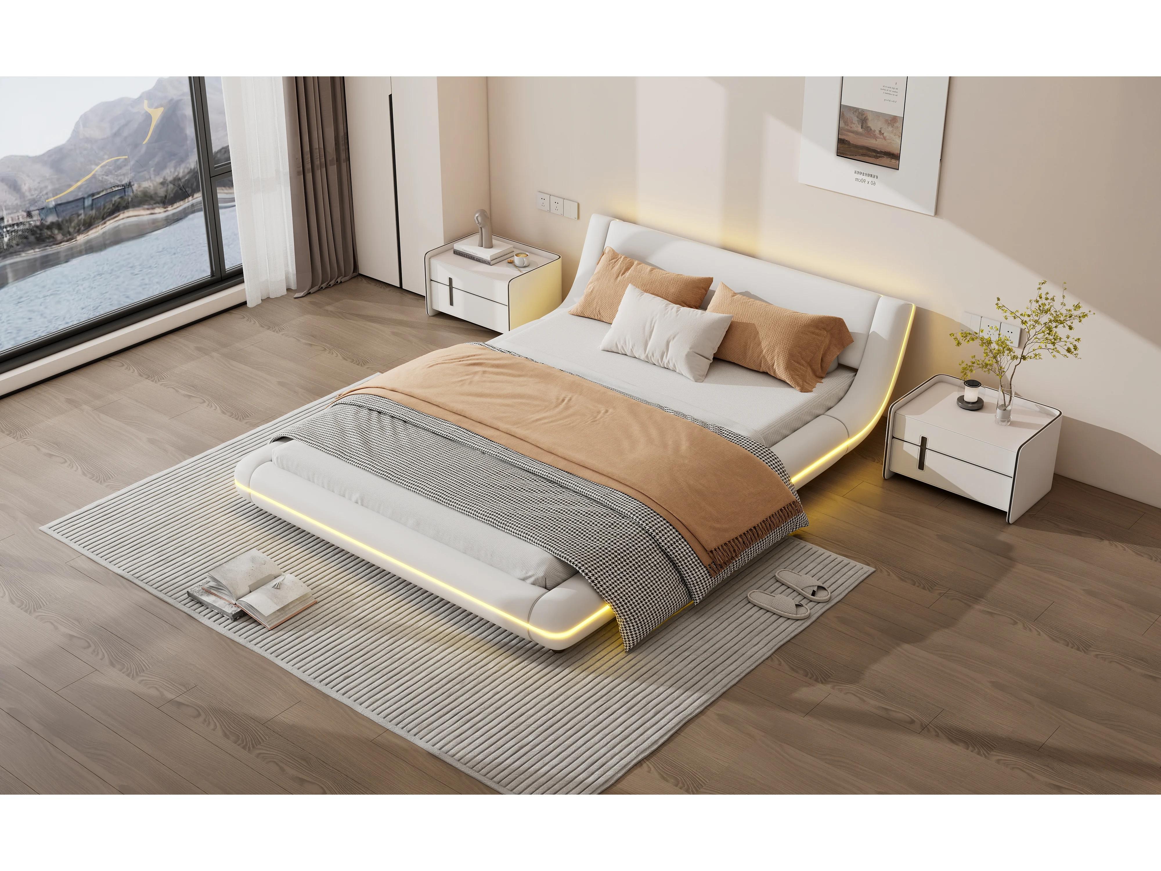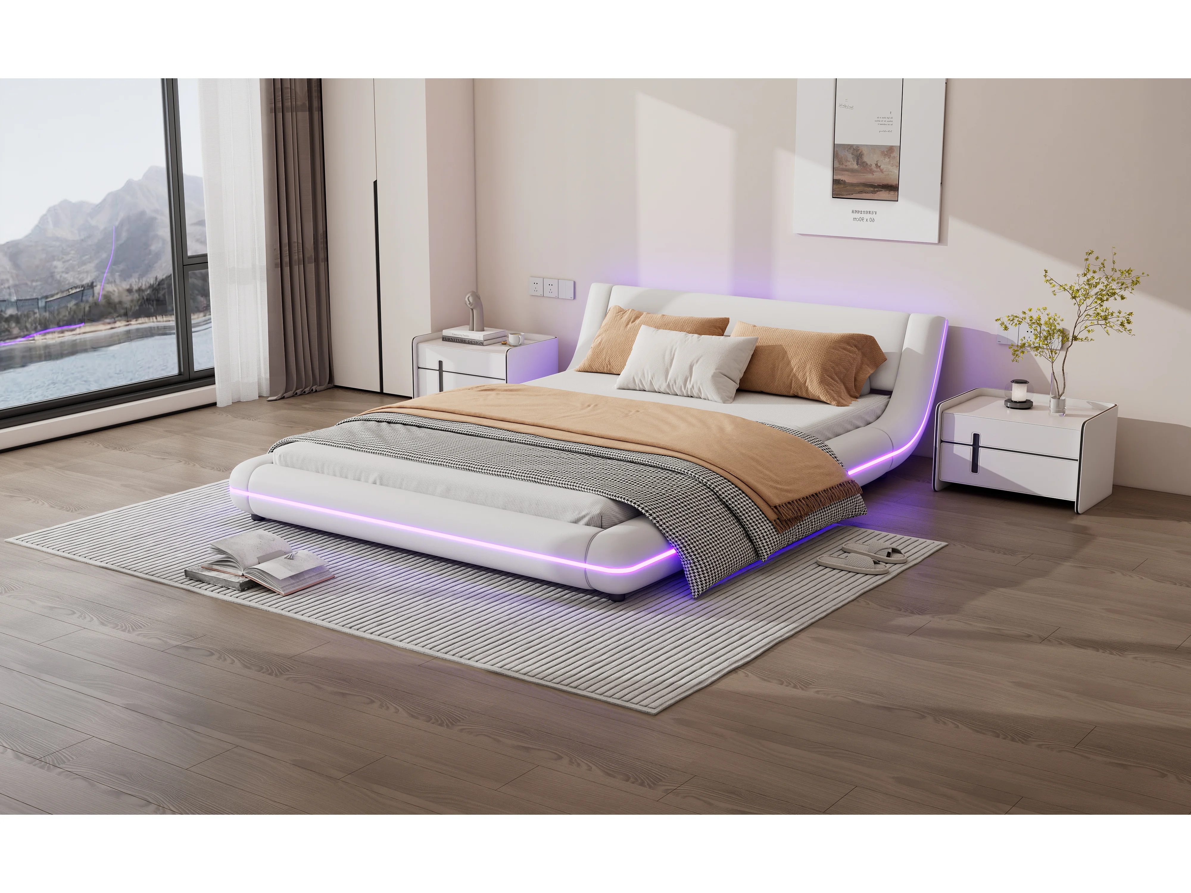 Lit bas 140x200 cm, lit plat PU, éclairage LED réglable, télécommande 24 touches, Blanc