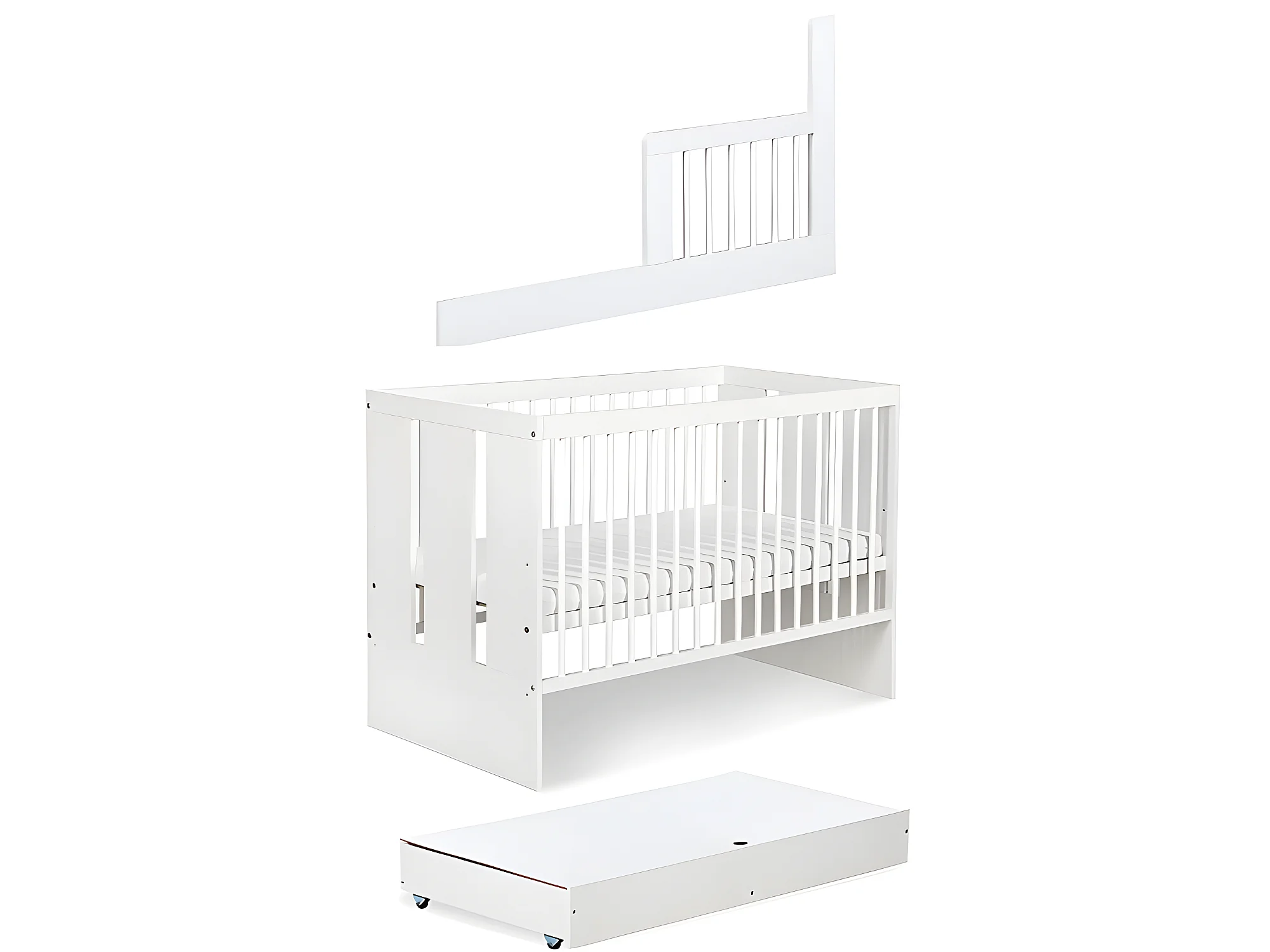Lit bébé 120x60cm Blanc avec tiroir PAULA barreaux amovible et barrière de sécurité inclus