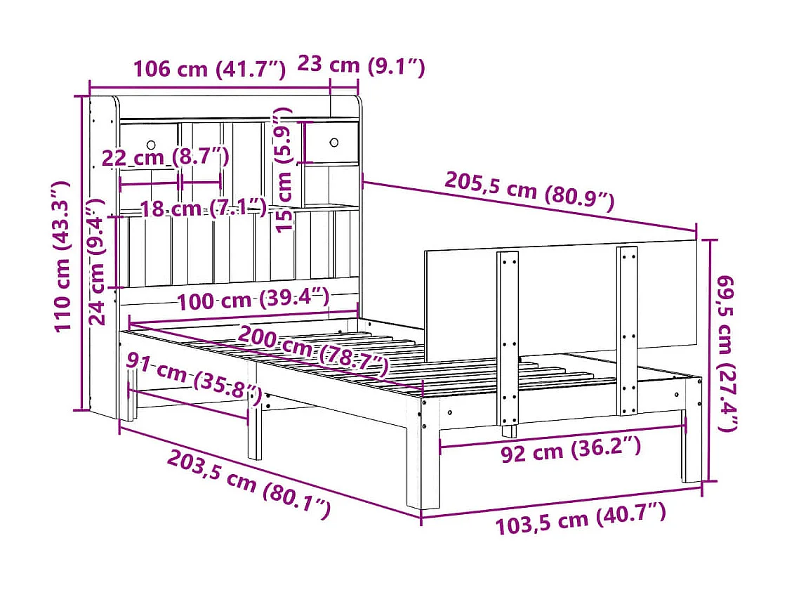 Lit bibliothèque sans matelas 100x200 cm bois massif de pin