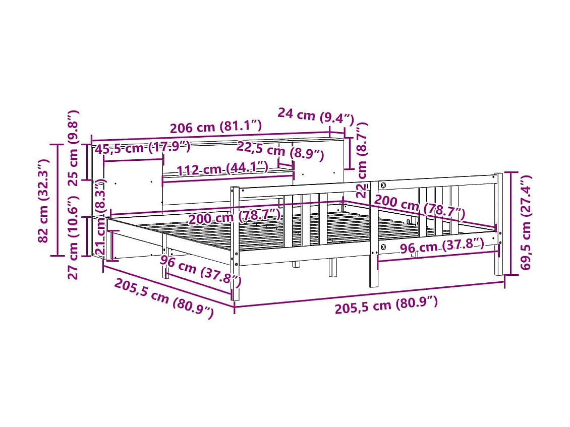 Lit bibliothèque sans matelas blanc 200x200 cm bois pin massif