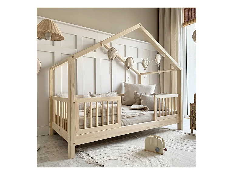 Lit cabane 90x190 barrières et sommier inclus pieds 10 cm Rosalie Bois