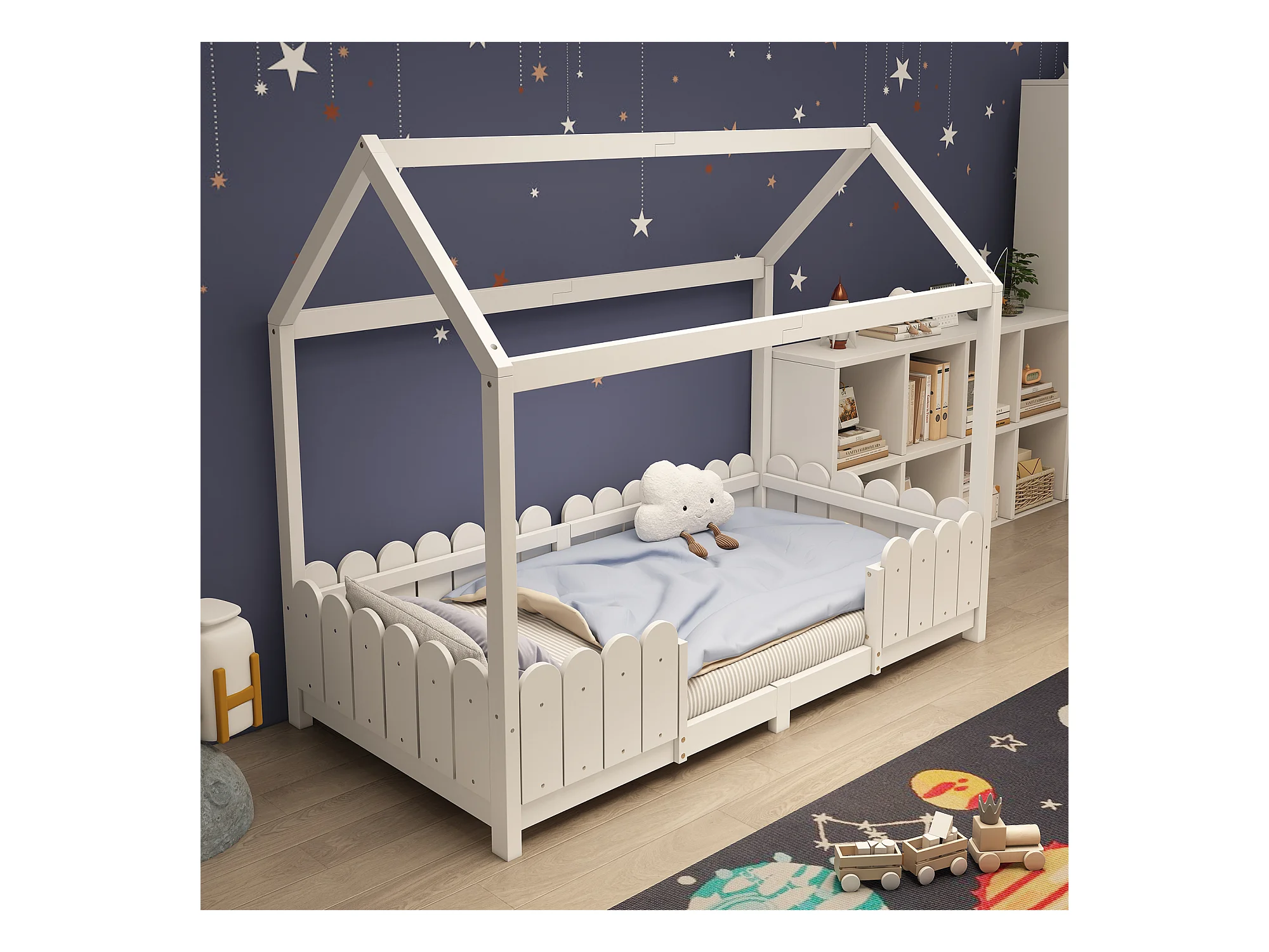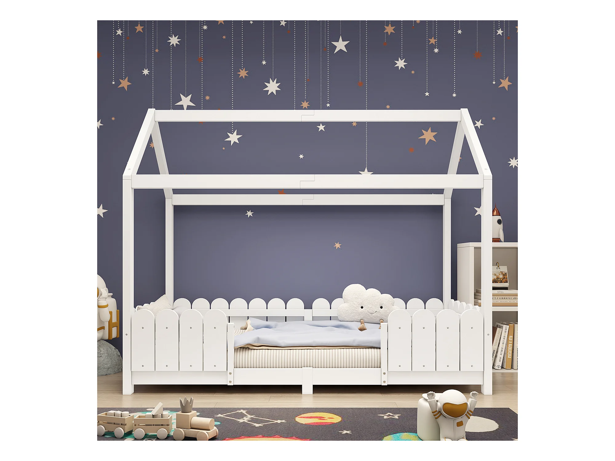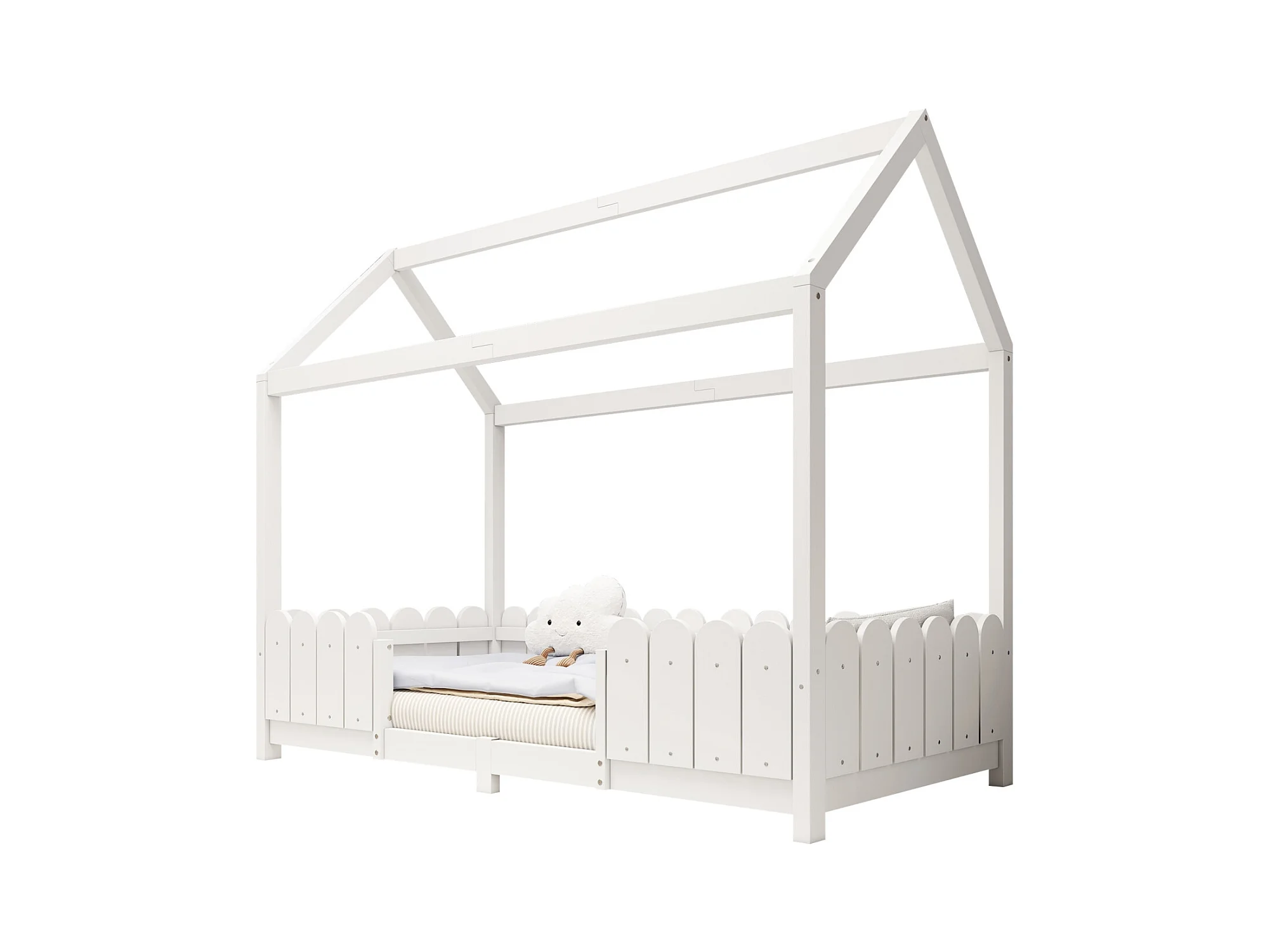 Lit cabane 90x200 cm - Lit d'enfant en bois polyvalent pour garçons & filles - Avec protection contre les chutes et sommier à lattes - Blanc (Sans matelas)