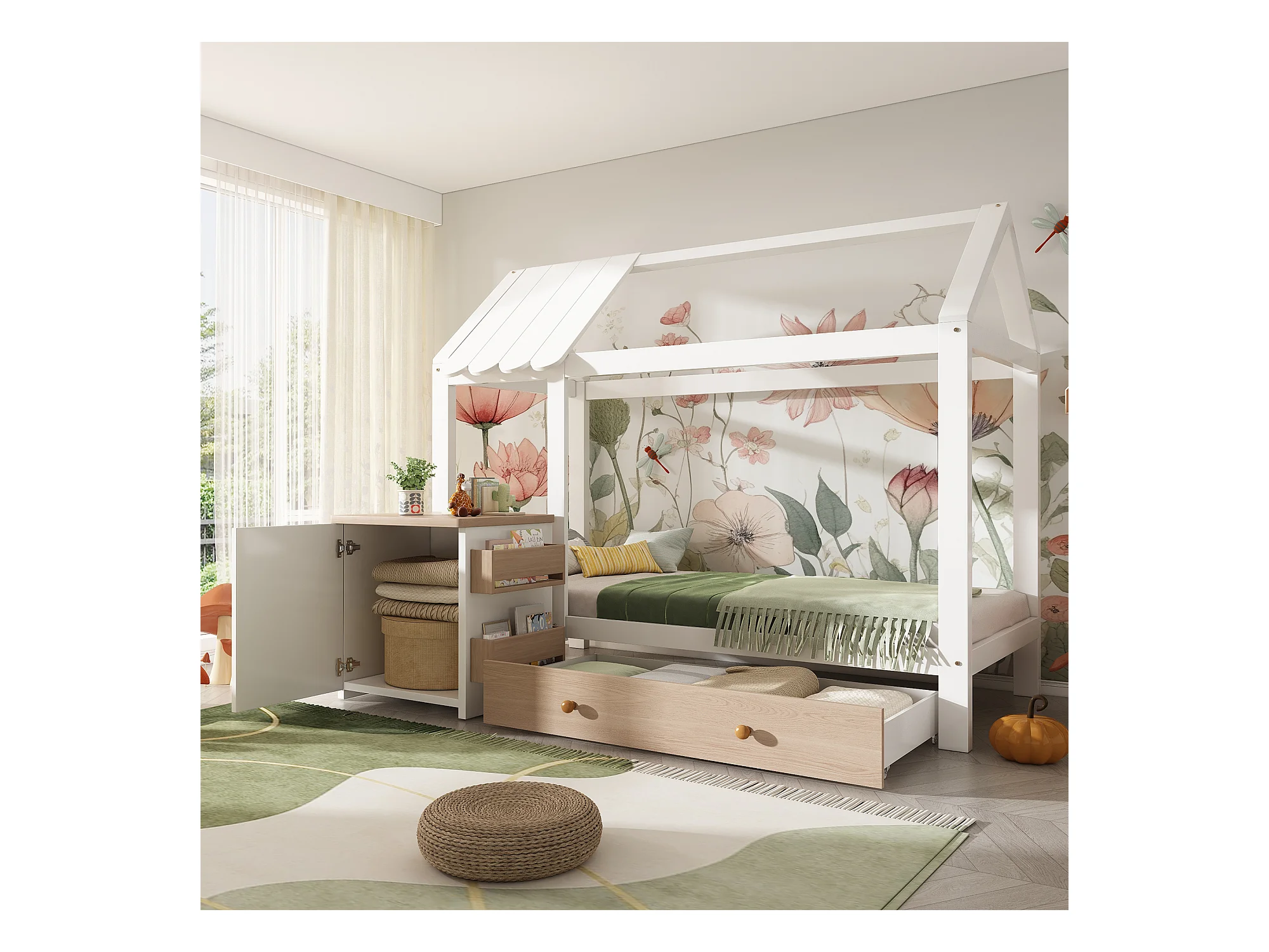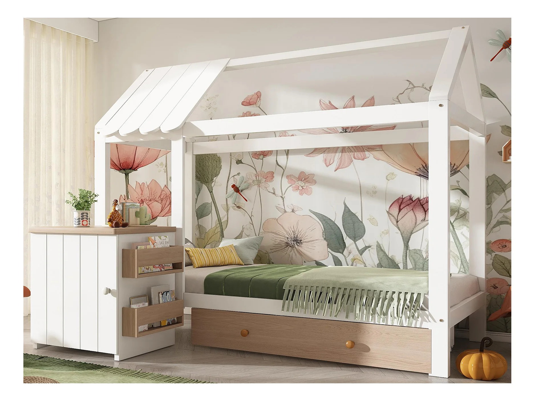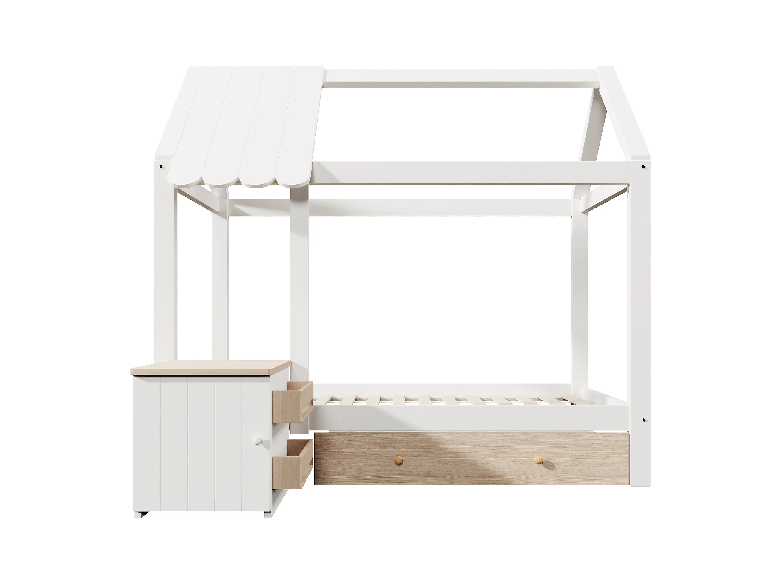 Lit cabane 90x200cm - avec 1 tiroir et table de chevet amovible - en forme de maison - en bois massif - Blanc+Naturel
