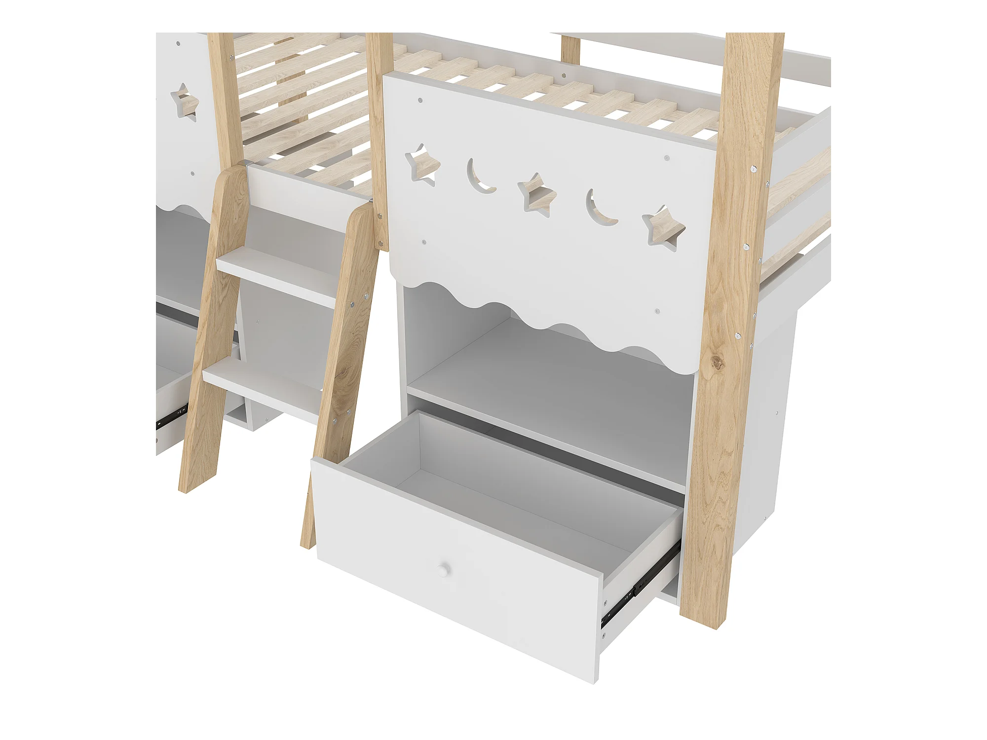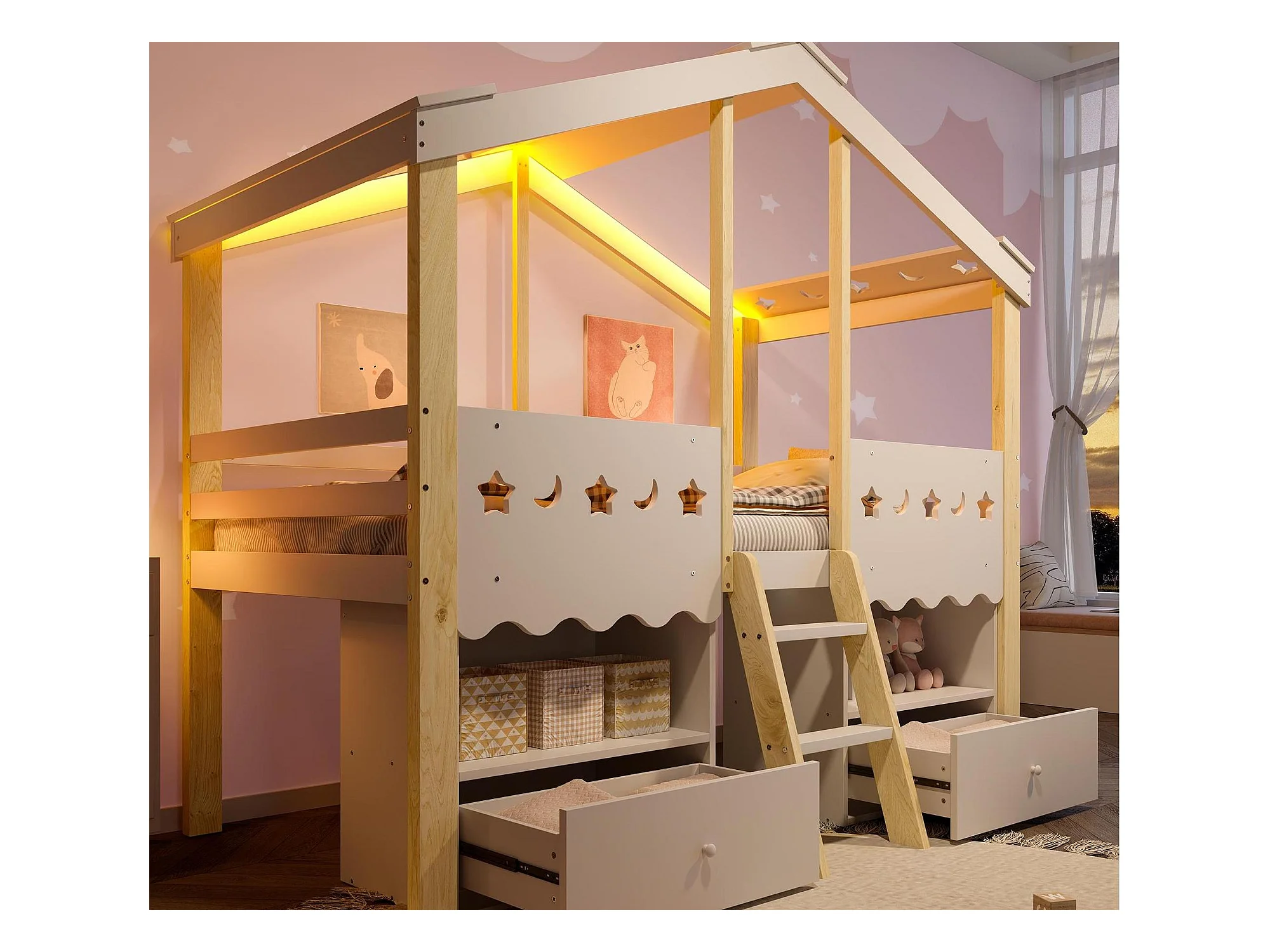 Lit cabane enfant 90x200 cm - forme maison - avec 2 tiroirs - avec bande lumineuse LED - blanc + naturel (matelas non inclus)