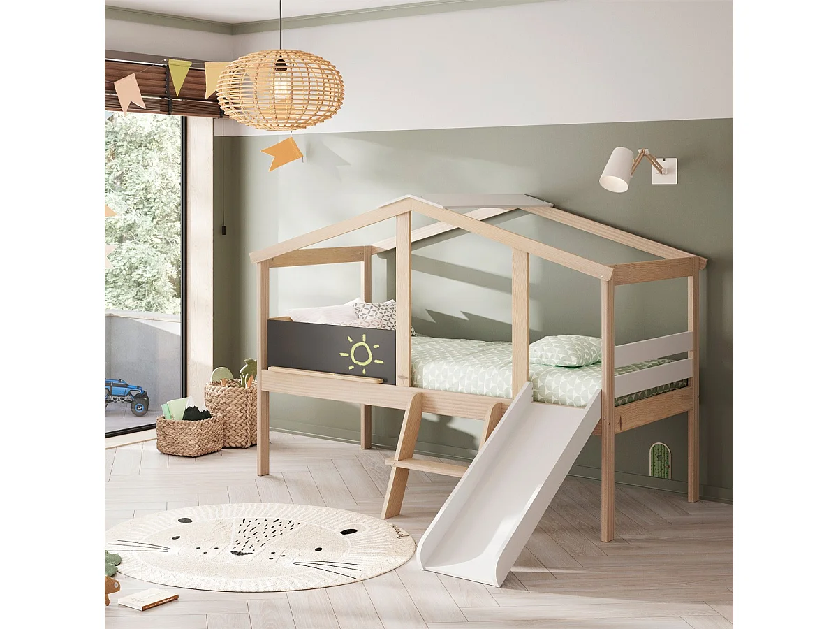 Lit cabane enfant avec toboggan 90x190 cm en bois clair/blanc - Jules