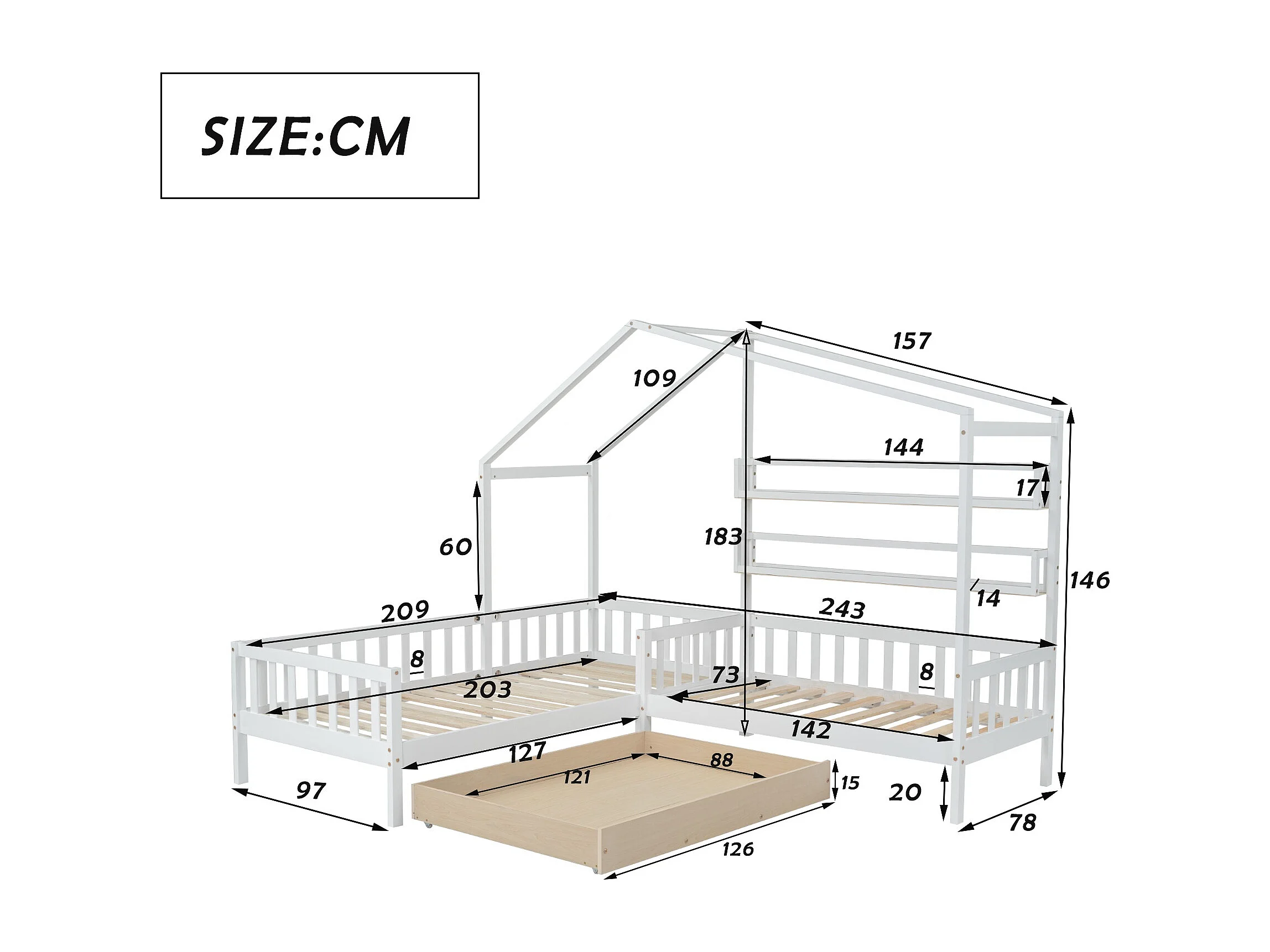 Lit Cabane enfant en L 90x200 cm + 140x70 cm avec tiroirs et étagères - Bois avec clôture - Blanc