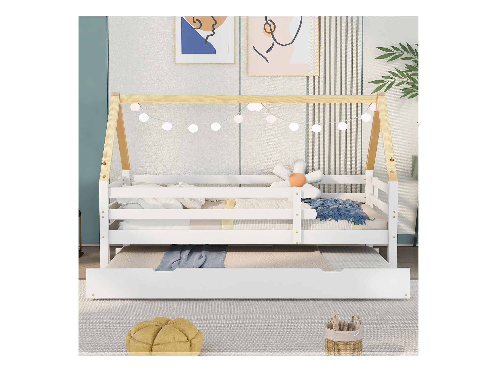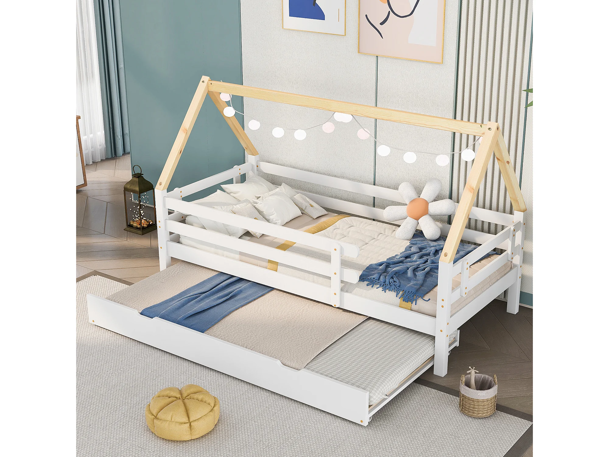 Lit Cabane Méridienne - 200 X 90 cm - Bois Massif Avec Roulettes - Naturel Et Blanc