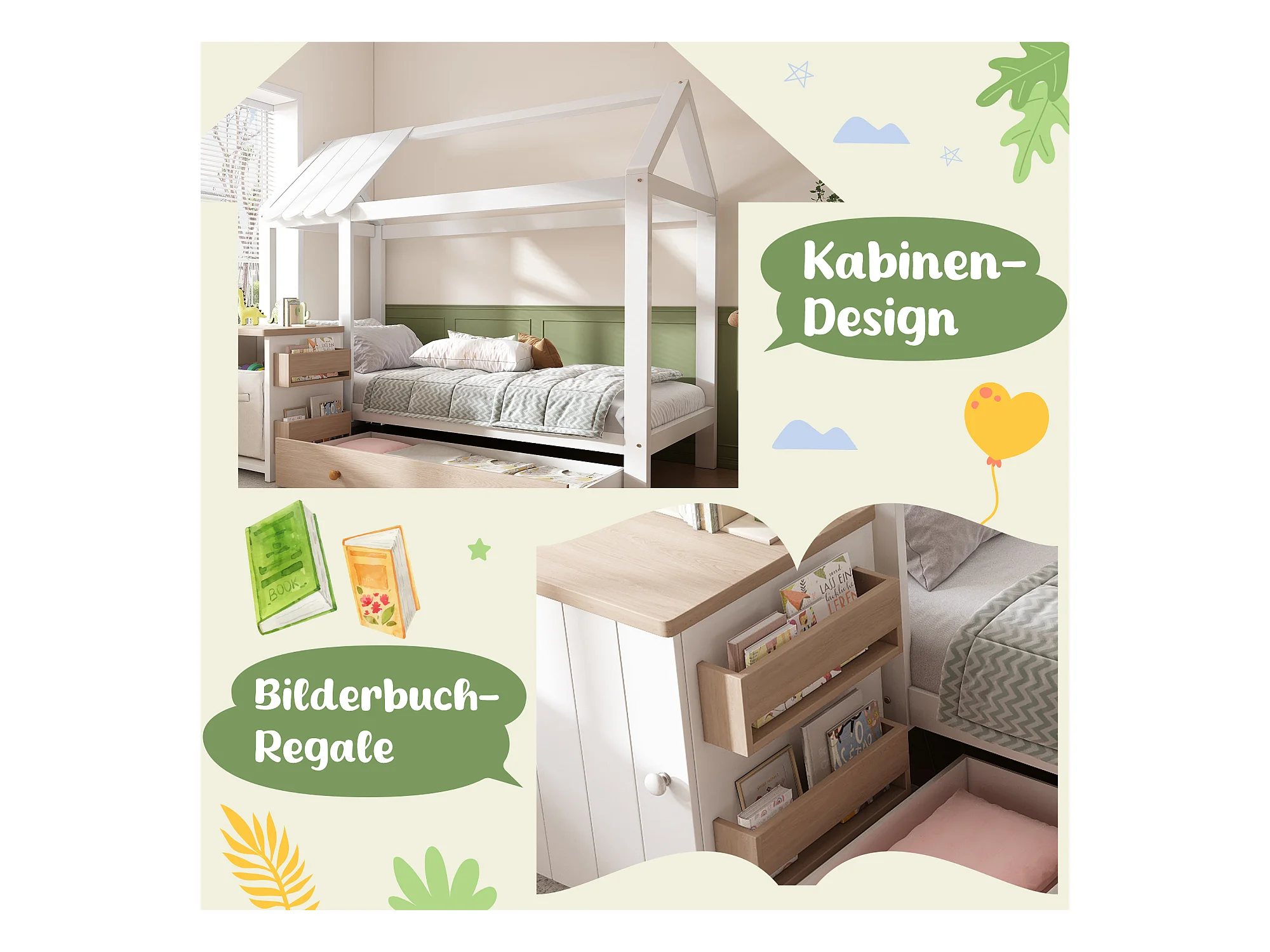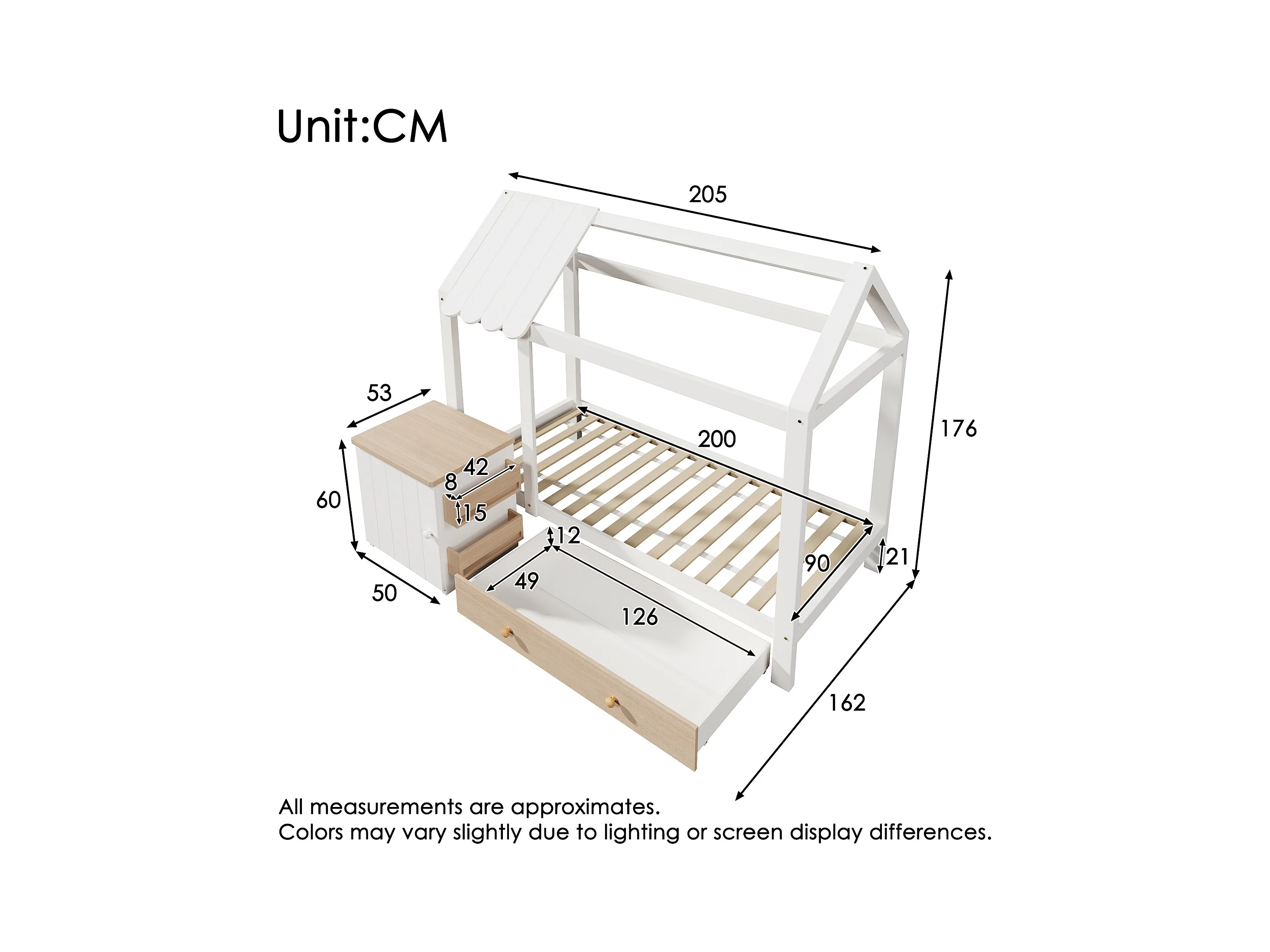 Lit cabane pour enfant - 90 x 200 cm - avec 1 tiroir + table de chevet amovible - lit de sol - Pin + MDF - naturel + blanc