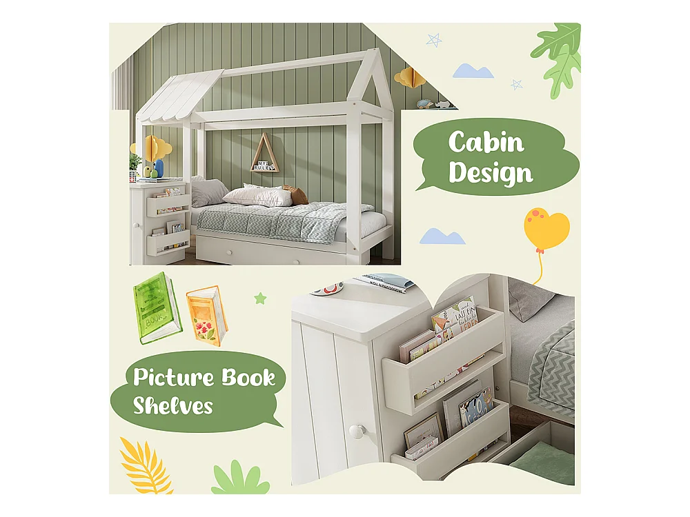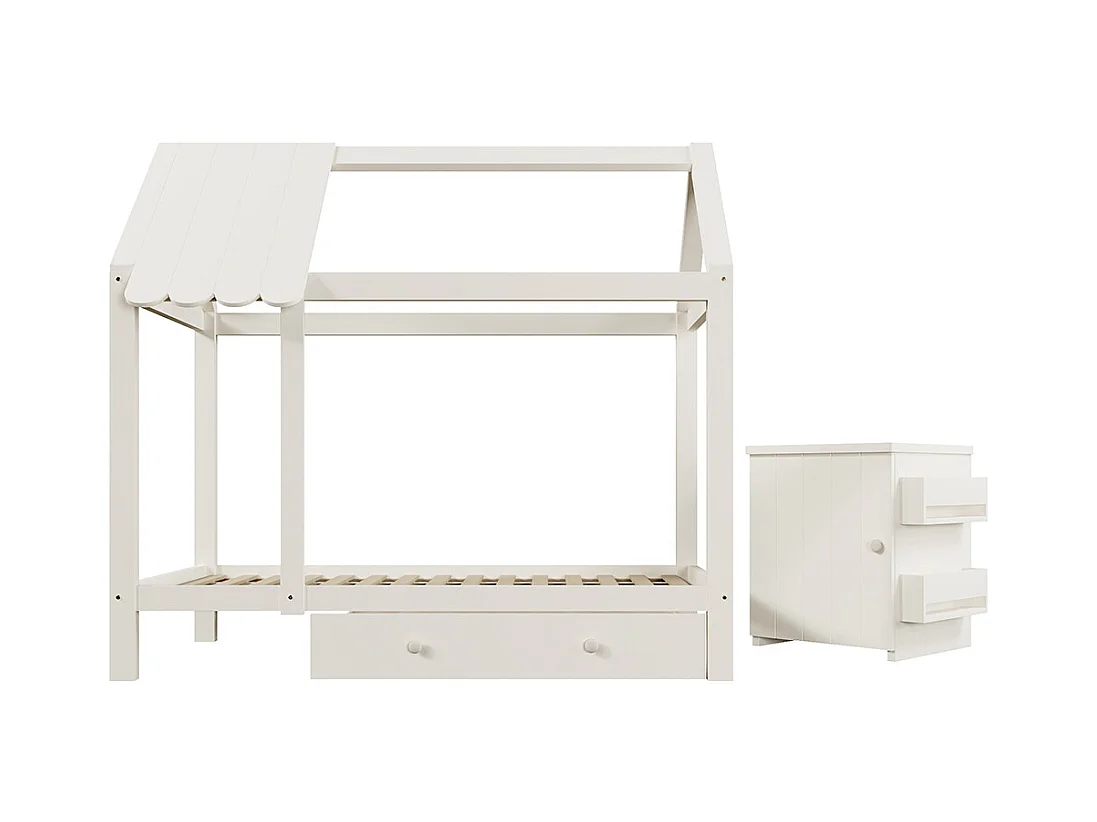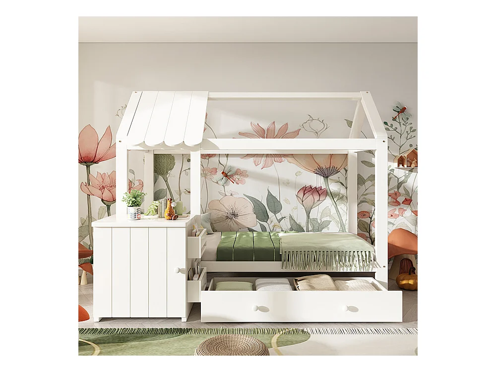 Lit cabane pour enfant 90x200 en bois massif avec tiroirs et table de chevet amovible lit au sol en blanc