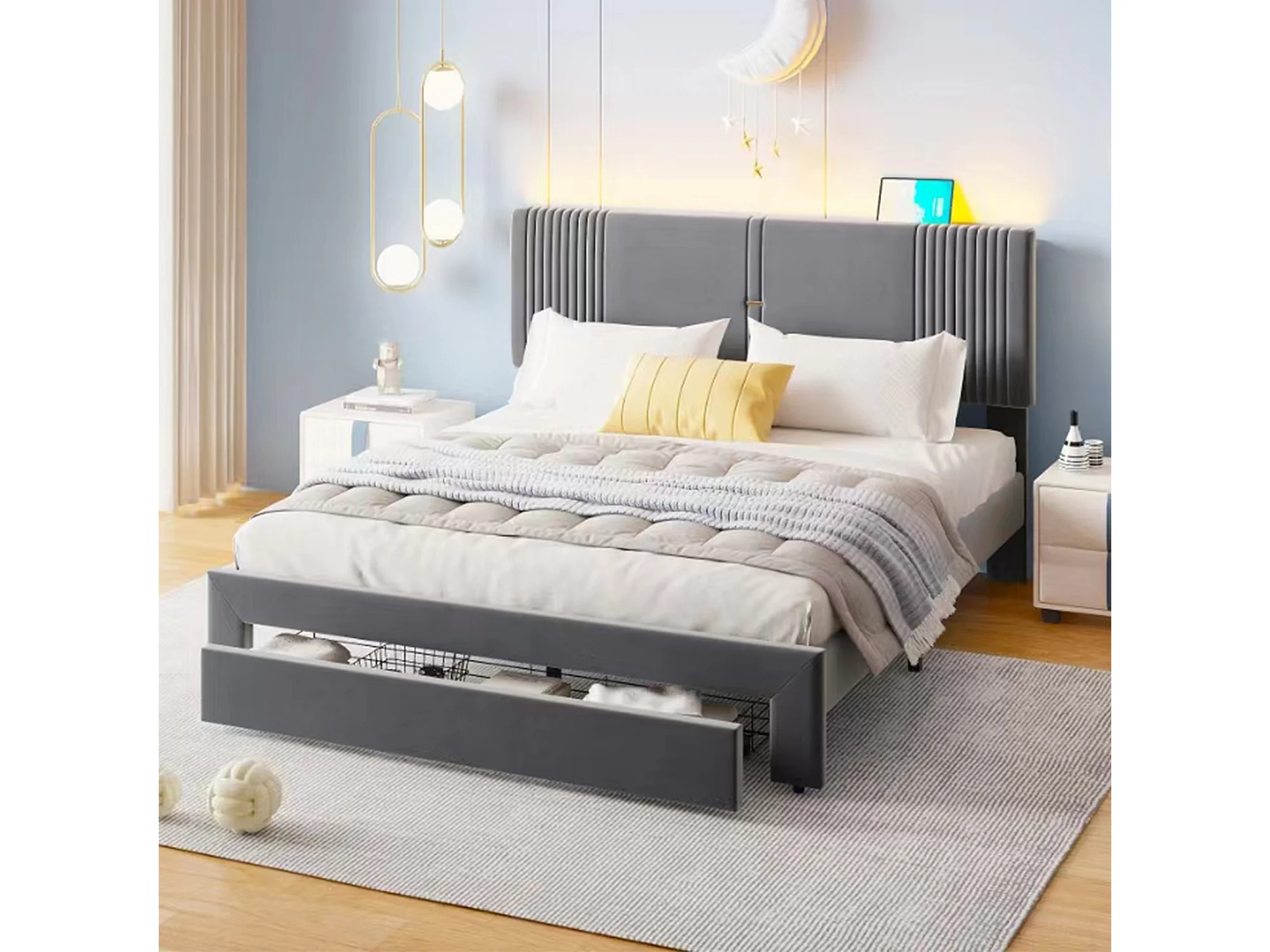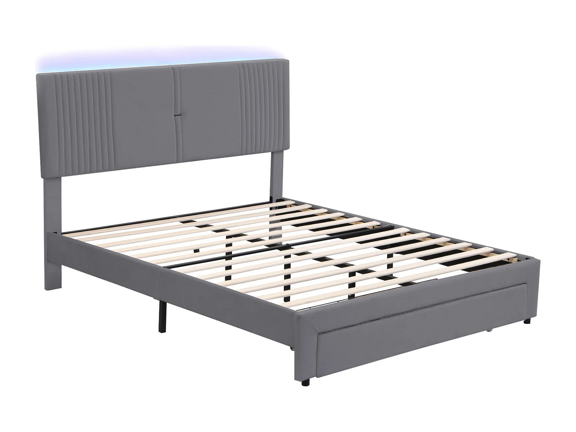 Lit double 160x200 cm - Lit adulte avec bandeau lumineux et USB - Tiroirs de rangement - Velours gris