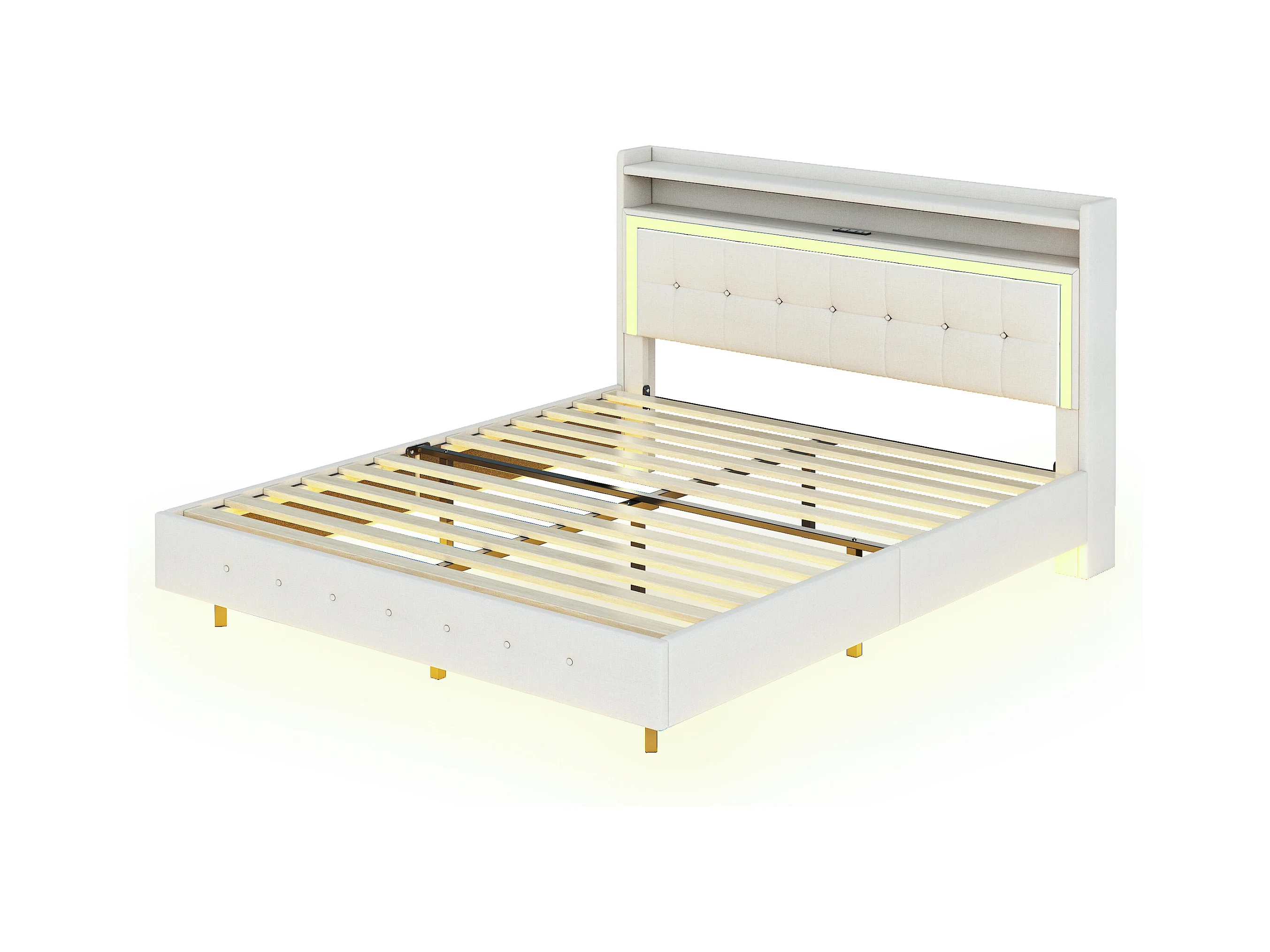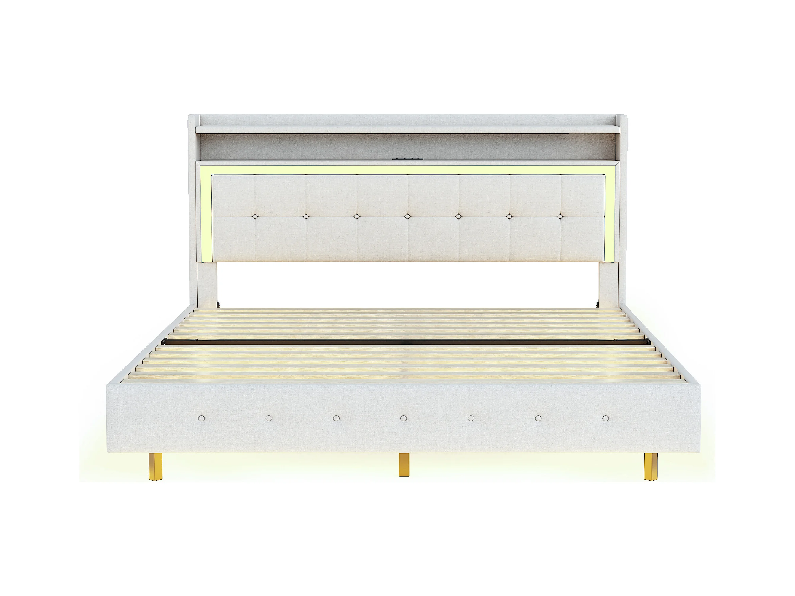 Lit adulte 160x200 cm - Lit double avec port USB et éclairage LED - lin beige