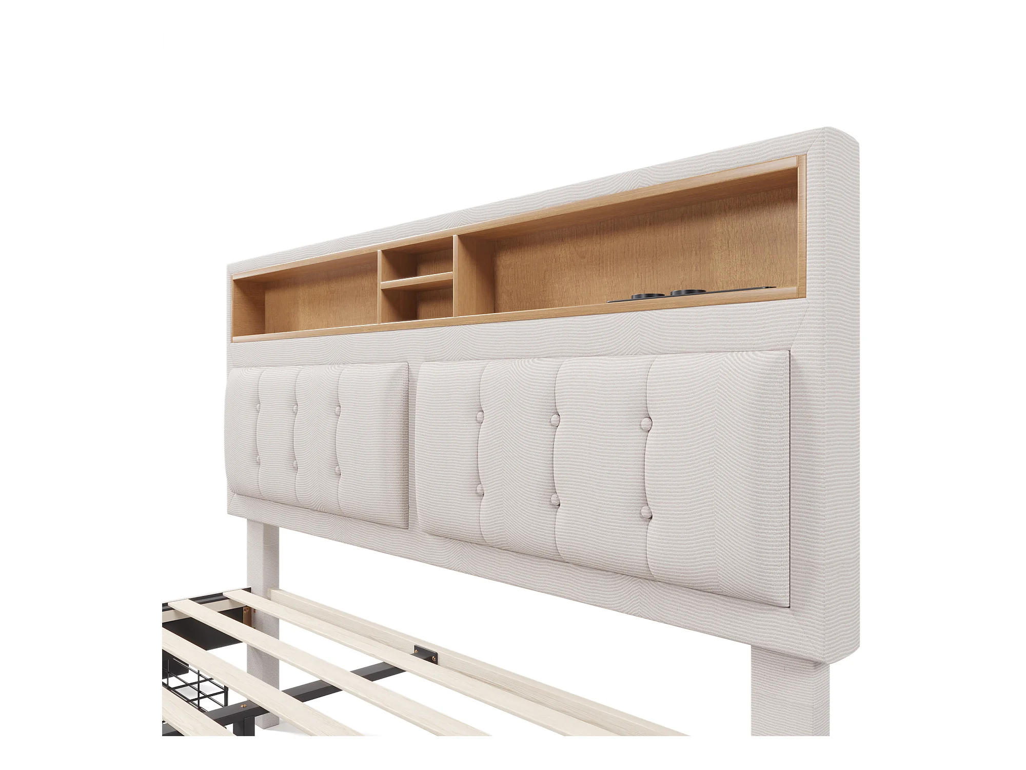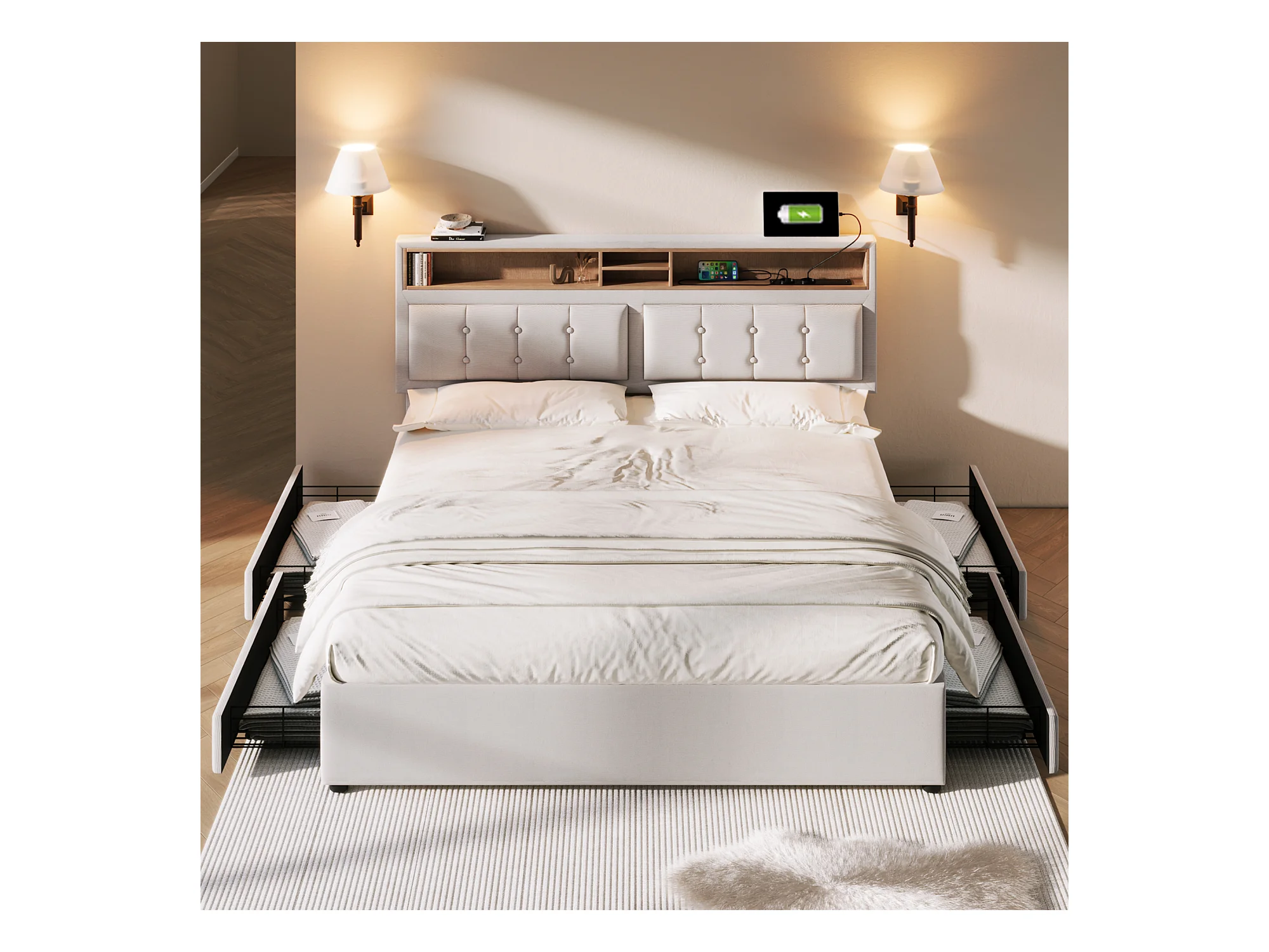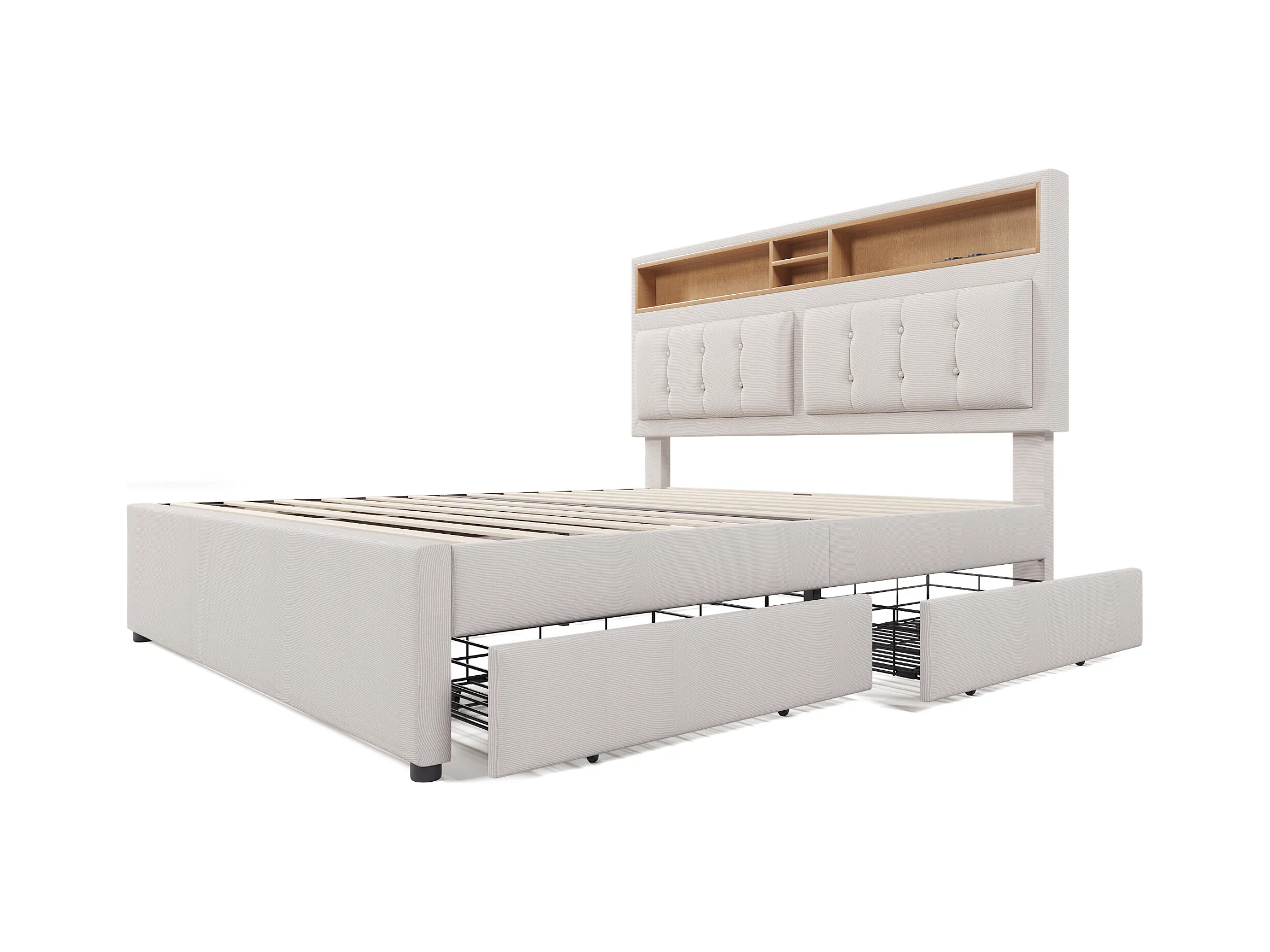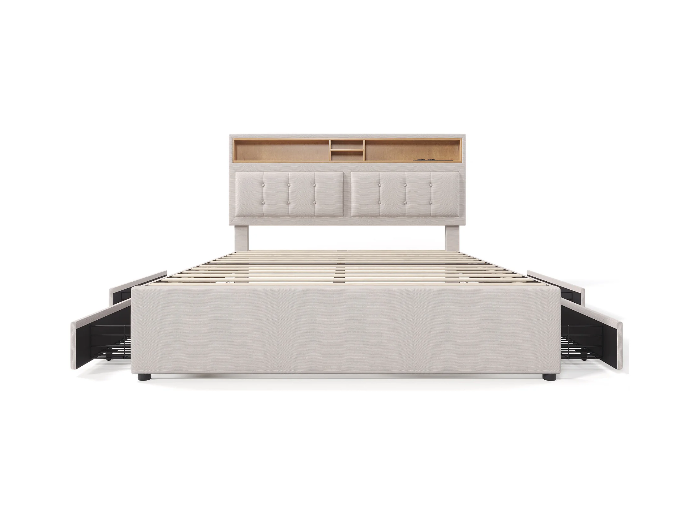 Lit adulte 160x200 cm - Lit double avec USB et 4 tiroirs - Tête de lit réglable - Lin beige