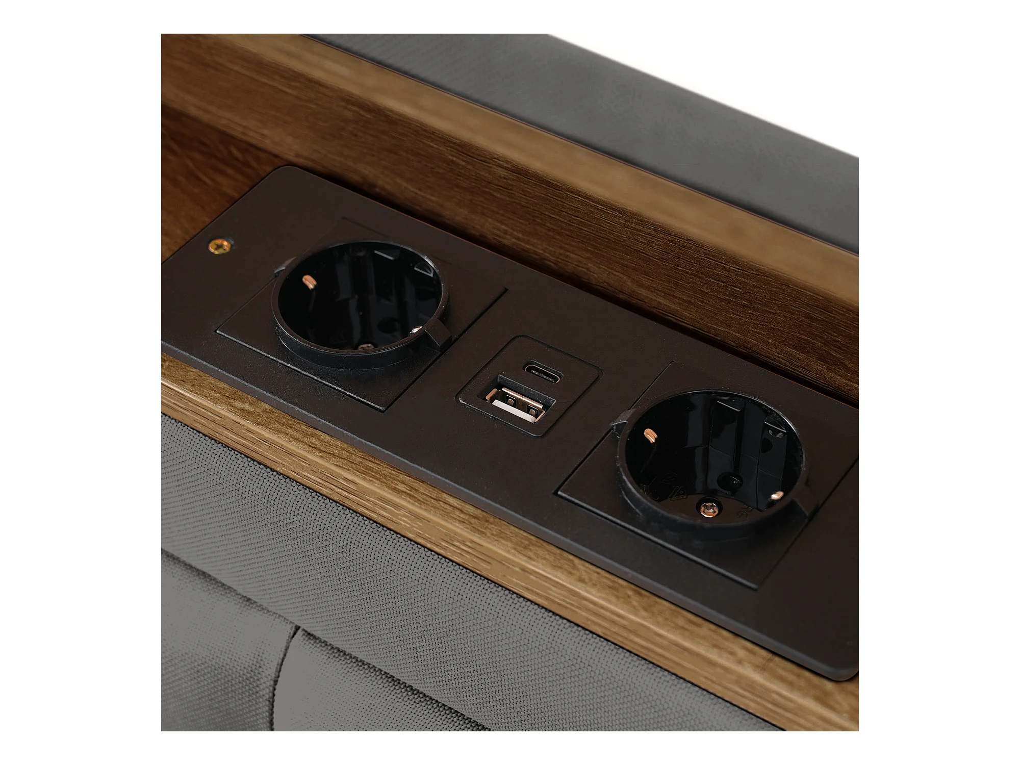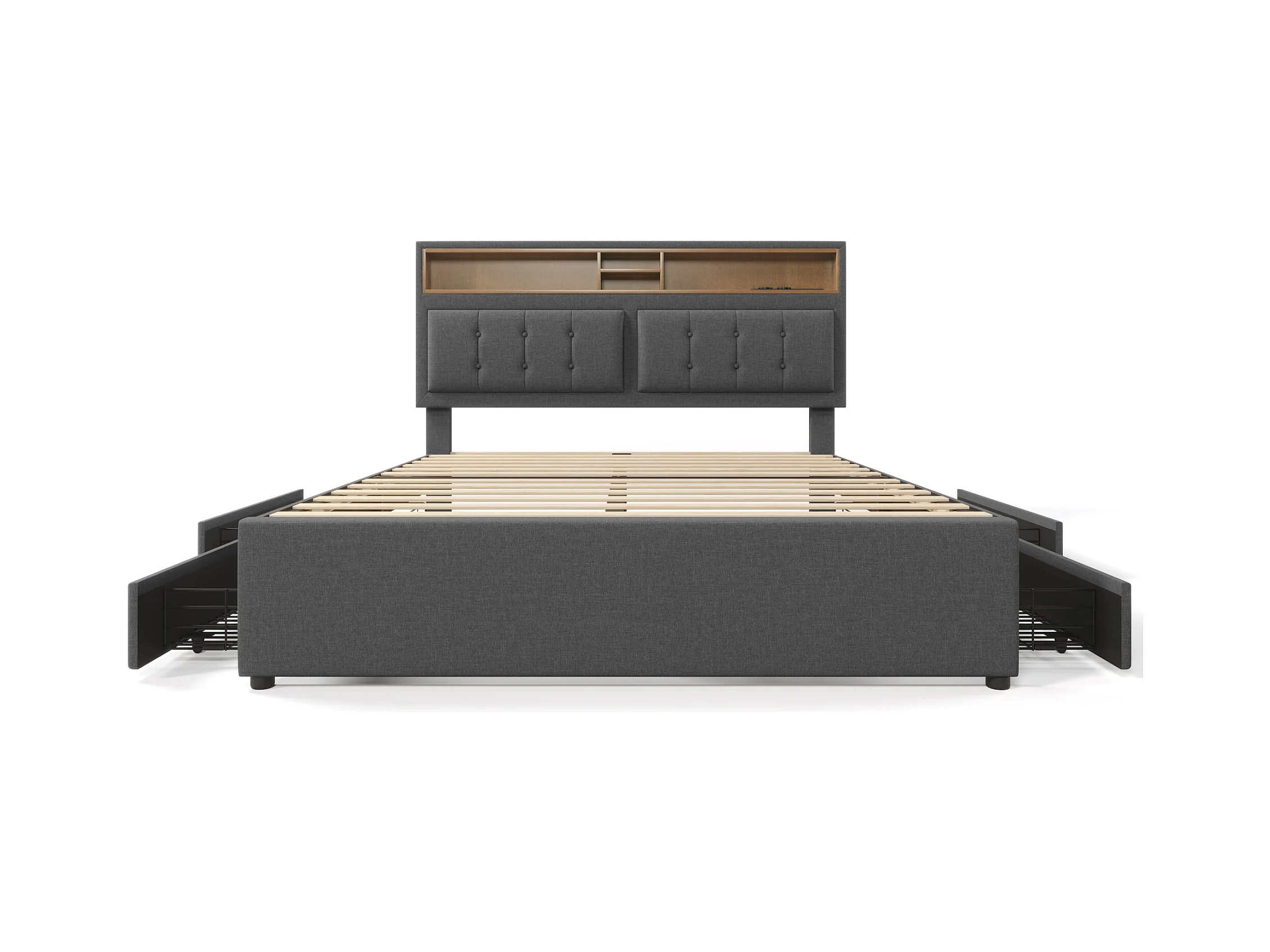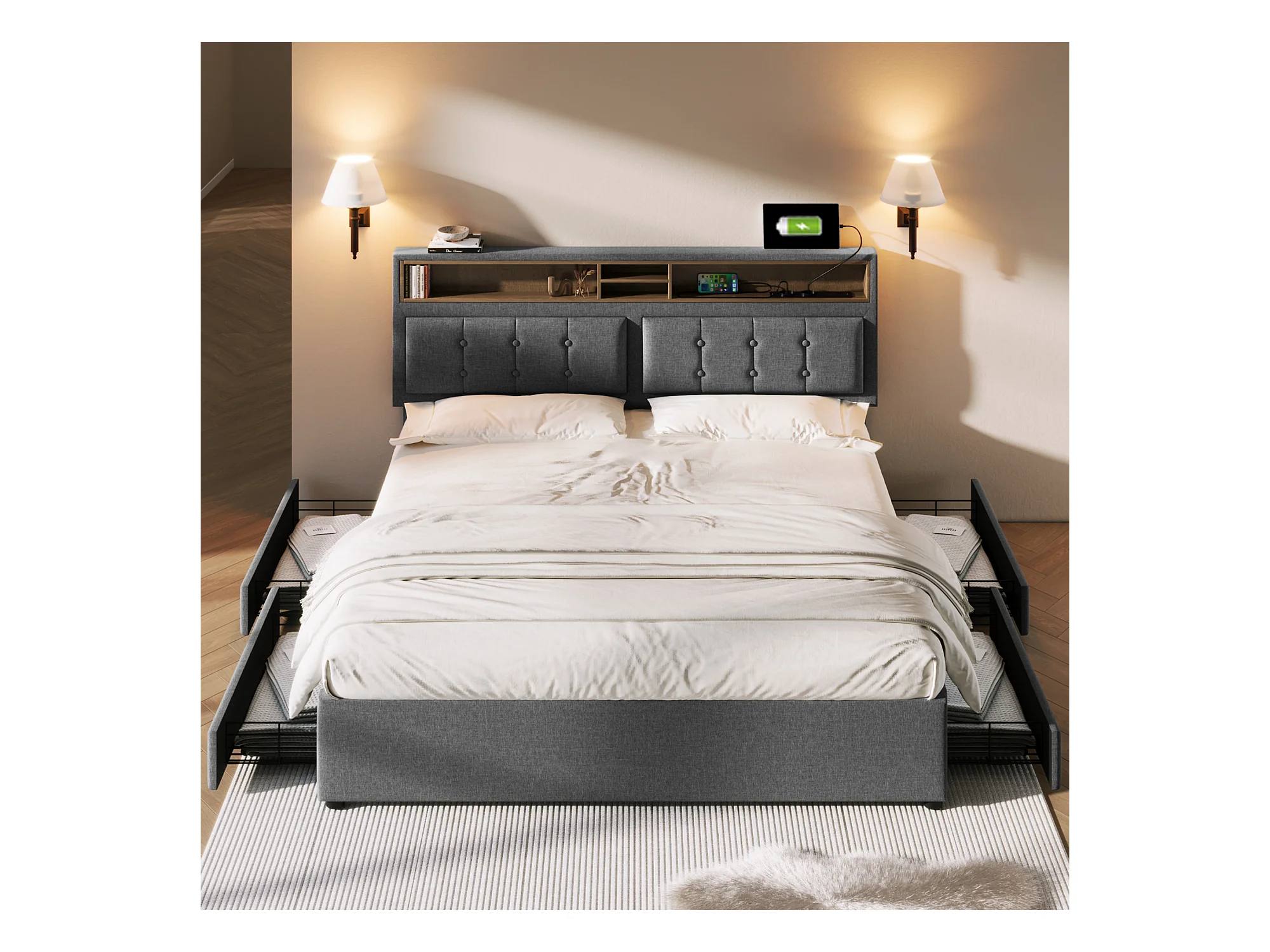 Lit adulte 160x200 cm - Lit double avec USB et 4 tiroirs - Tête de lit réglable - Lin gris