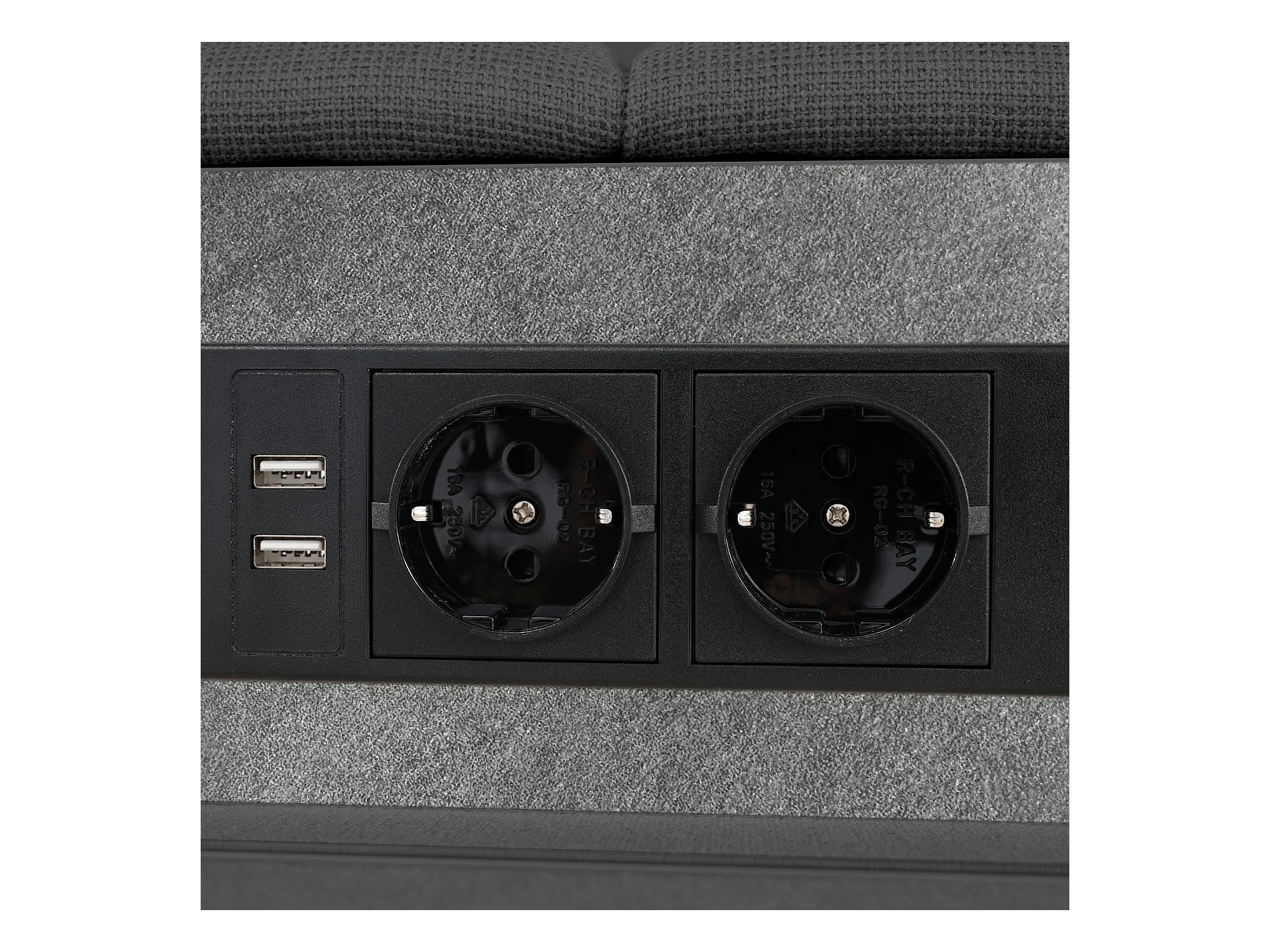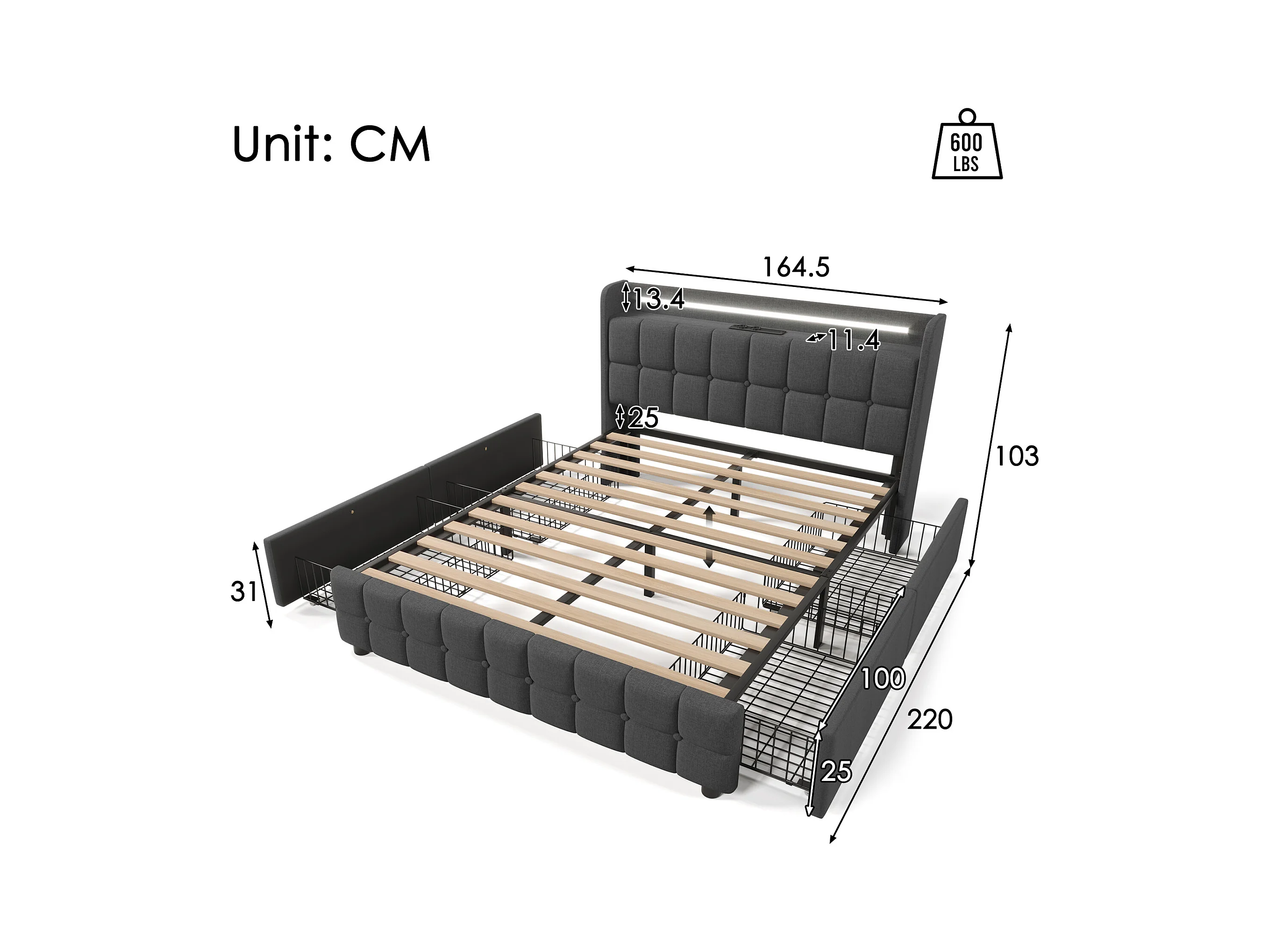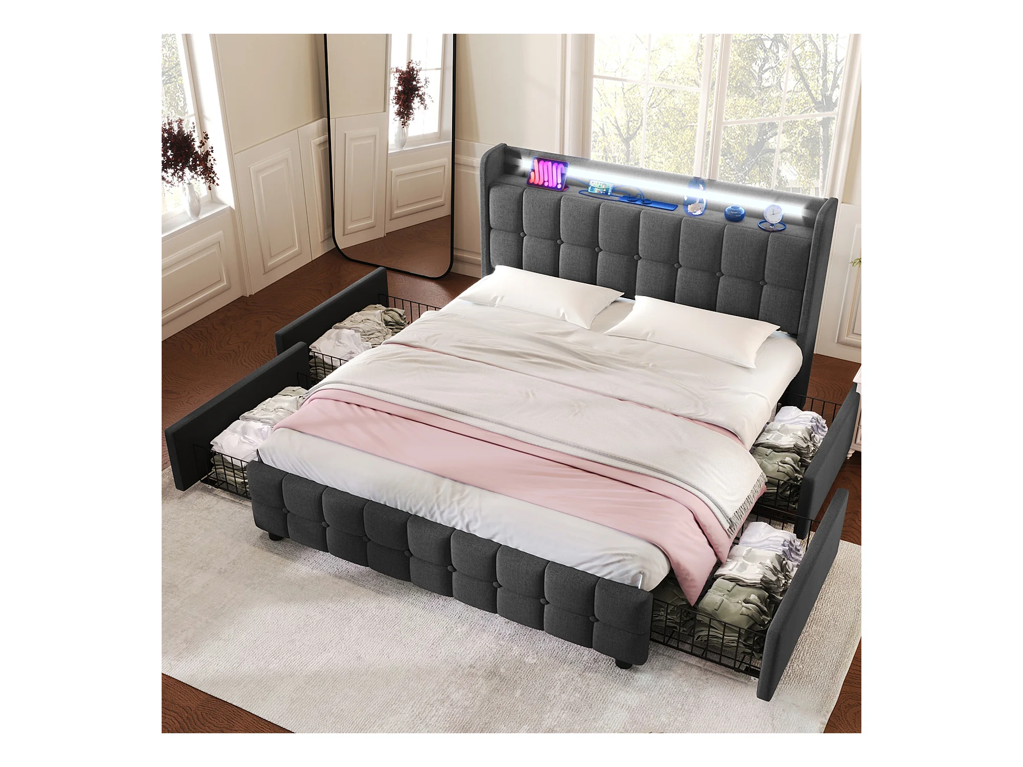 Lit adulte 160x200cm - Lit double avec LED et recharge USB - 4 tiroirs de rangement - lin gris