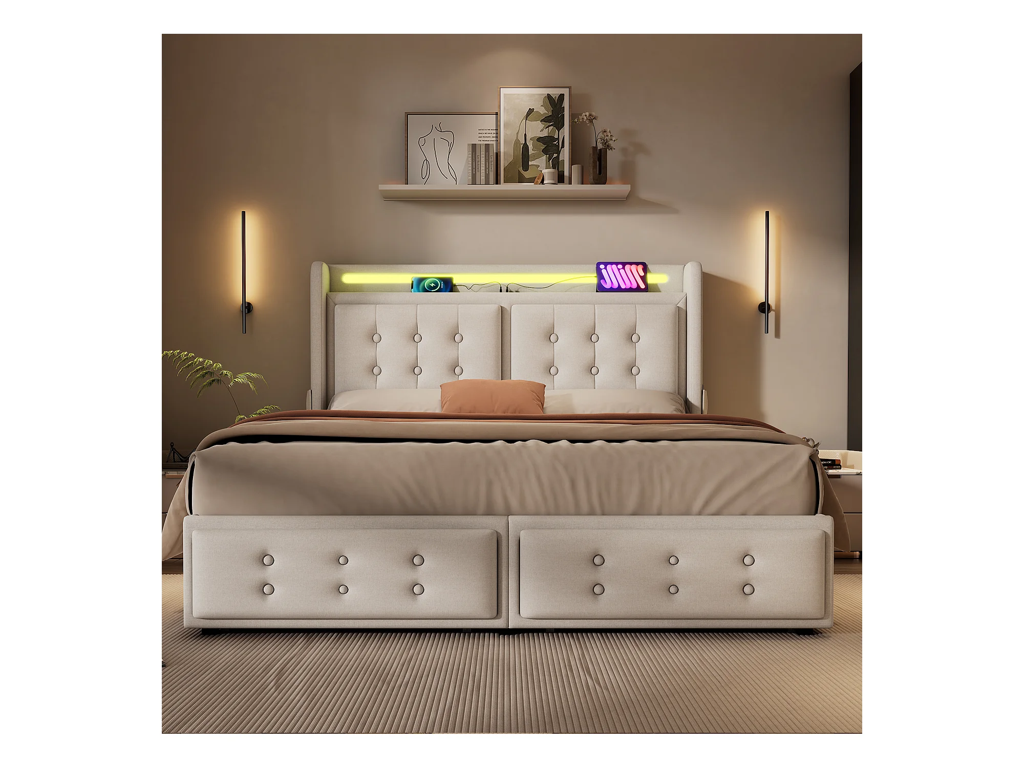 Lit adulte 180x200 cm - Lit double avec prise USB et LED - 4 tiroirs - Coton et lin beige