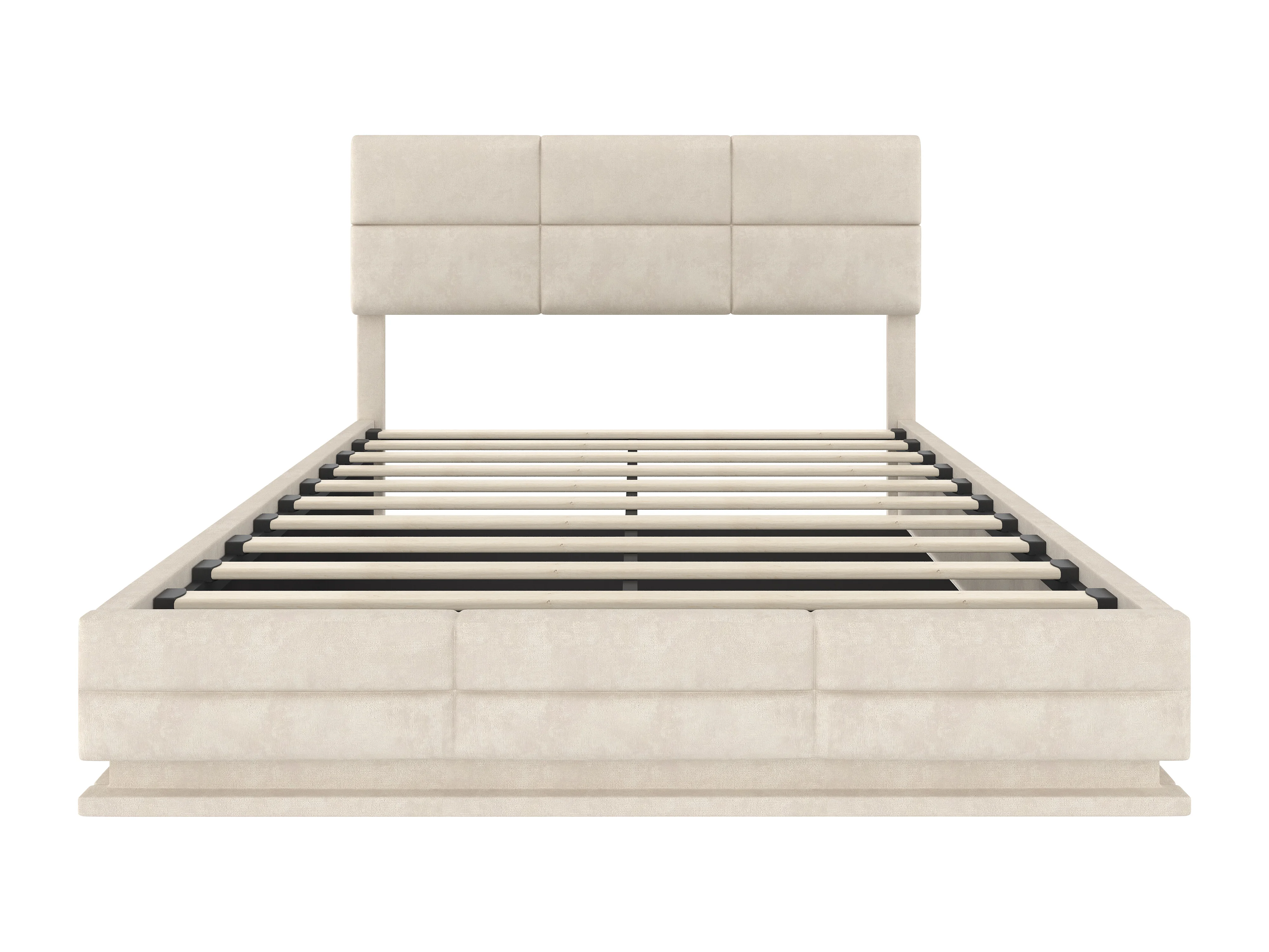 Lit capitonné en velours 140x200 cm, tête de lit réglable, ports USB/Type-C, LED d’ambiance, rangement hydraulique XXL, beige, sans matelas.