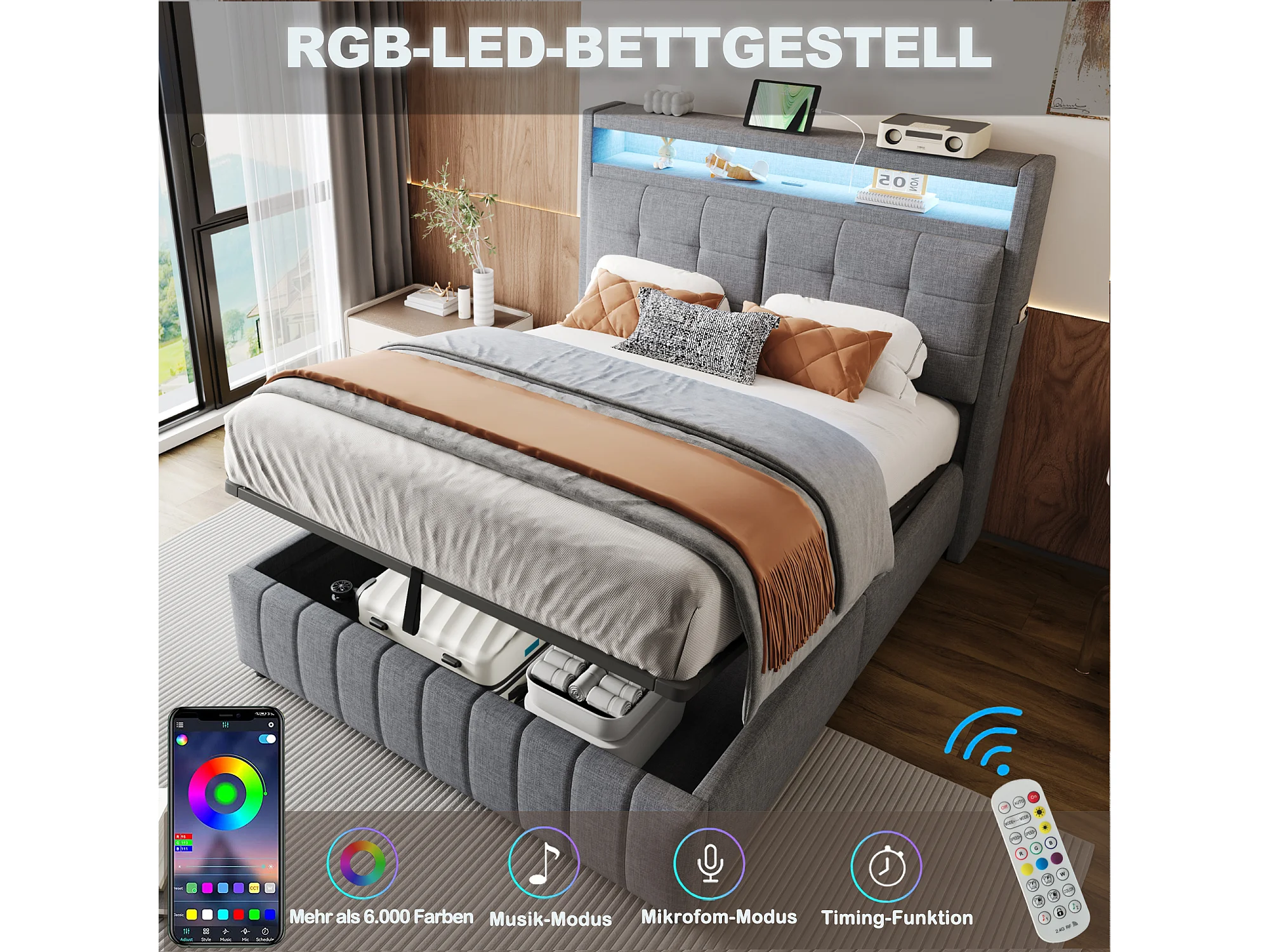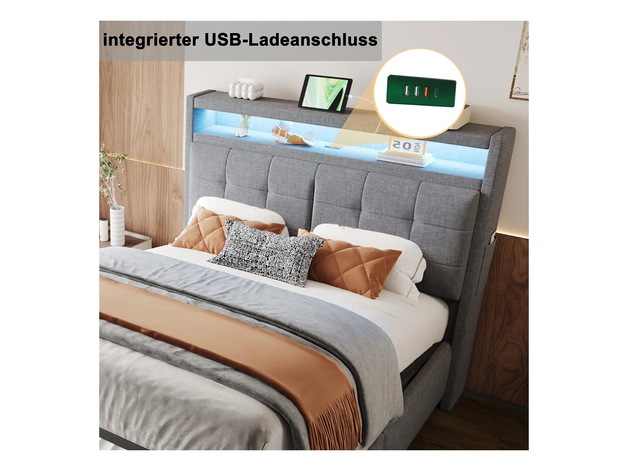 Lit coffre 140 x 200 cm avec tête de lit et compartiments - LEDs et prise USB - Tissu en lin - Gris (sans matelas)