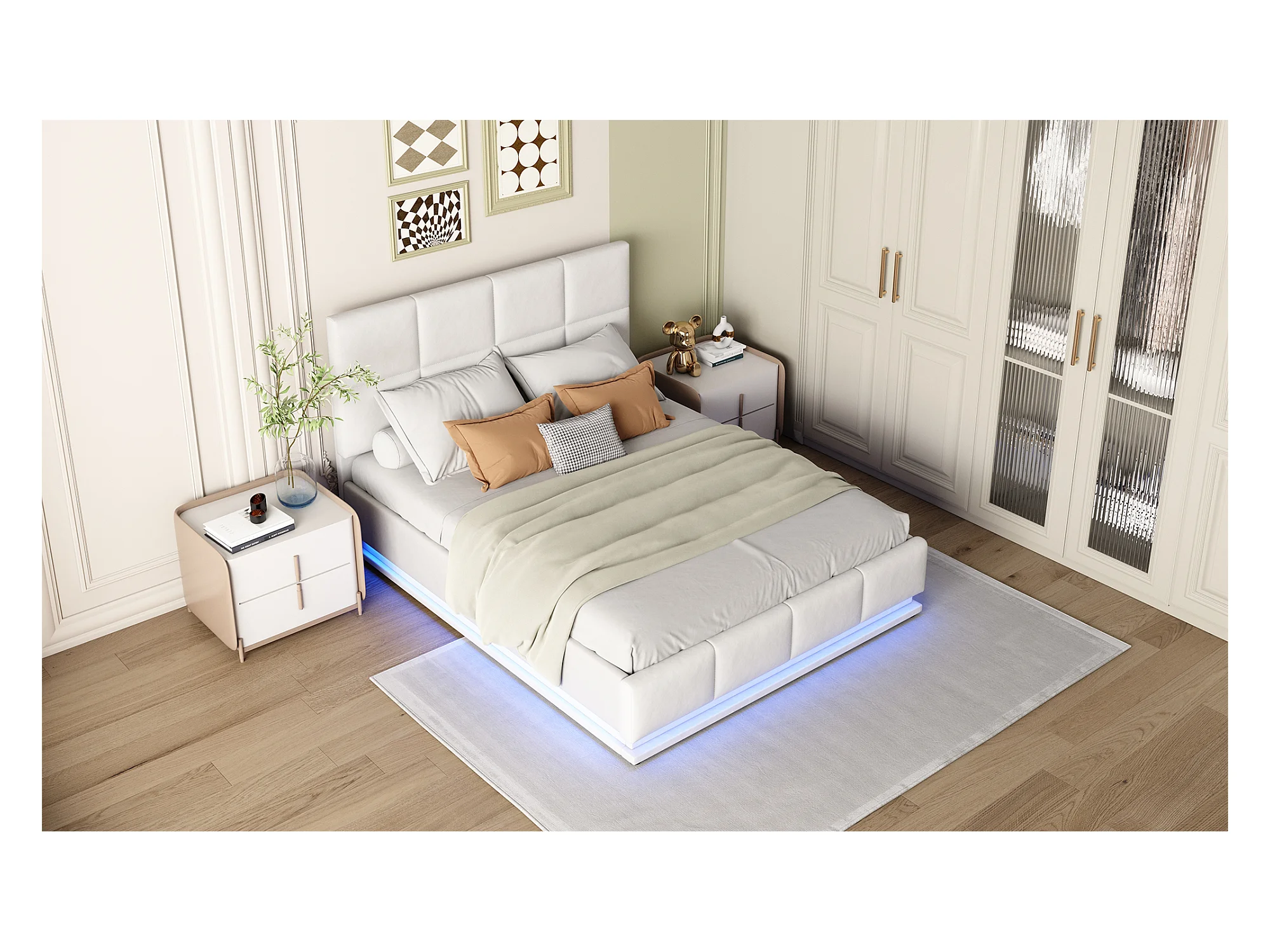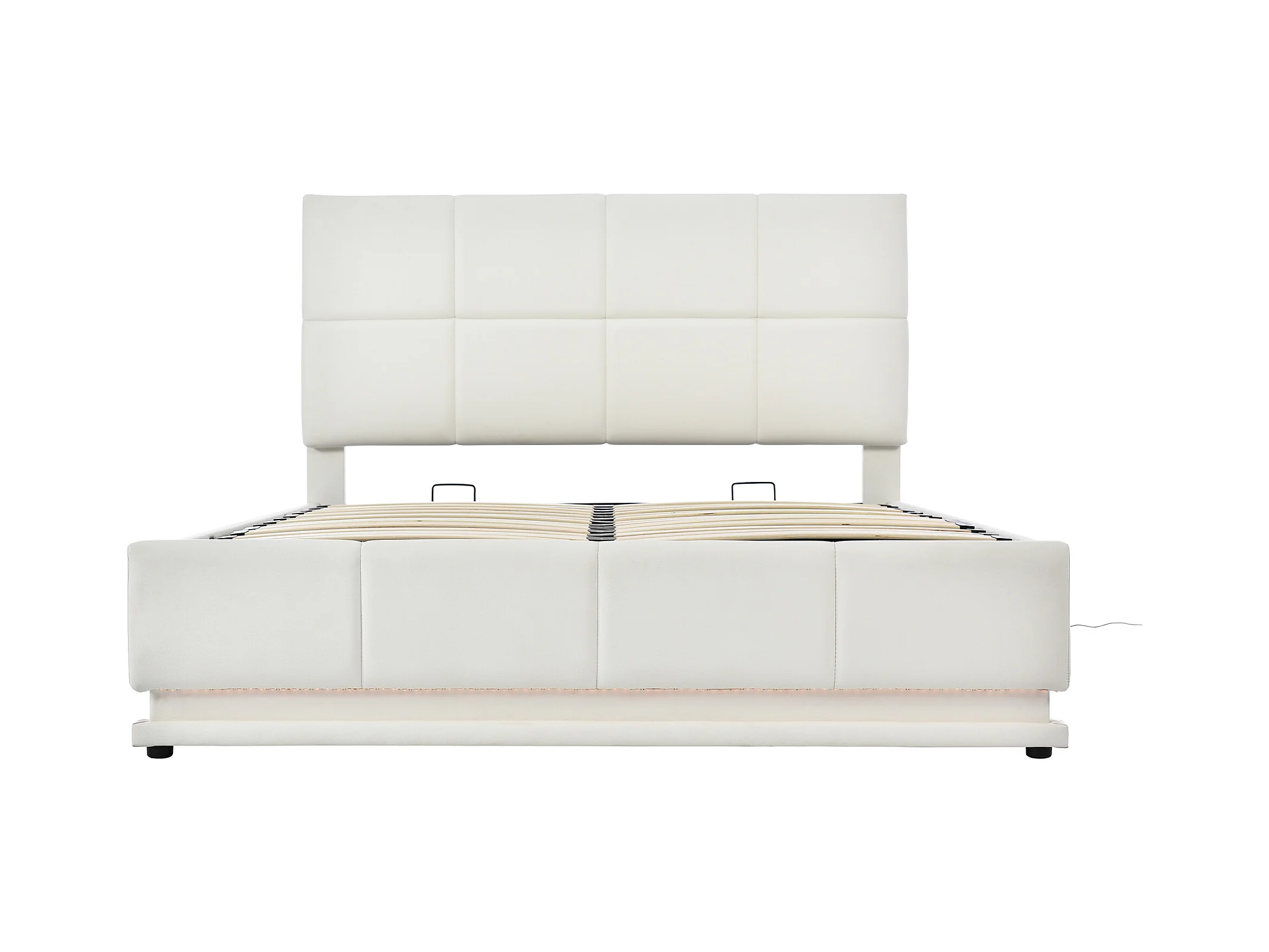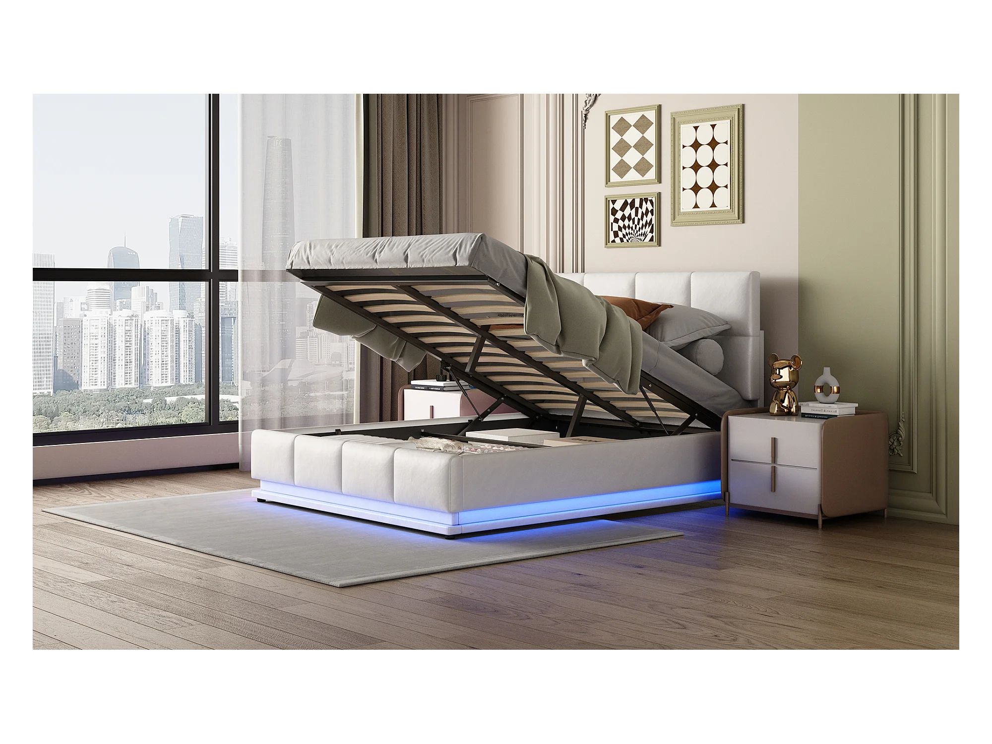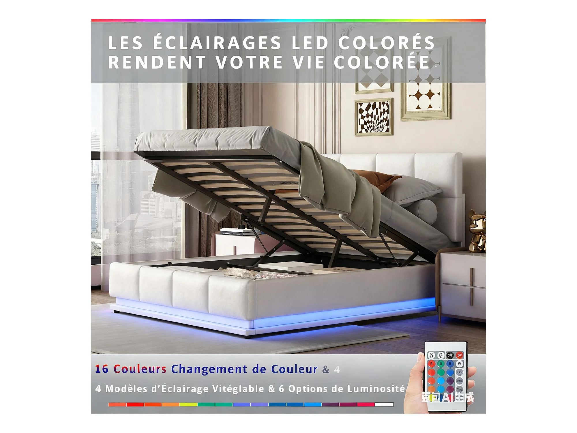Lit coffre 140x190 avec LED, tête de lit réglable, lit 140x190 avec sommier à lattes, cadre de lit double 140x190, tissu en PU, blanc