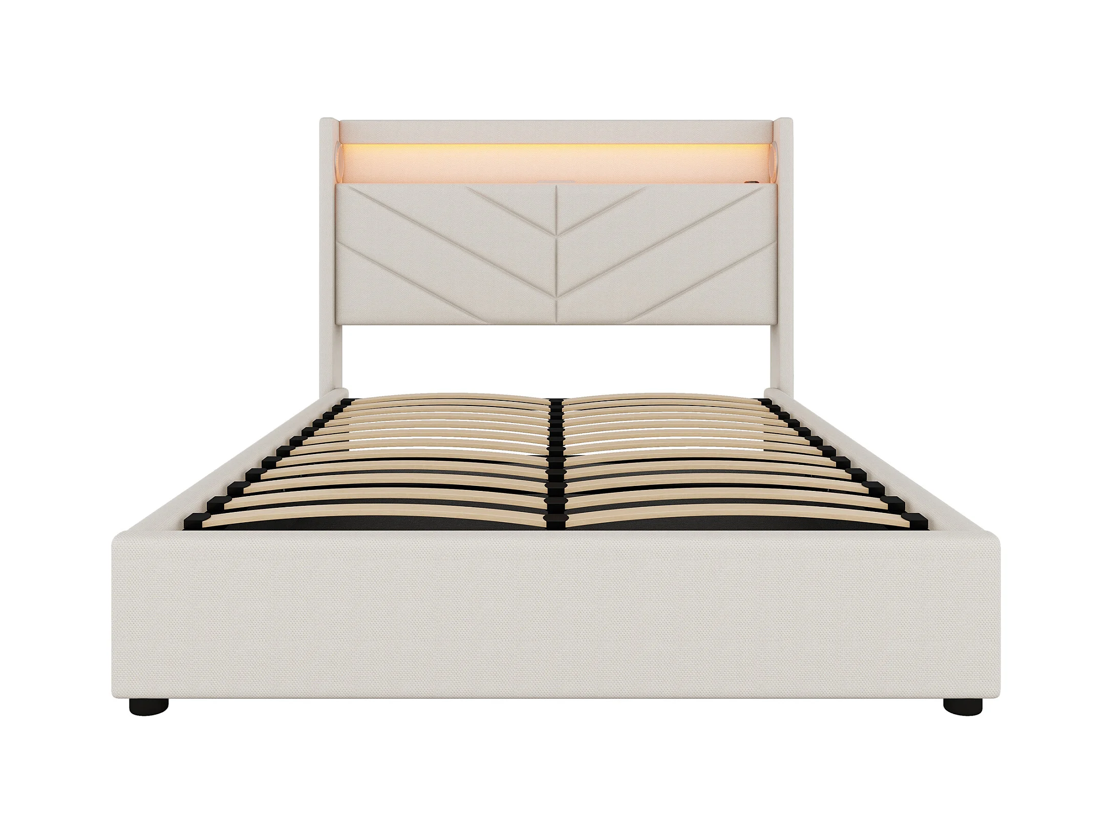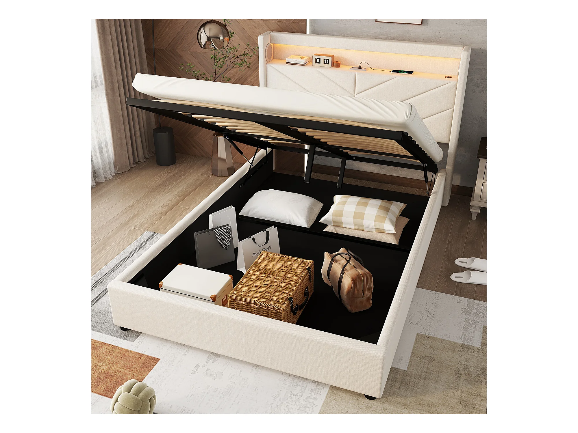Lit coffre 140x190 cm - Lit adulte avec éclairage LED, recharge USB et système audio - lin beige