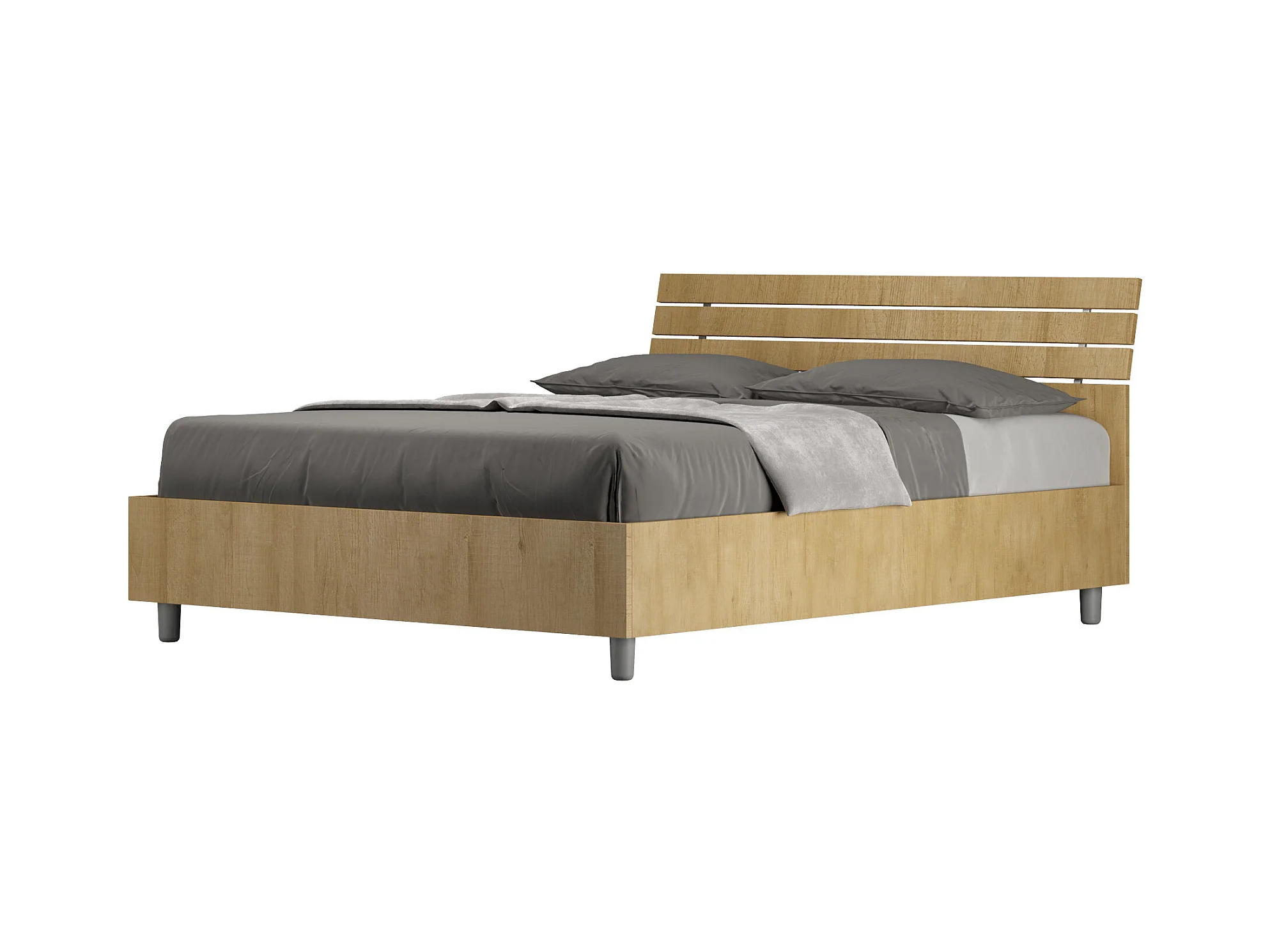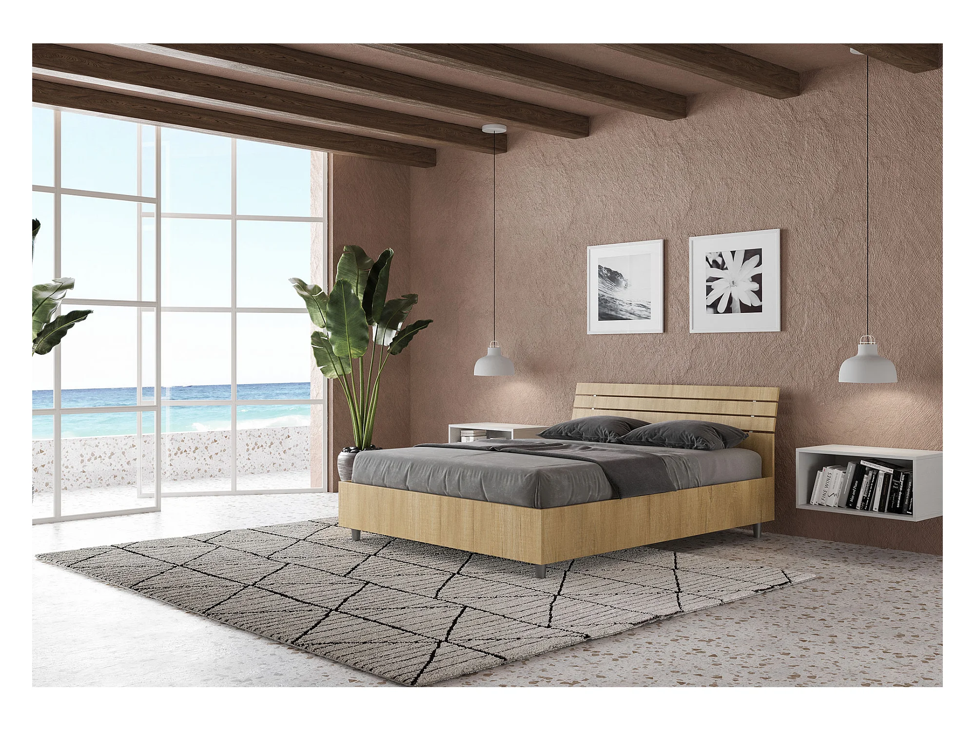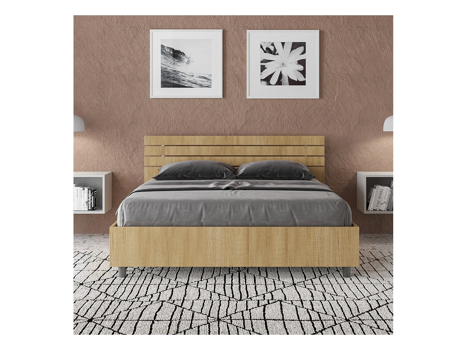 Lit coffre 140x190 tête de lit inclinée avec des lames chêne nature Ankel