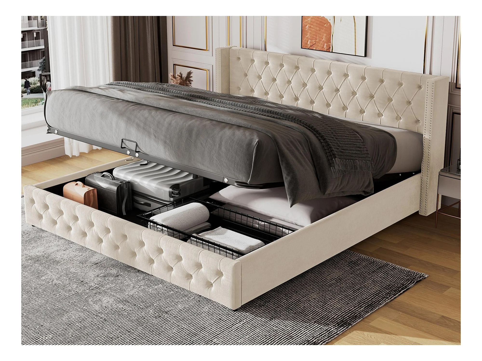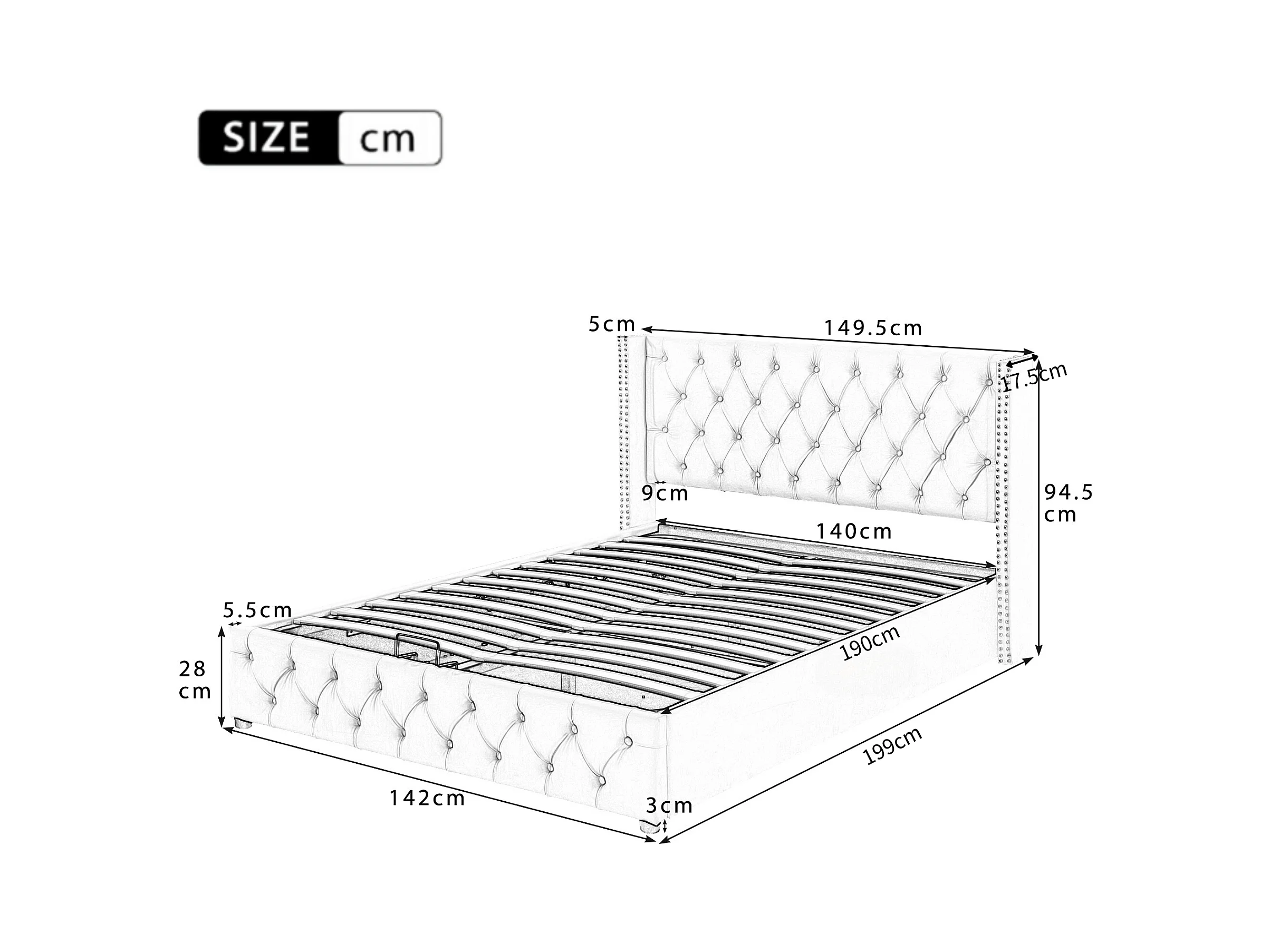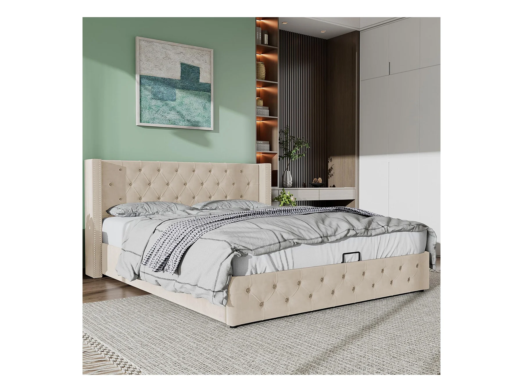 Lit coffre 140x190cm en velours avec sommier à lattes - beige