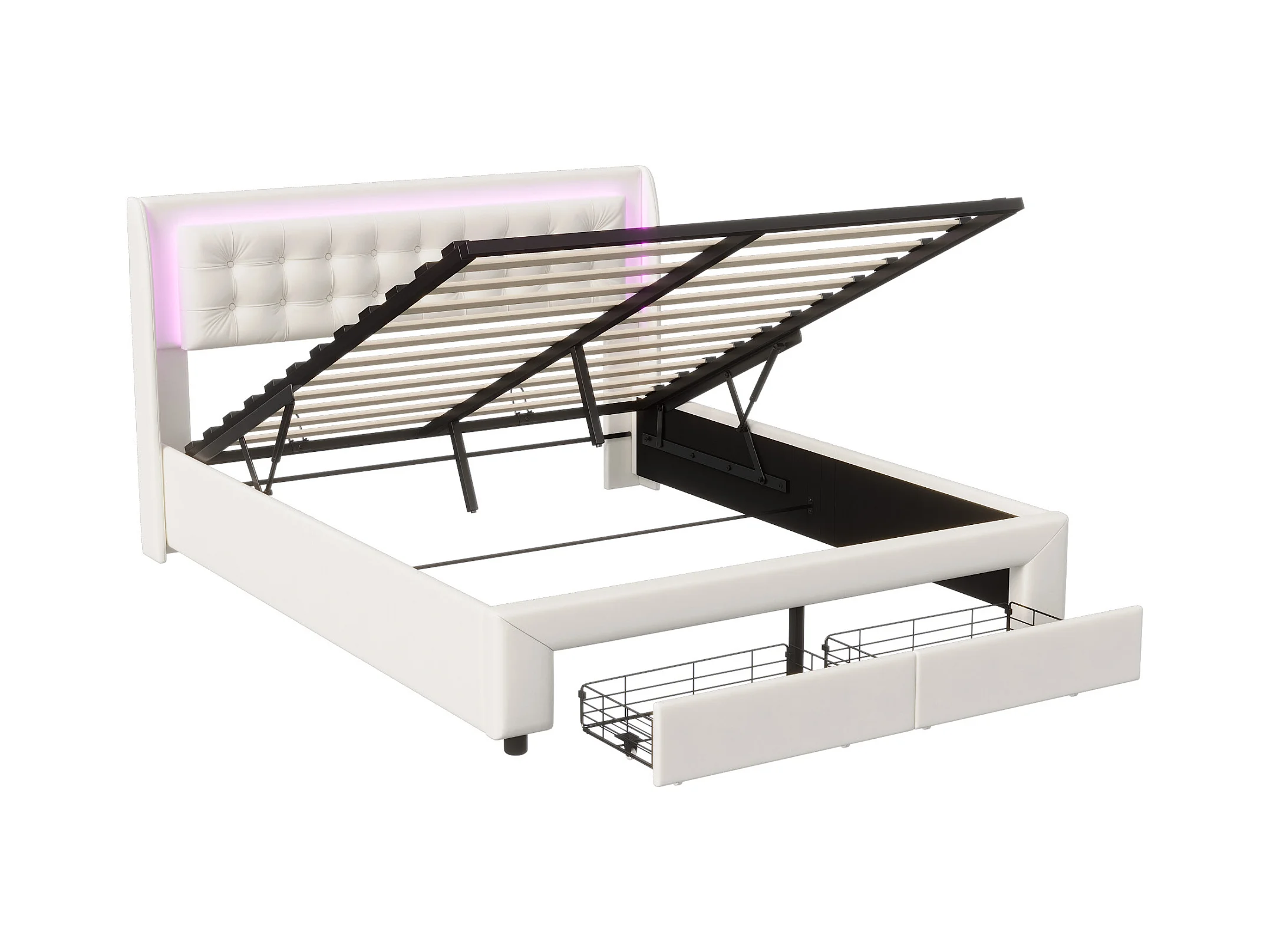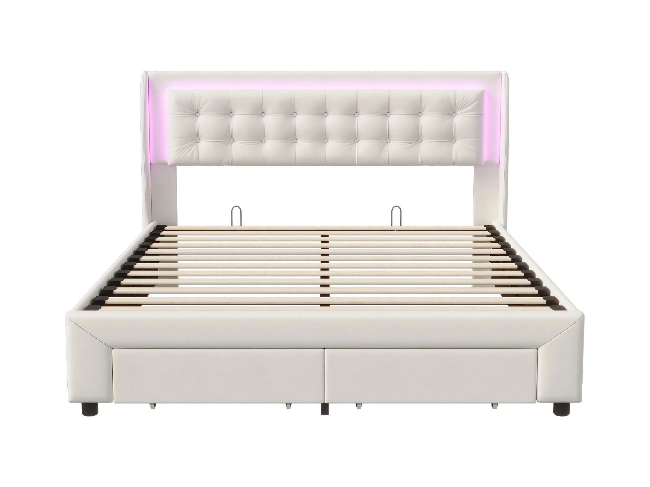 Lit Coffre 140x190cm,Lit Double Avec 2 Tiroirs De Rangement Et LED,Sommier à Lattes, Velours, Beige