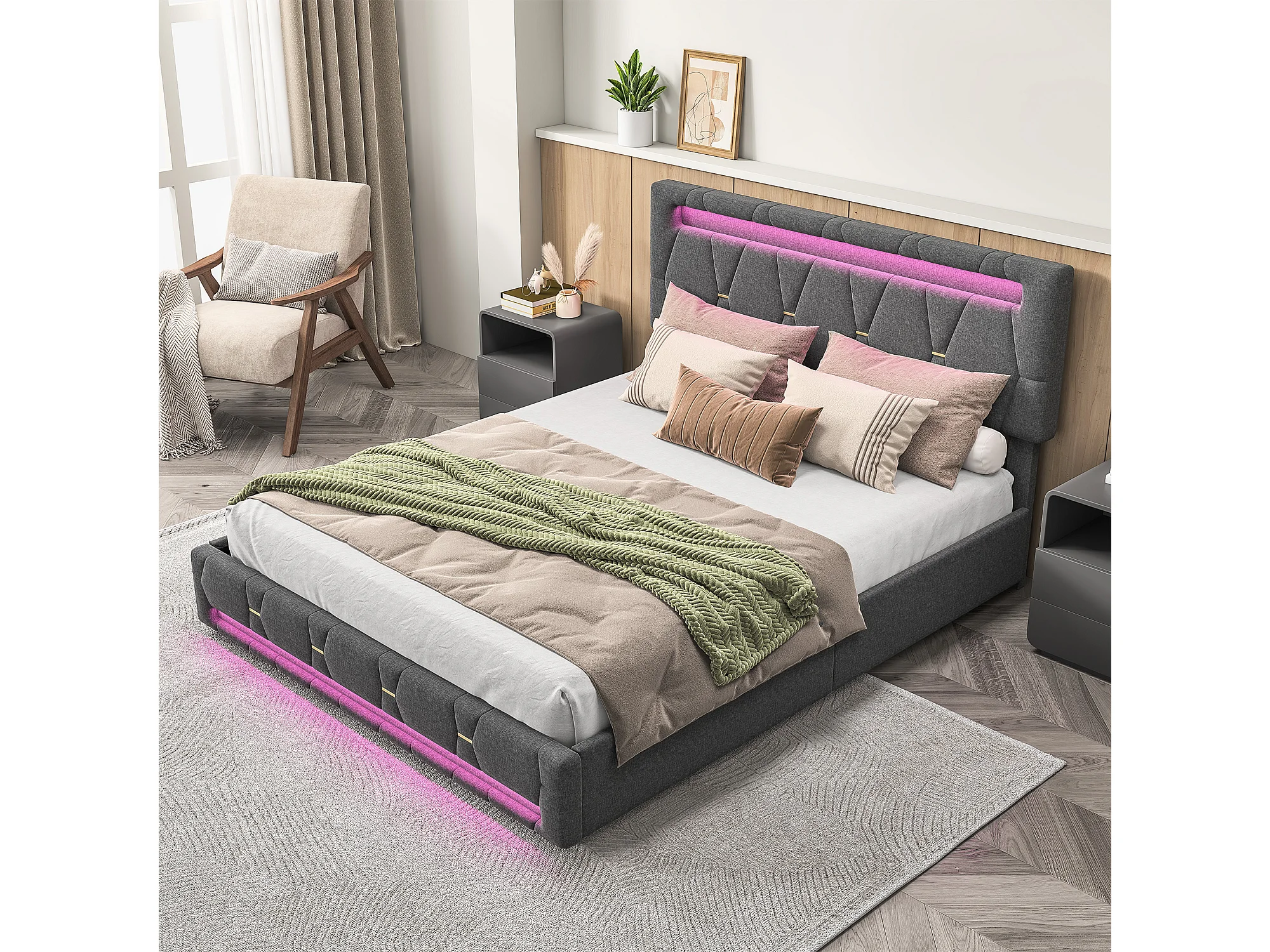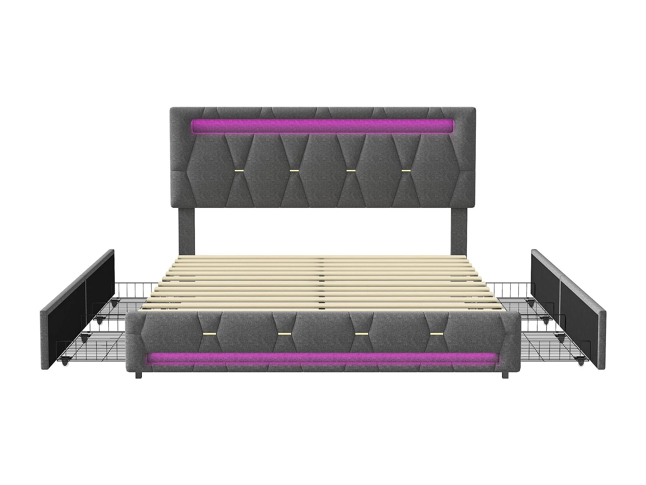 Lit Coffre 140x200 Avec USB Et 4 Tiroirs, Lit Capitonné Avec Sommier à Lattes, Lit Double, Gris