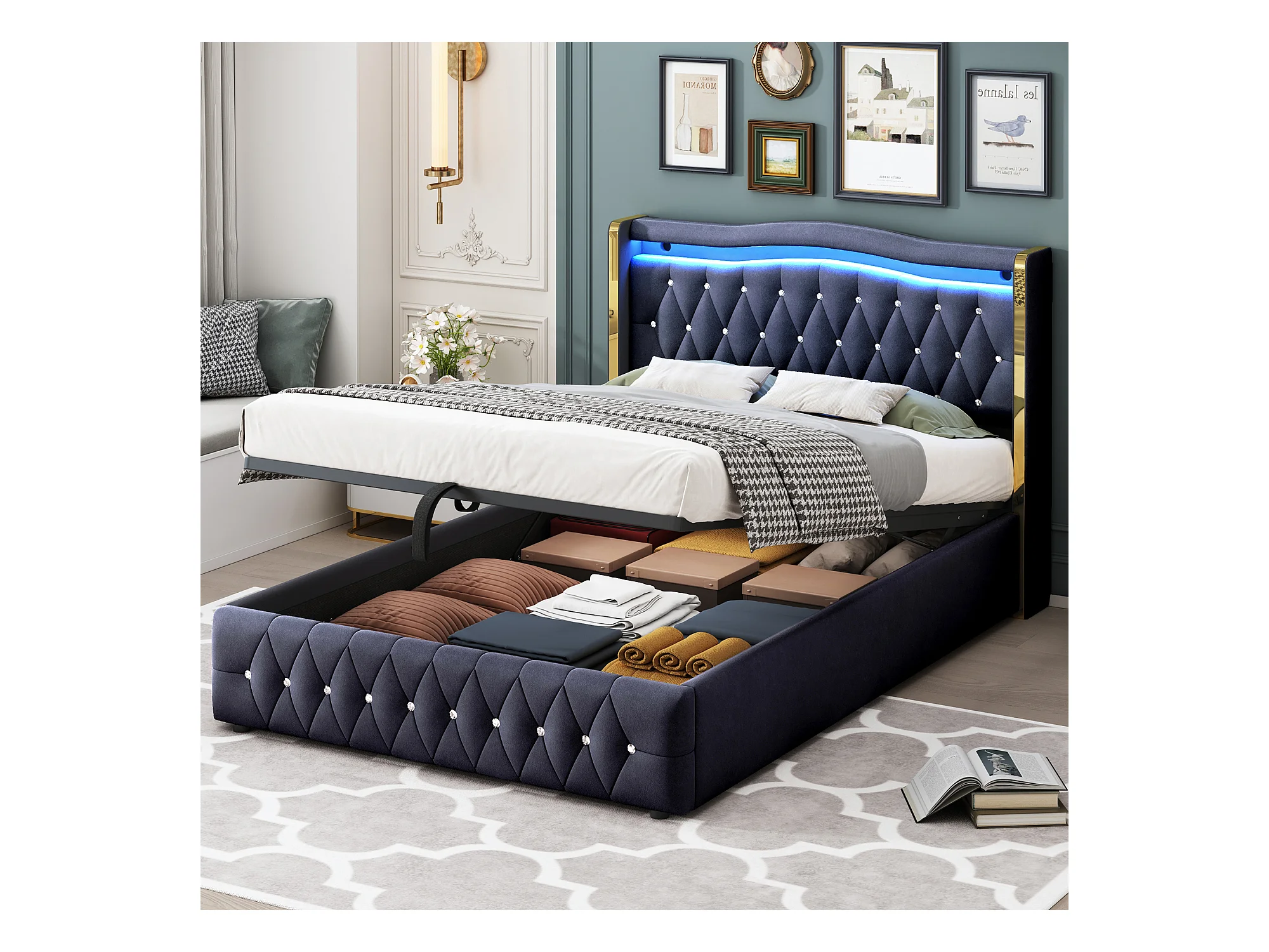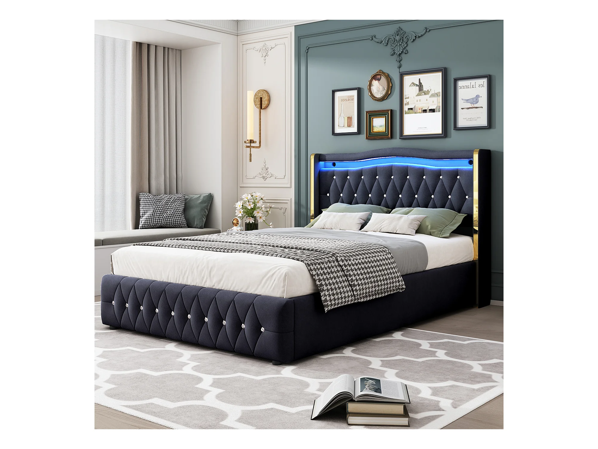 Lit coffre 140x200 cm avec tête de lit décorée de strass et éclairage LED, velours noir - sans matelas