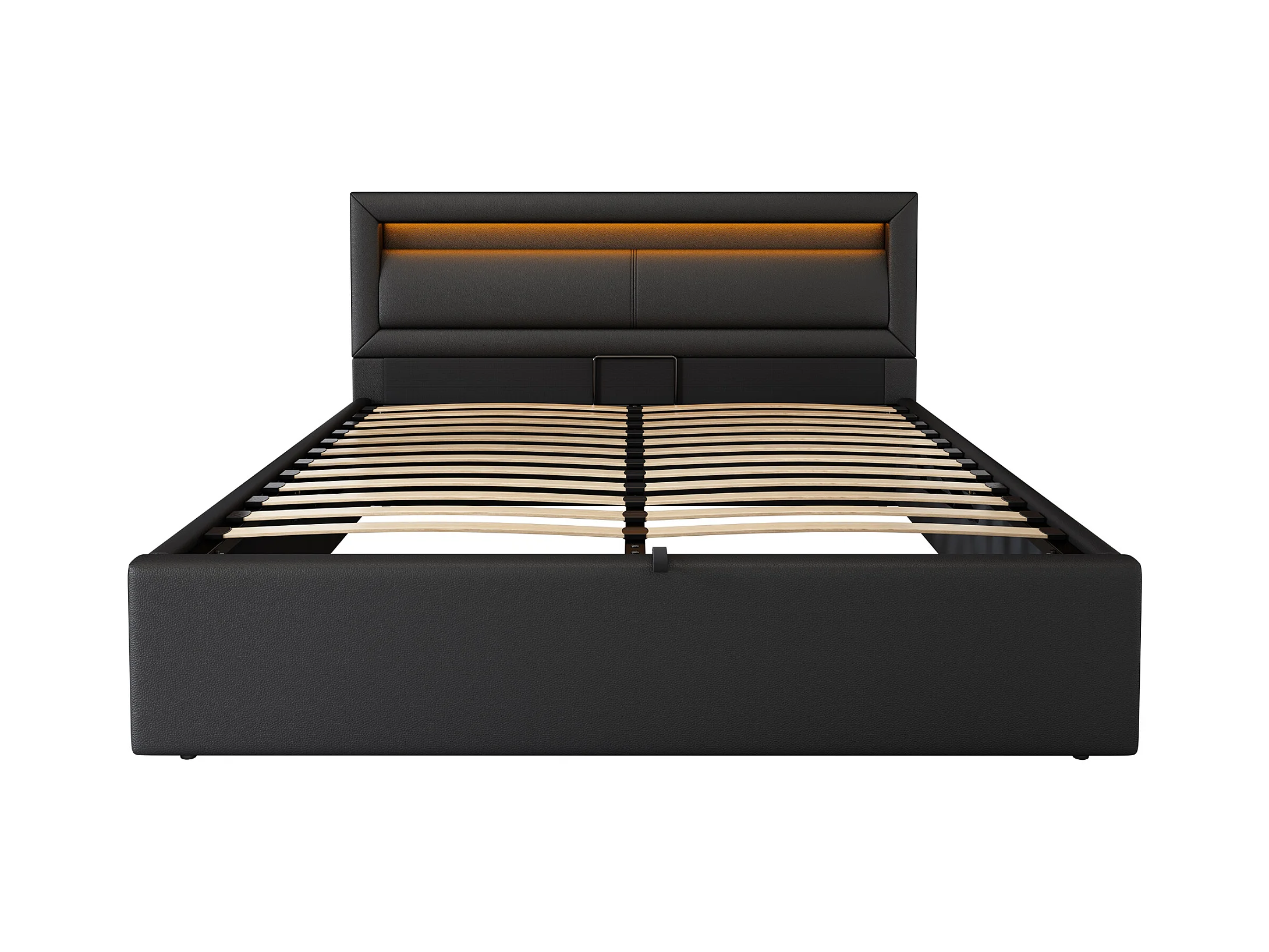 Lit coffre 140x200 cm - Lit adulte avec tête de lit et sommier à lattes - éclairage LED - PU noir