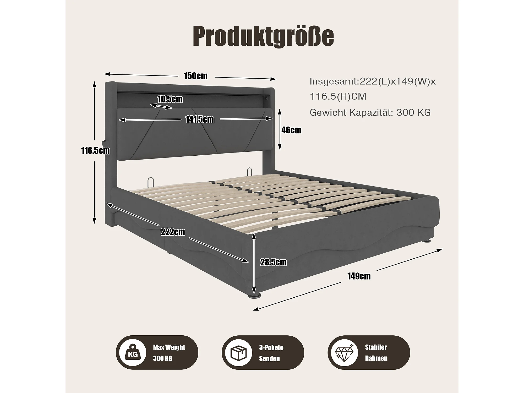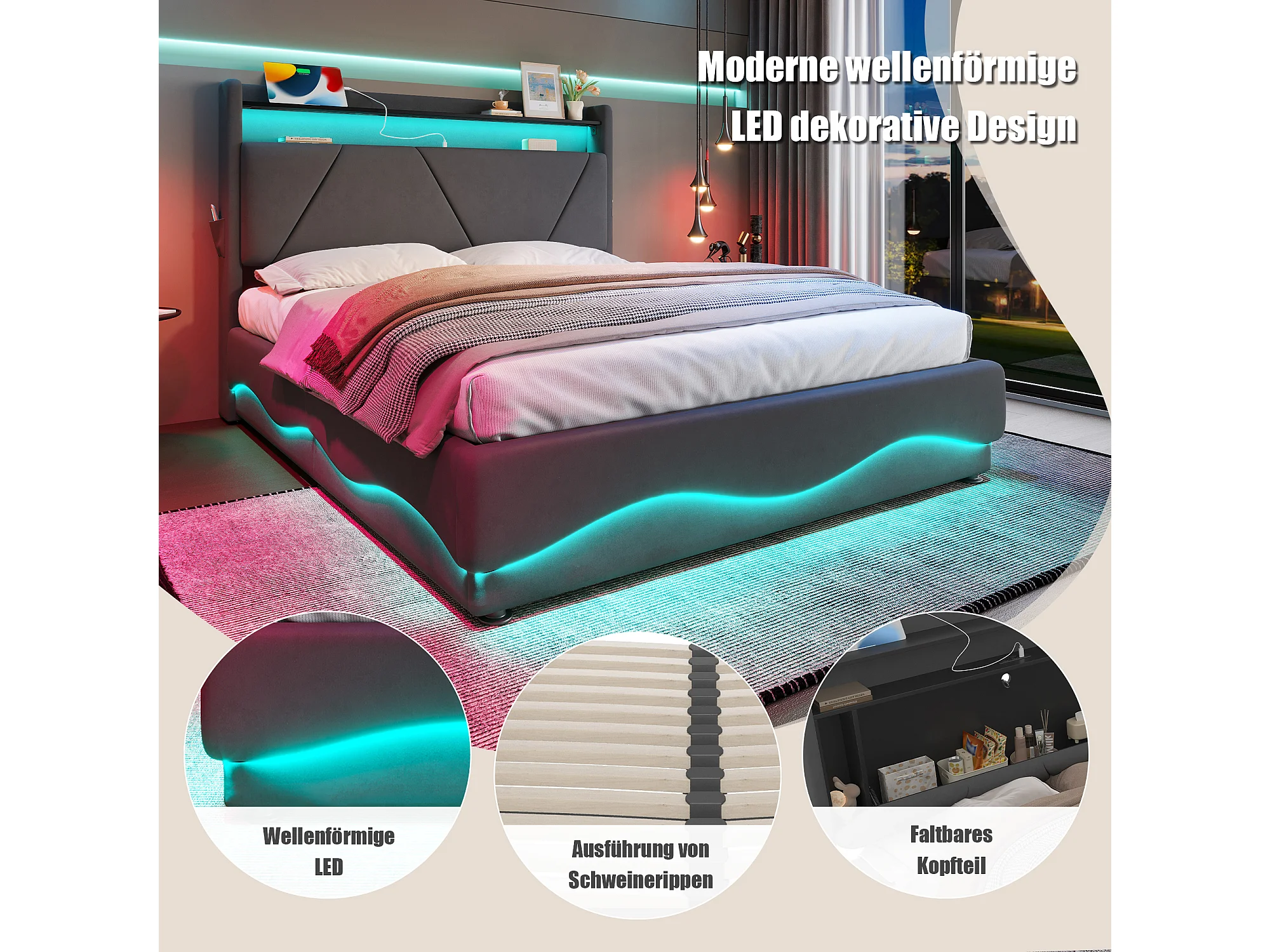 Lit Coffre Rembourré 140×200 Cm Velours Gris Foncé –Étagère tête de lit - LED/USB‑C – Grand Coffre Sous Sommier – Style Contemporain