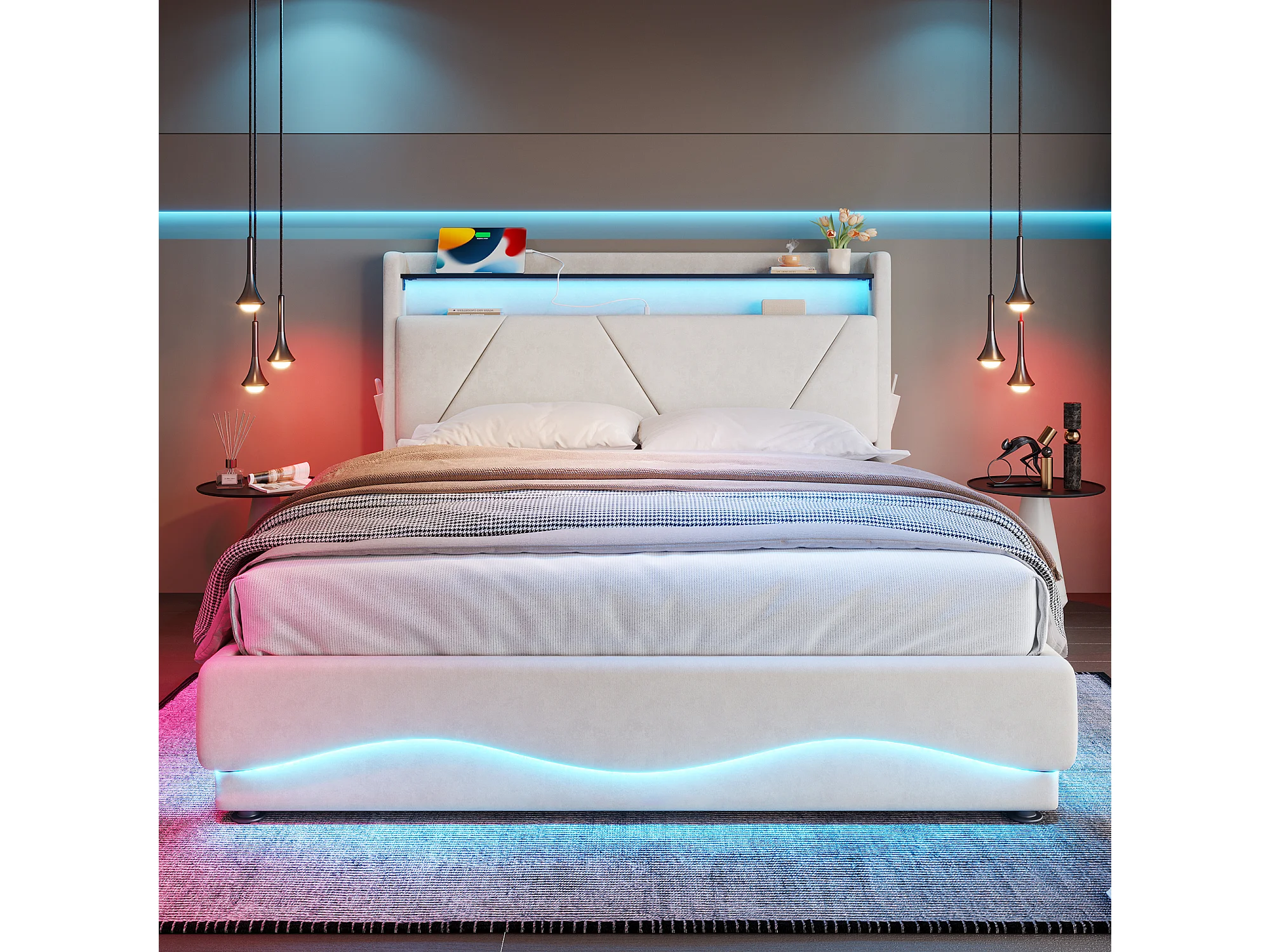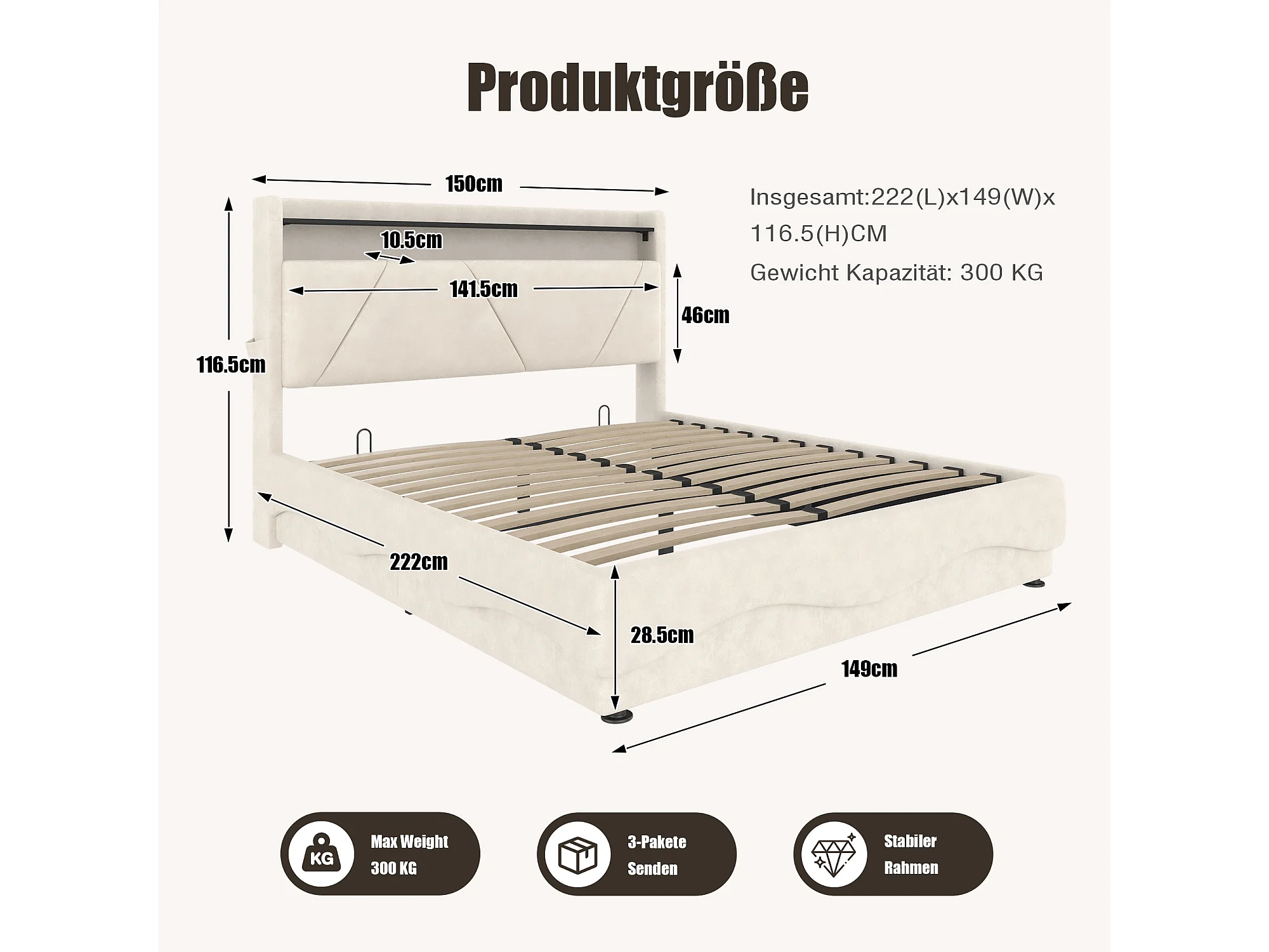 Lit Coffre Rembourré 140×200 Cm Velours Beige –Étagère tête de lit - LED/USB‑C – Grand Coffre Sous Sommier – Style Contemporain