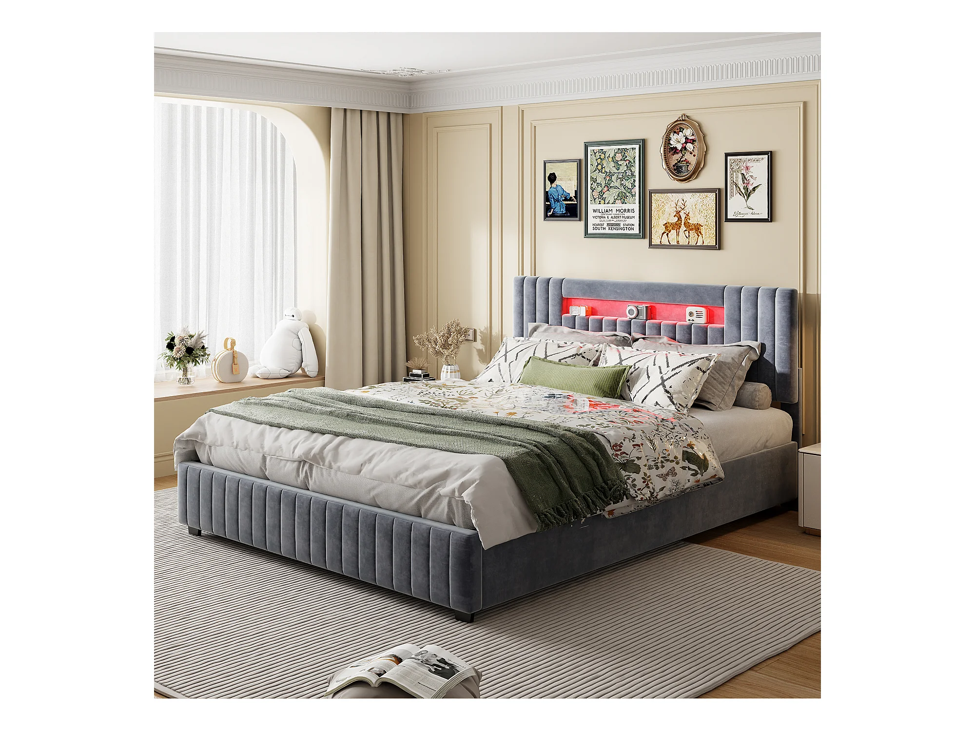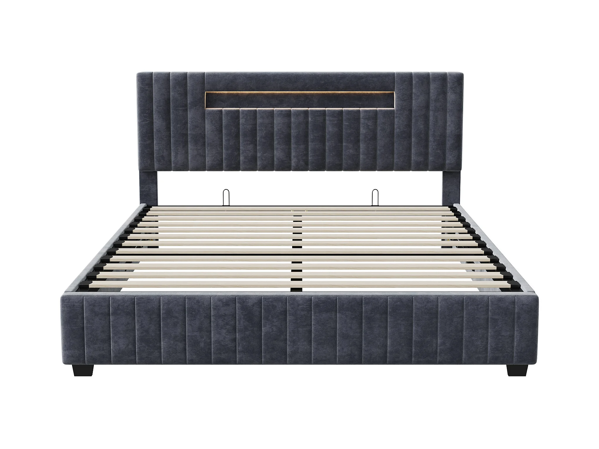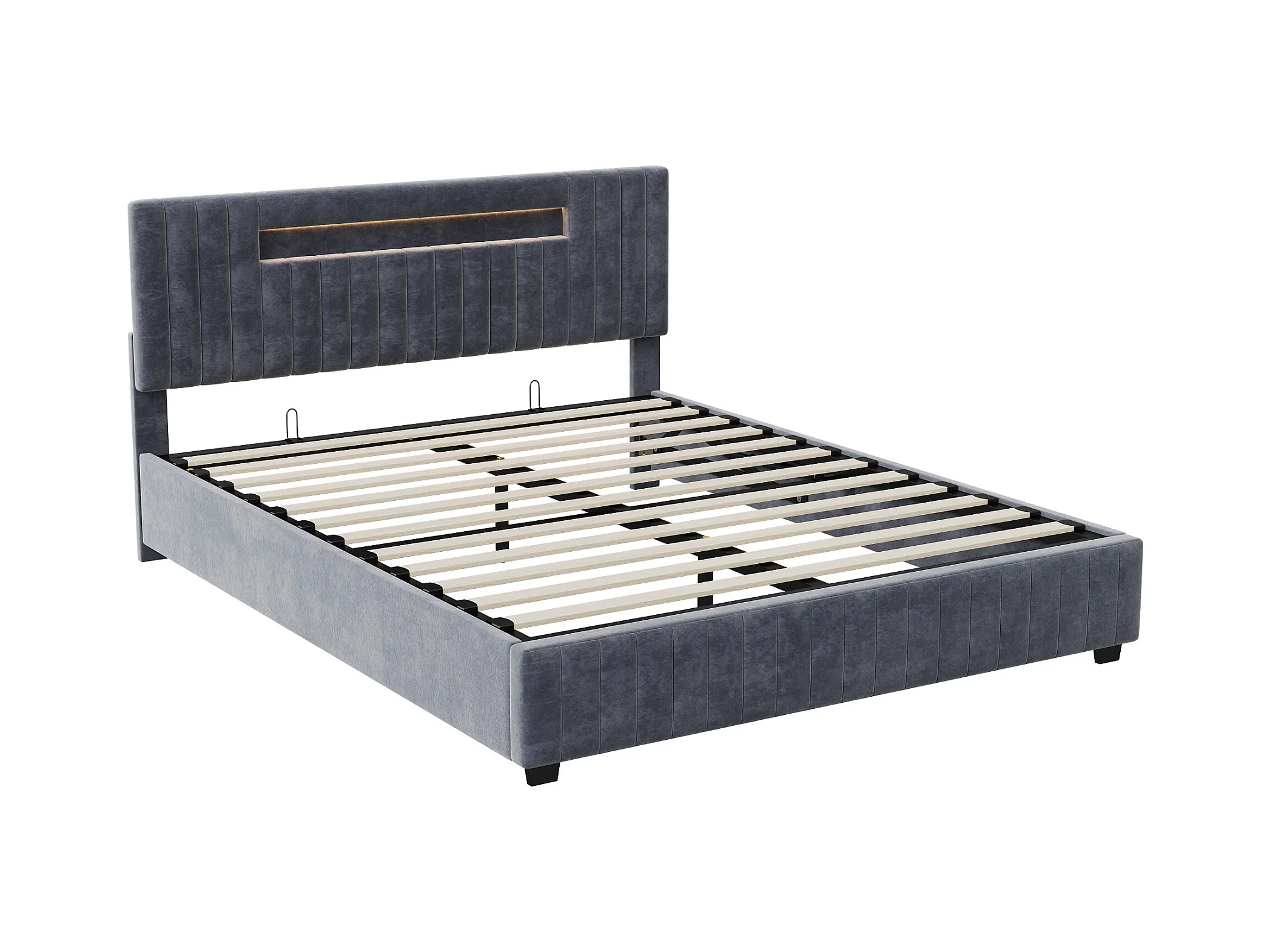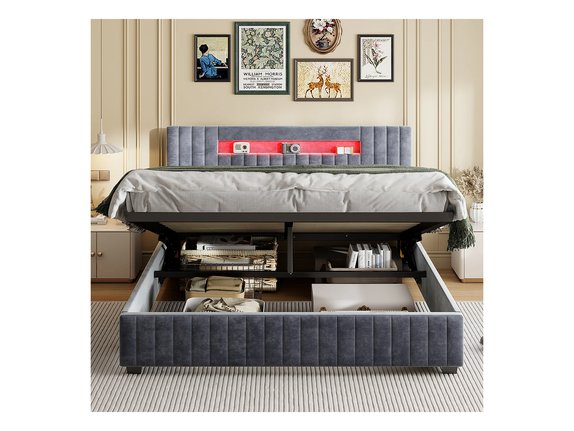 Lit coffre 140x200cm - Lit double avec tête de lit LED avec rangemet, en tissu velours gris