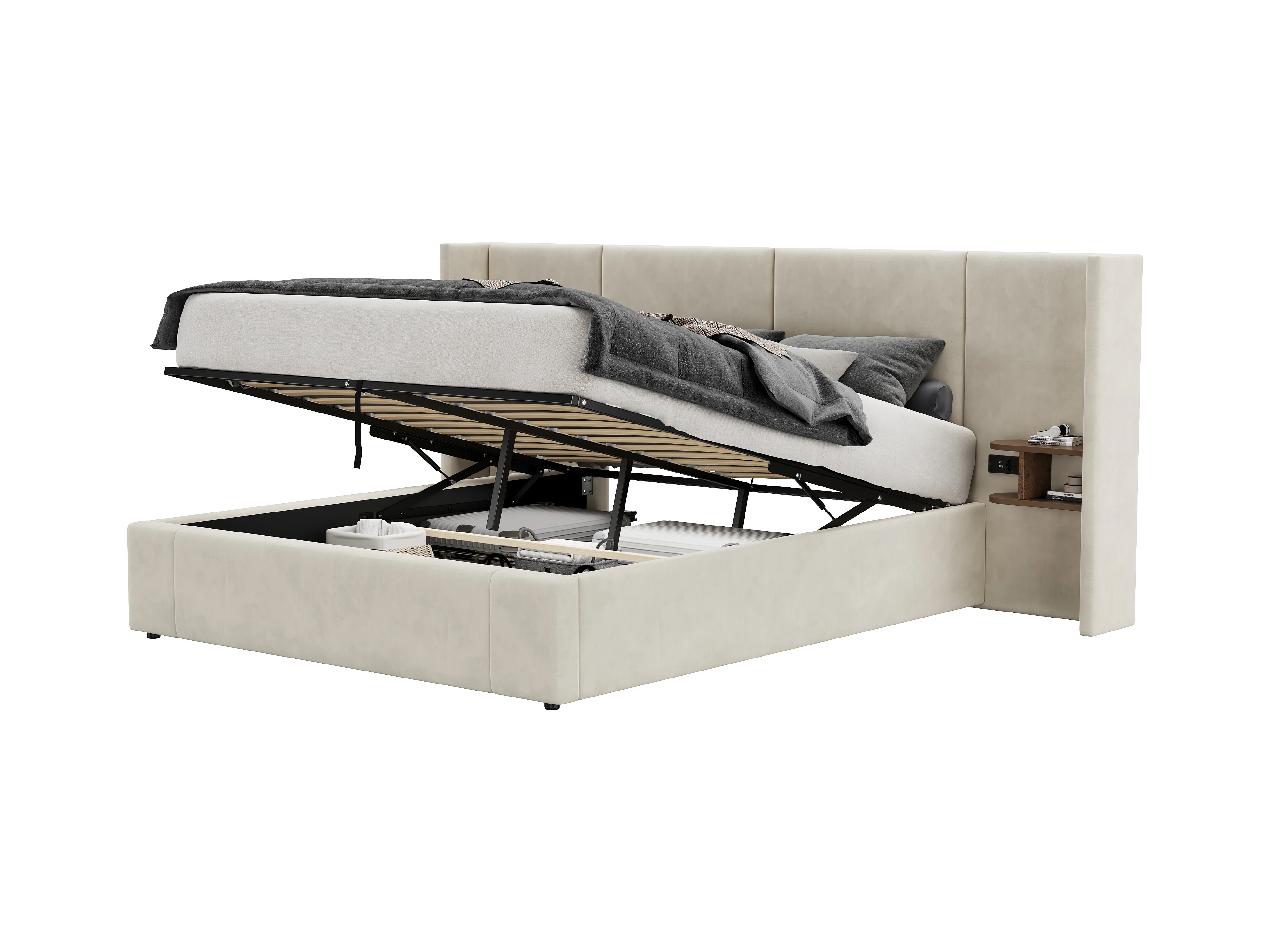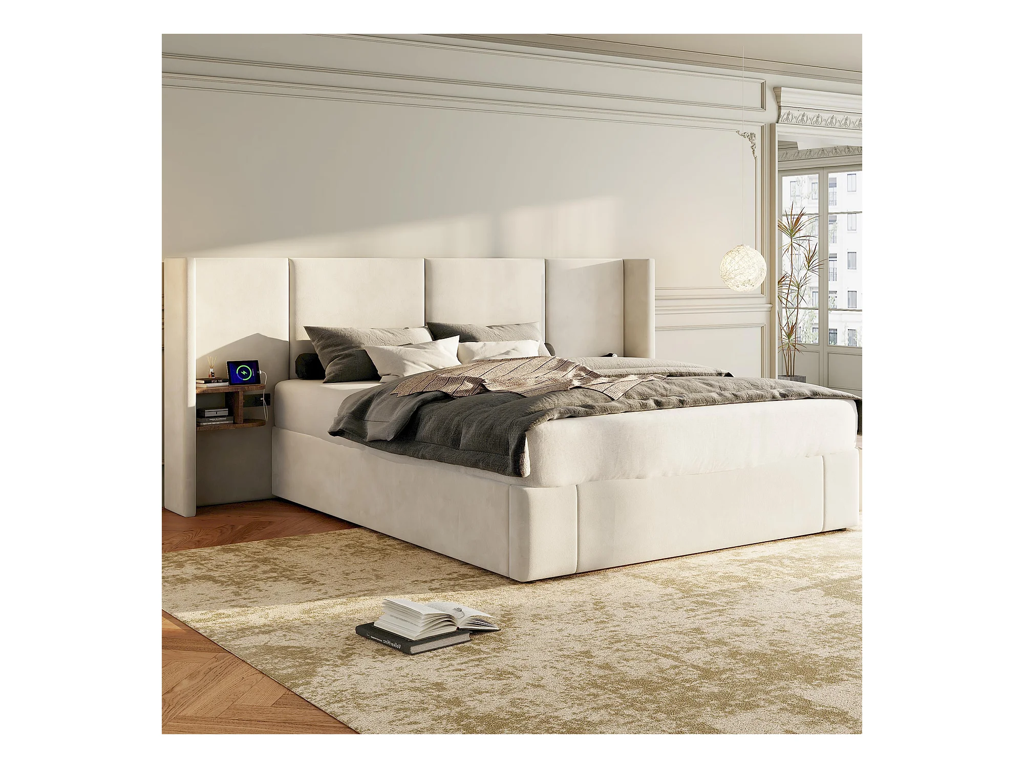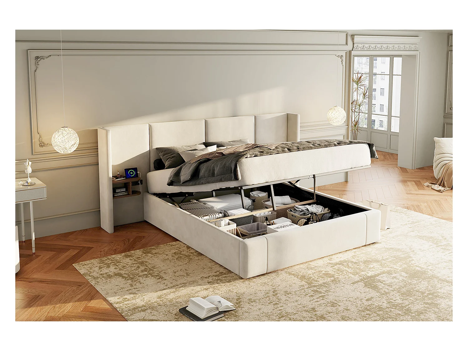 Lit coffre 160 x 200 cm avec grand tête de lit - 2 tables de chevet et port USB - Velours - Beige(sans matelas)