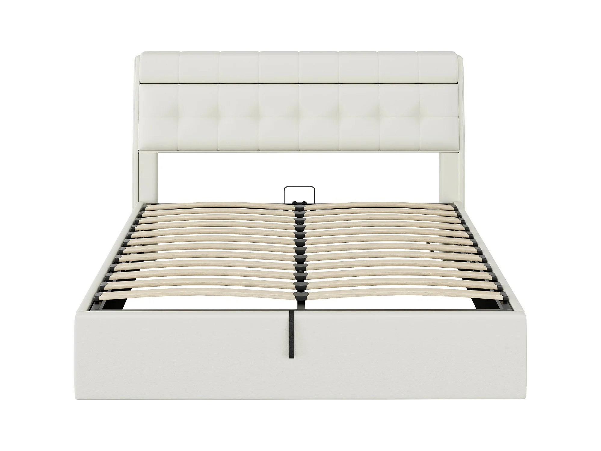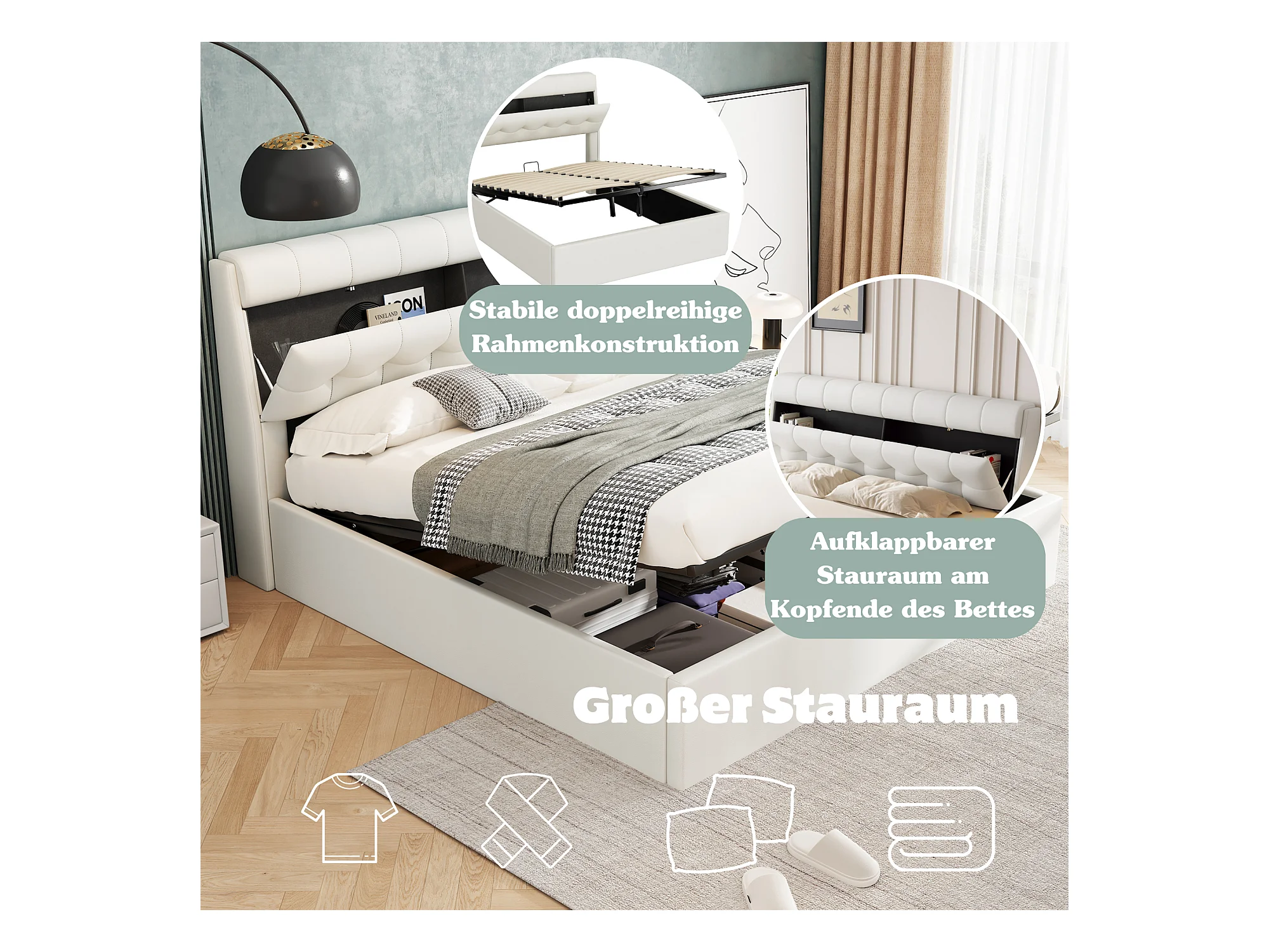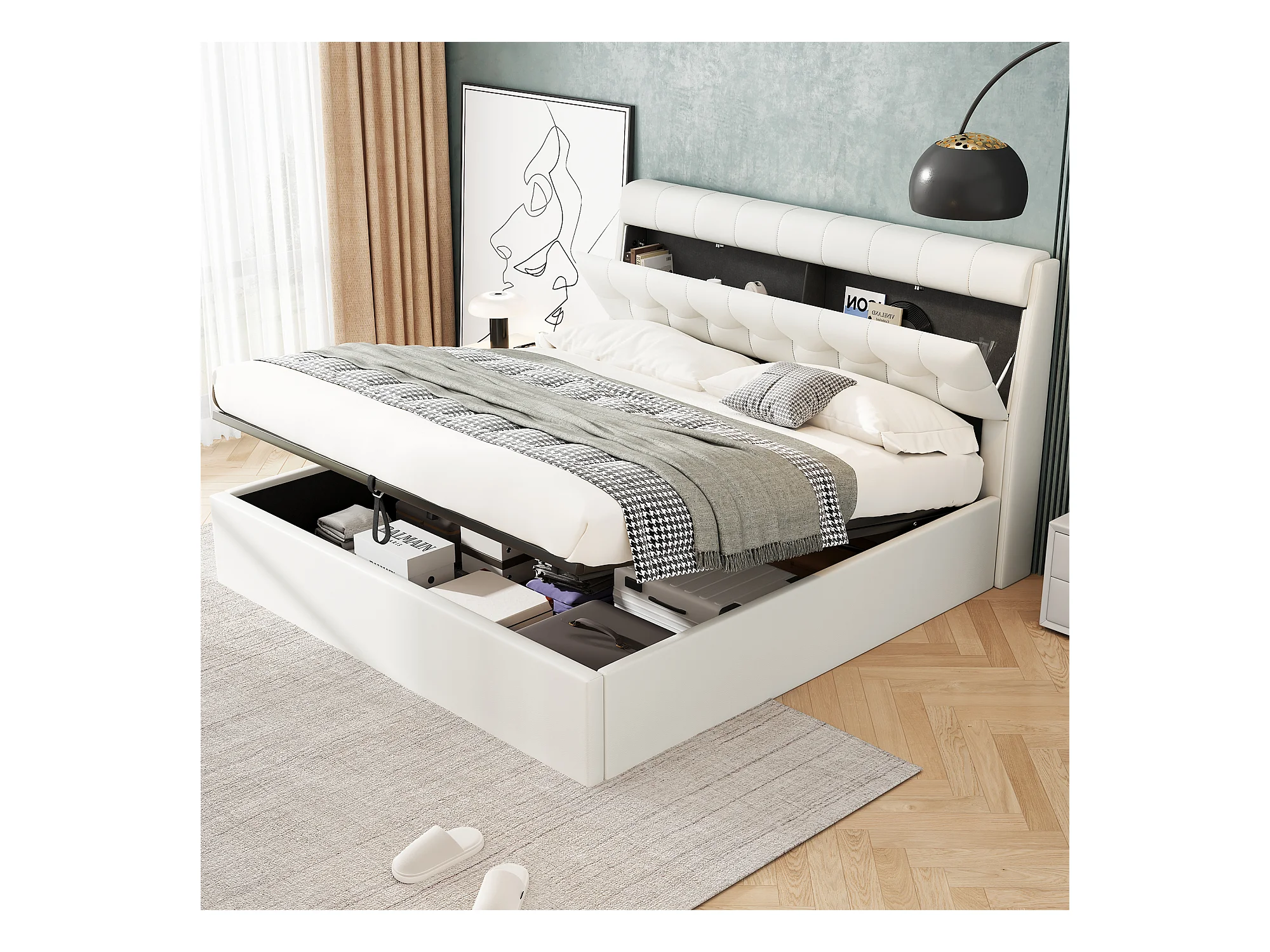 Lit coffre 160 x 200 cm avec tête de lit rangement - LEDs - Cuir PU - Blanc (sans matelas)