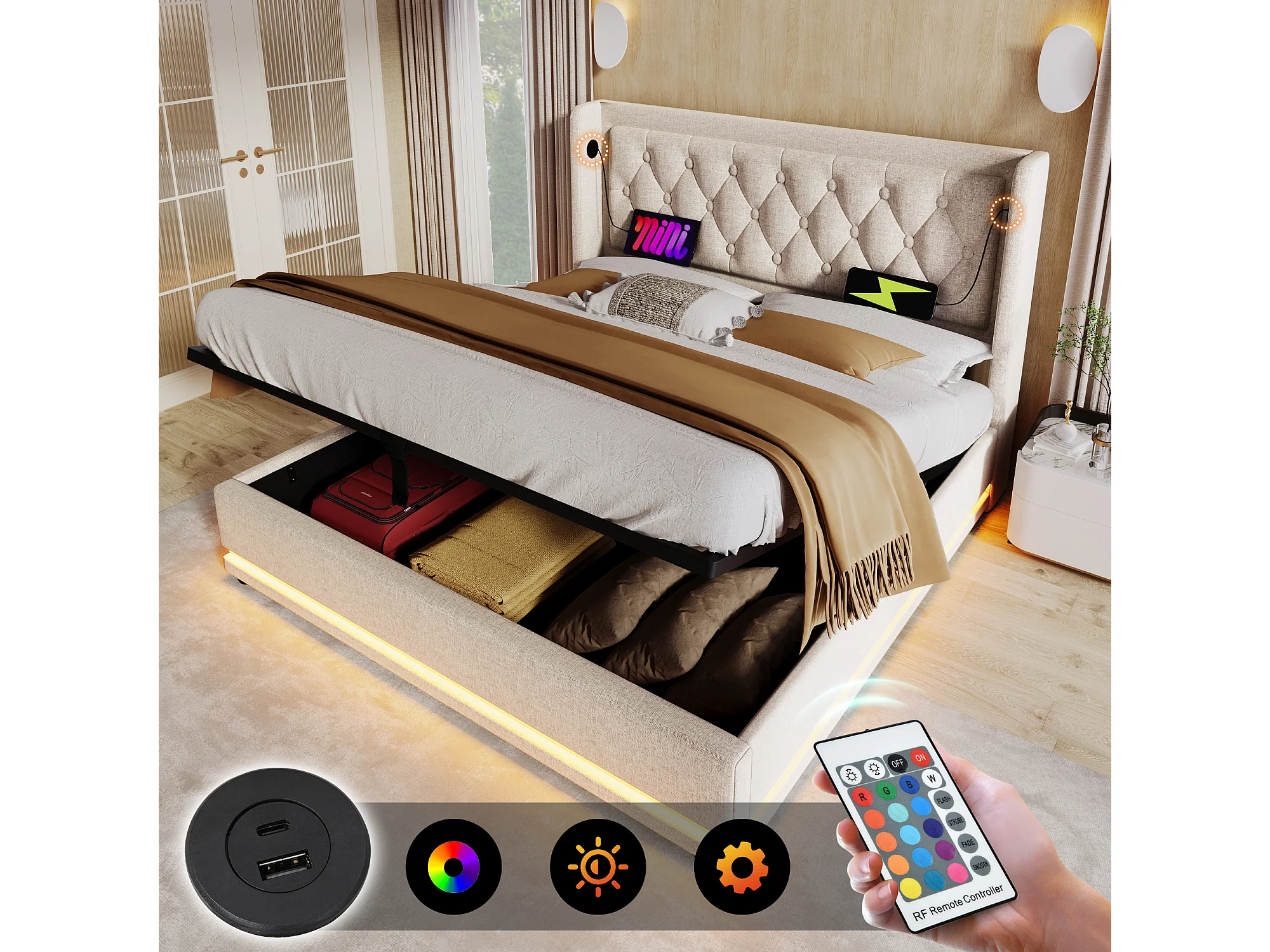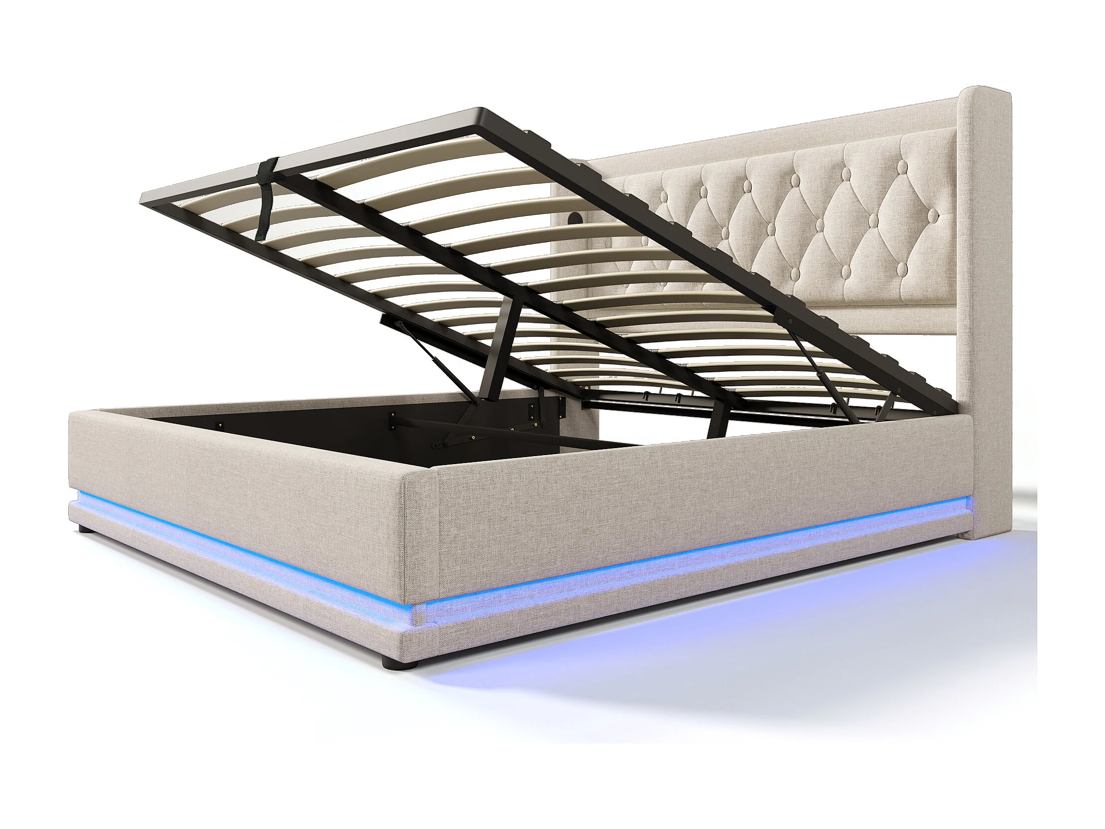 Lit coffre 160 x 200 cm, coton beige, Lit double avec LED et prise USB, sans matelas