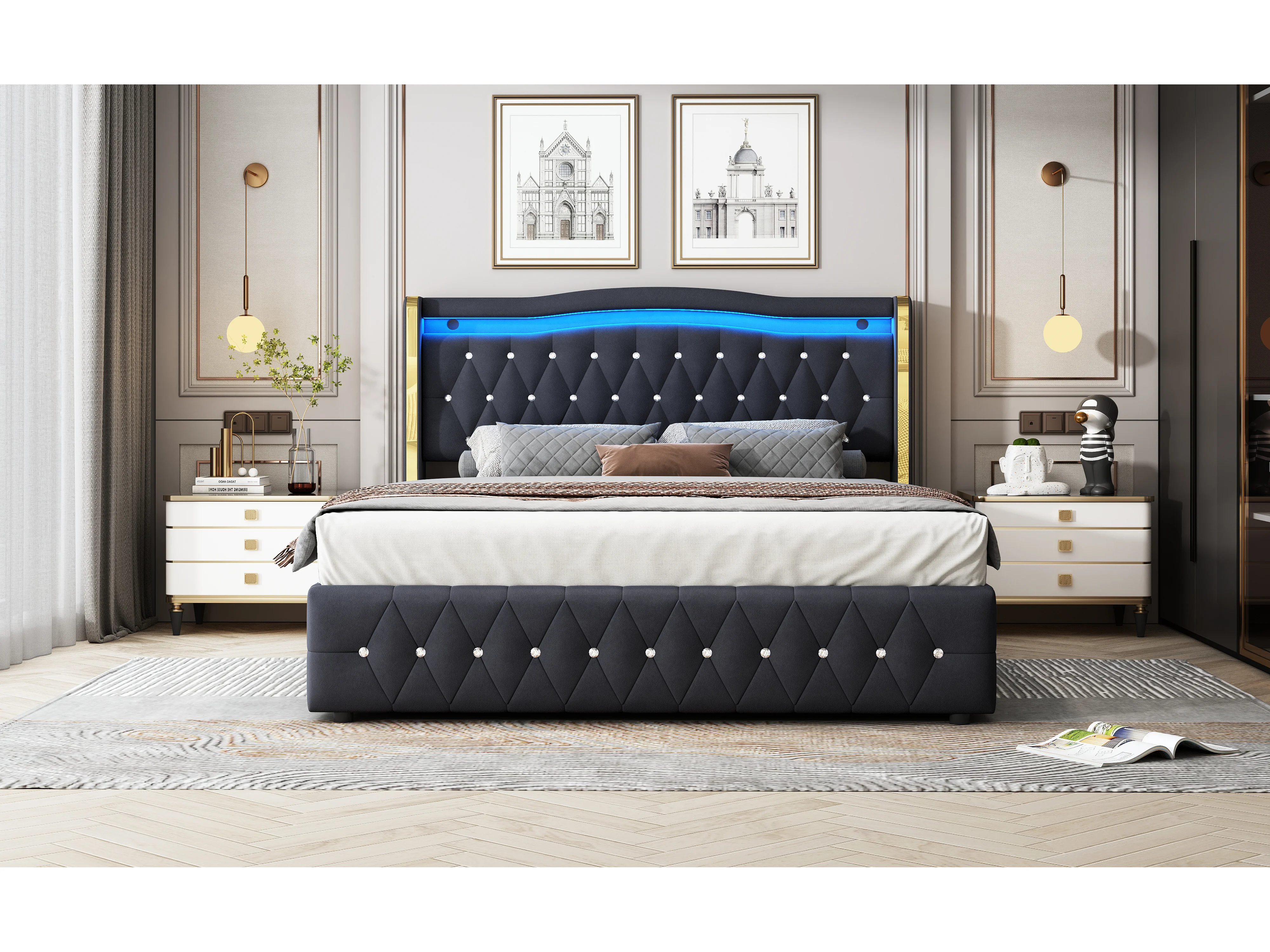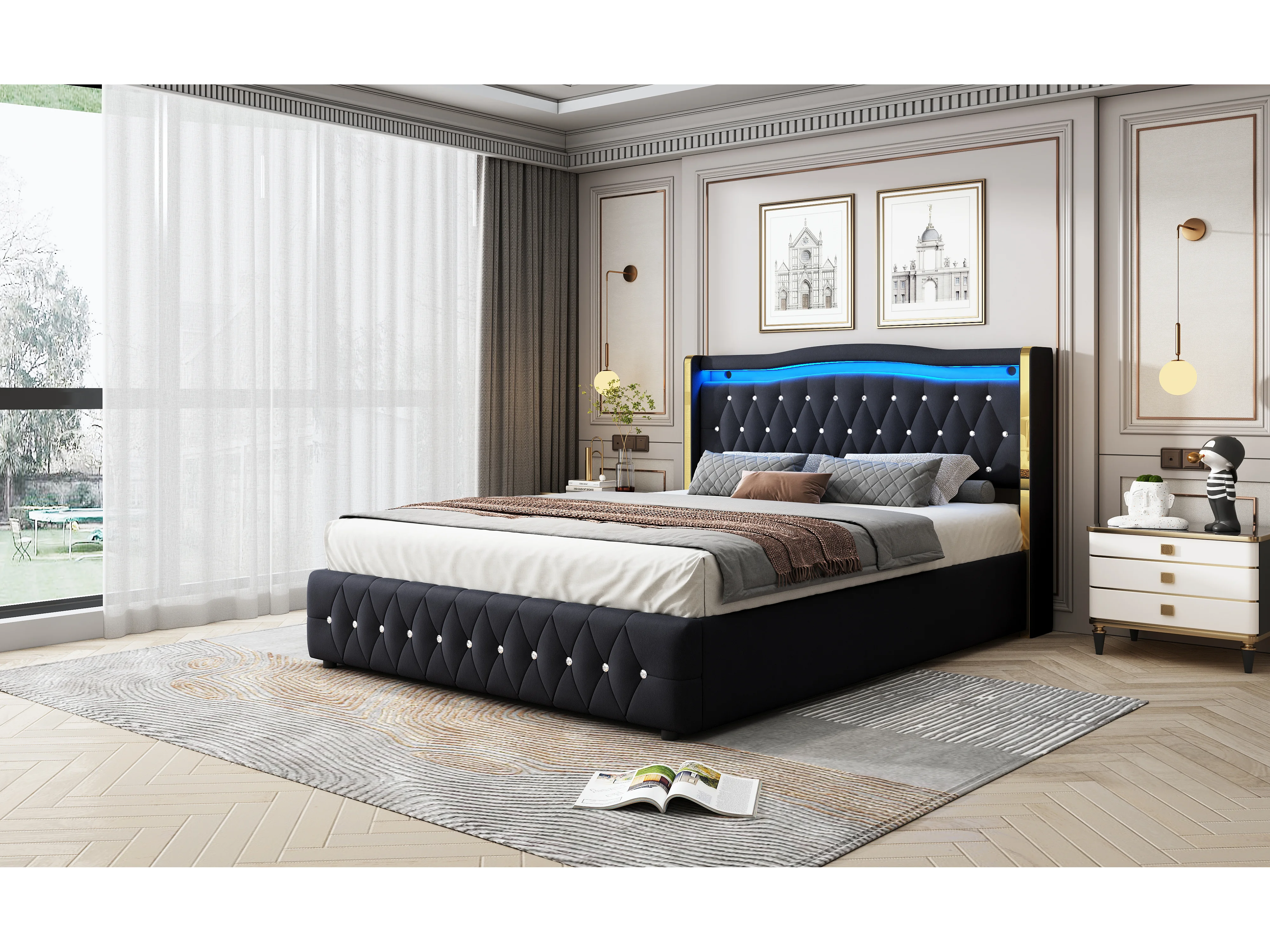 Lit coffre 160 x 200 cm tête de lit - LEDs - Velours - Décor avec losanges - Noir (sans matelas)